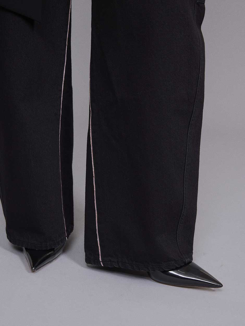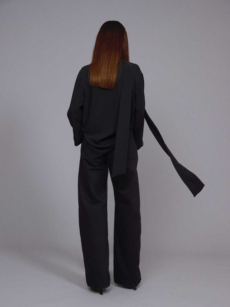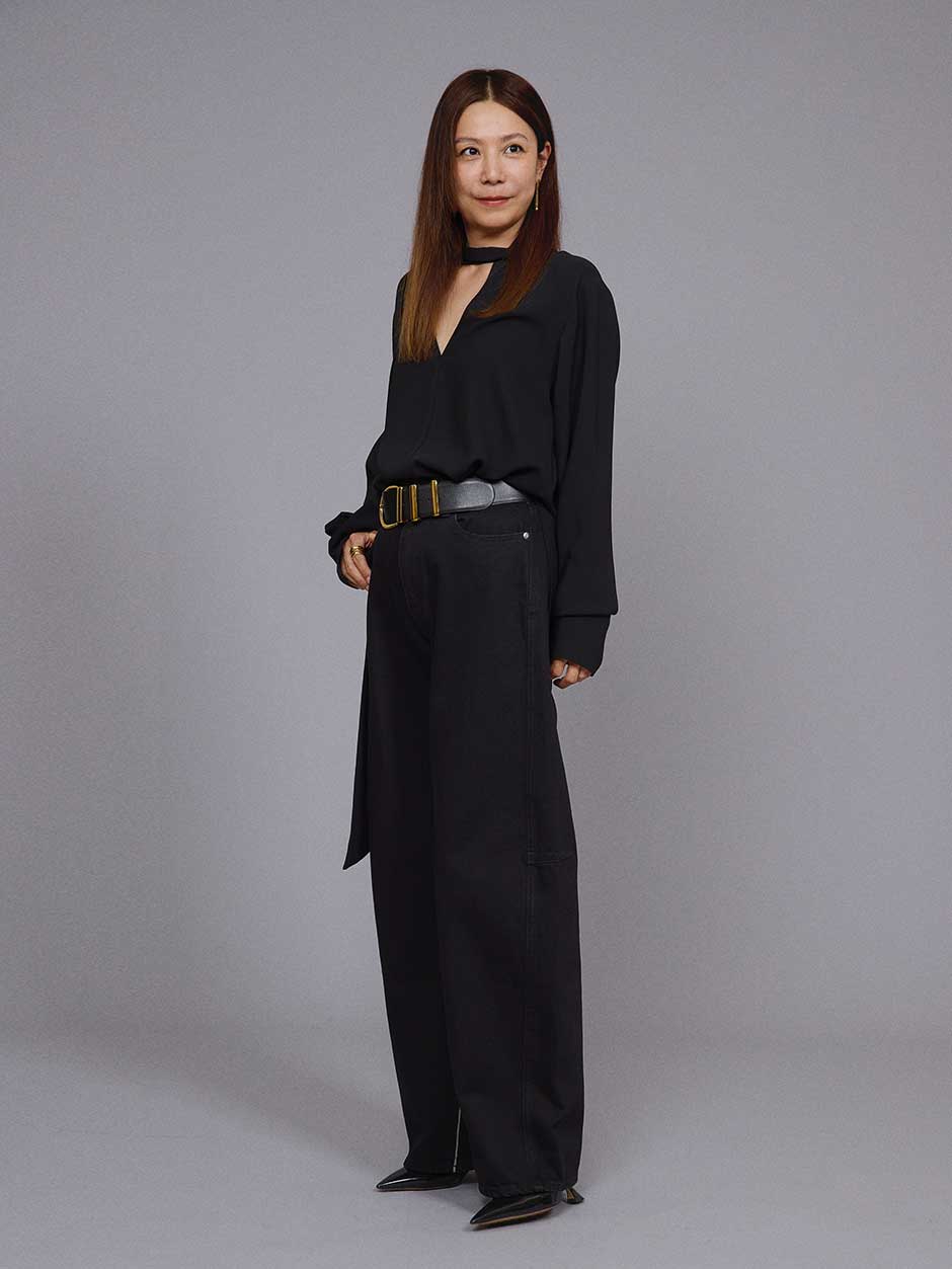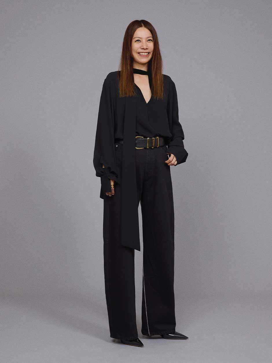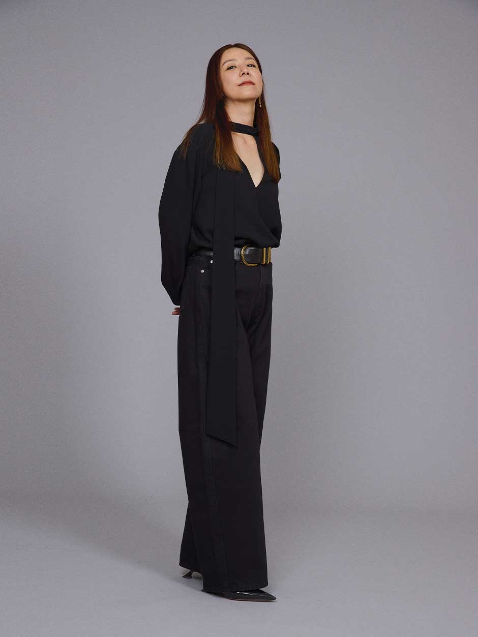 「キュッと結べばお仕事シーンに、ラフにさらっと巻けばディナーやちょっとしたパーティにも。このボウタイブラウスは、胸もとの空き具合を調節したりしてニュアンスをつくればオンオフ問わず活躍する一枚。素敵だけど普段着るのには難しいかも、と感じるブラウスが多い中、これは肌見せをしているけれど安心感もある」エレガントなタイブラウスを主役にしたオールブラックのコーディネートを披露してくれた管沼さん。シックなムードを程よくカジュアルダウンするのは、今季トレンドのワイドデニム。内側にセルヴィッチがあしらわれ、フロントだけでなくバックやサイドからも綺麗なシルエットが魅力だ。カジュアルなデニムスタイルもSA VILLE / SA VIEならモードに仕上がる。