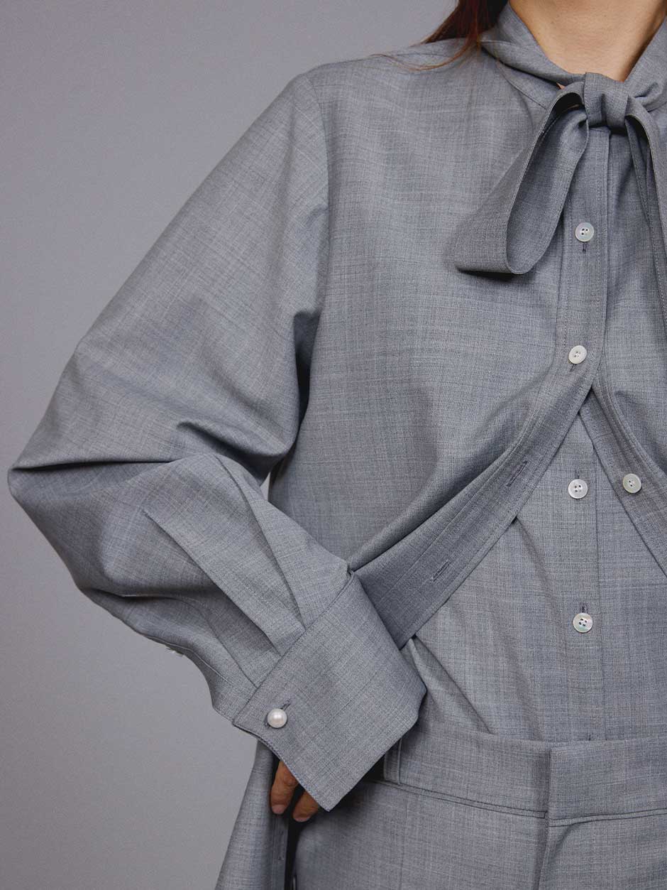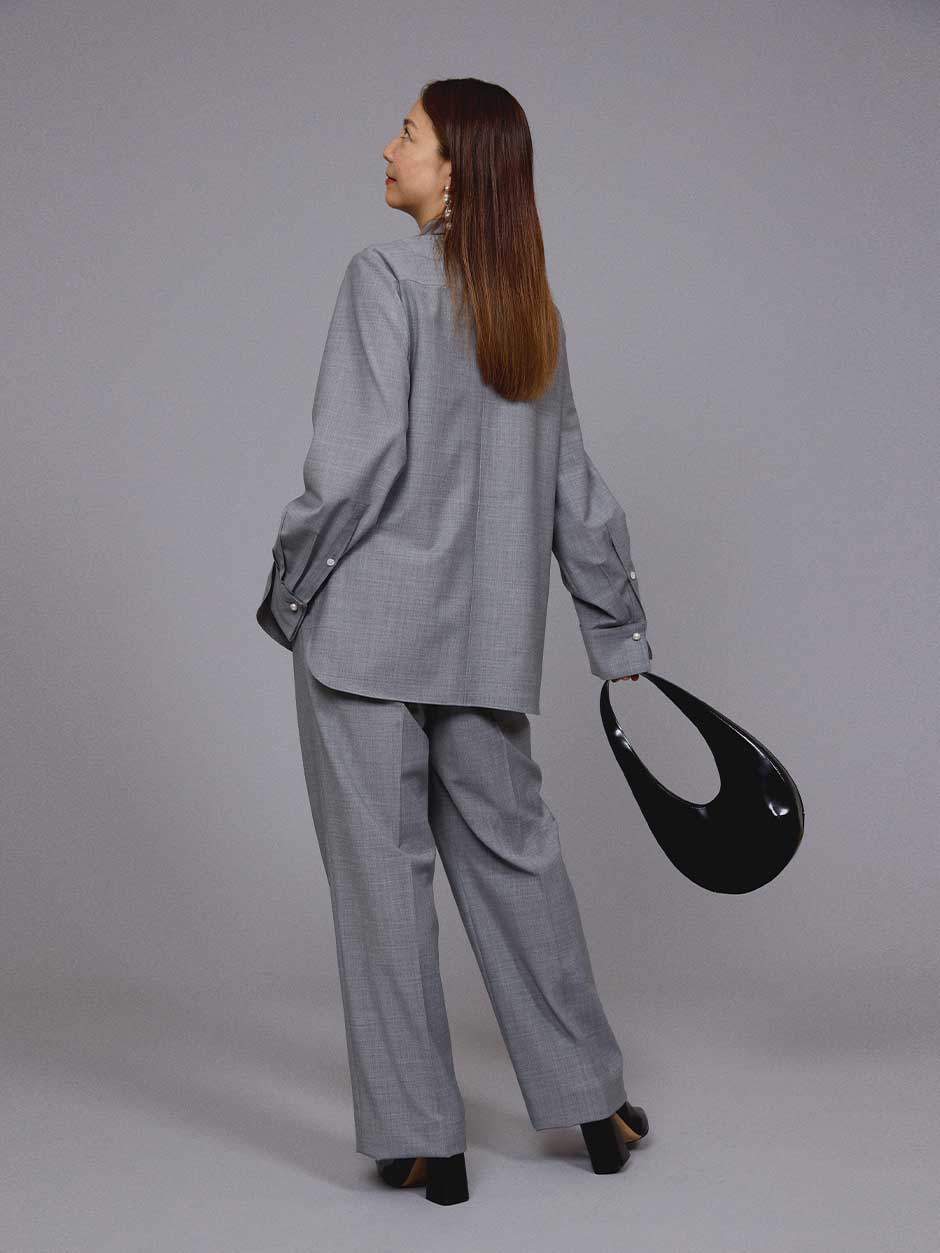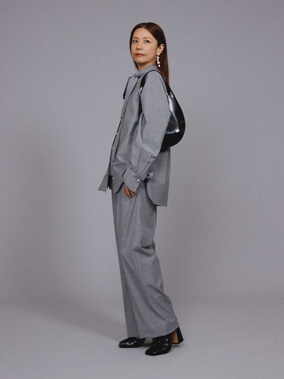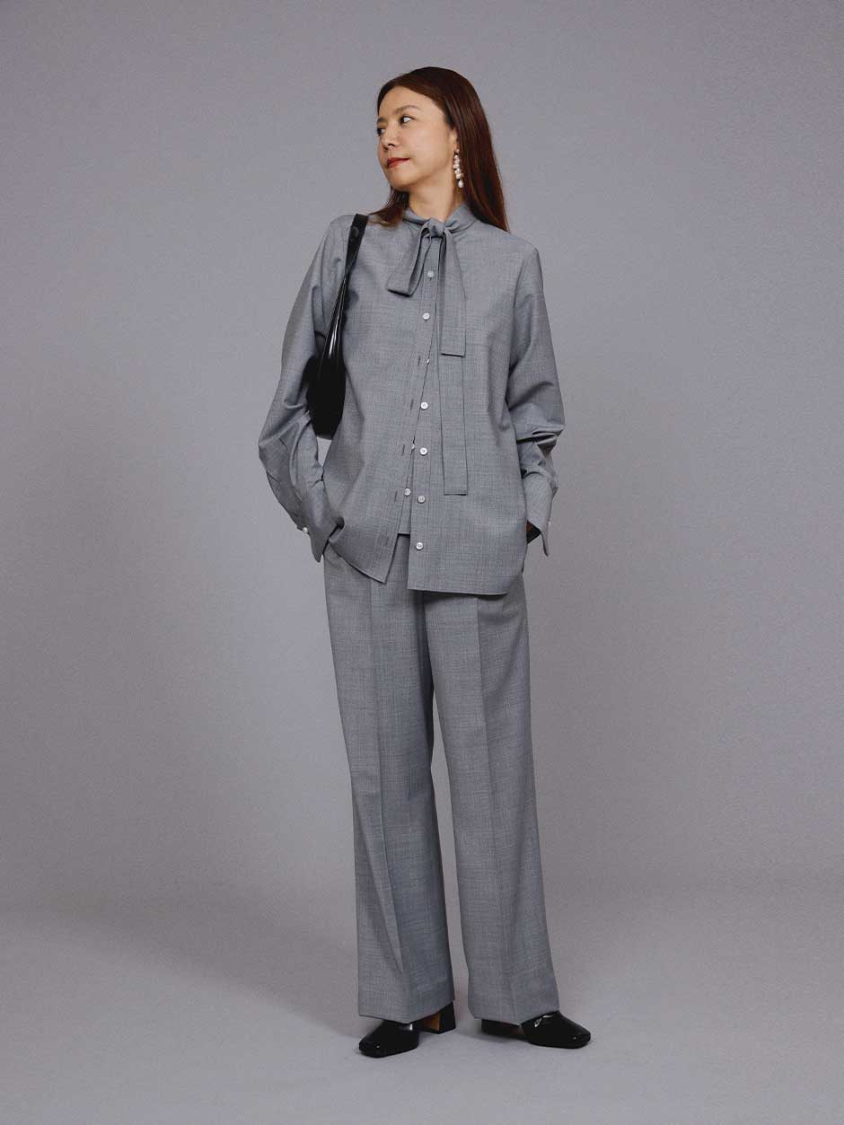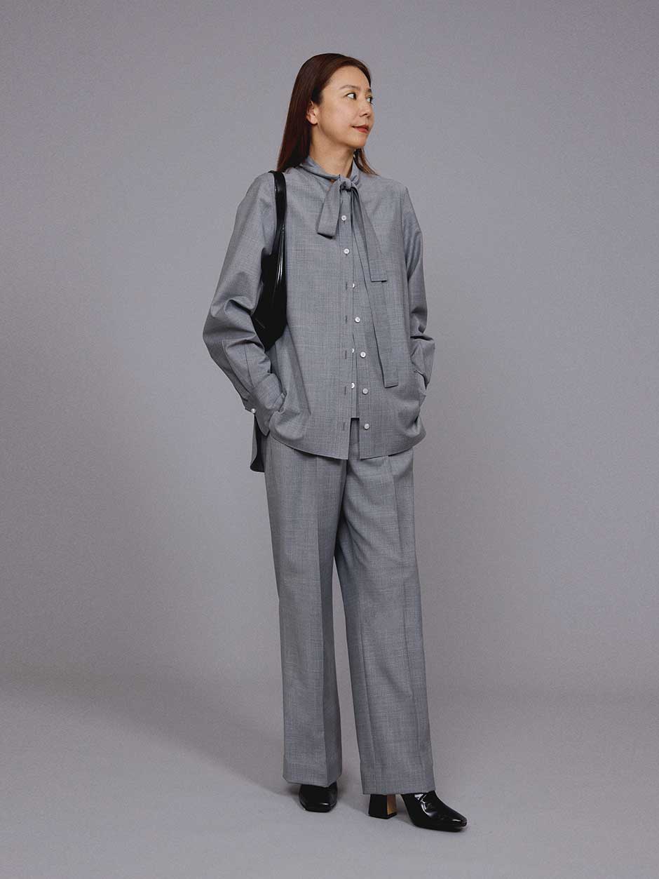 普段はあまりグレーを着ることはないという管沼さんだが、この日はシャツとストレートのパンツをセットアップ感覚で合わせたスタイルを楽しんだ。「やや青みのあるグレーで日本人の肌にも合う色合い。2枚仕立ての凝ったデザインなのでボタンの開閉でレイヤードのように着こなしたり、タイのアレンジで表情を変えたり。秋冬のおしゃれの幅を広げてくれるアイテムです。パンツは、さり気なくウエストの後ろ部分がゴム仕様になっているので履き心地も動きやすさも抜群!シルエットも美しくきちんと感はあるのに、パジャマみたいに楽なんです」仕上げにはトレンドのムーンシェイプのバッグを合わせ、コーディネイトに旬なムードをプラスした。
