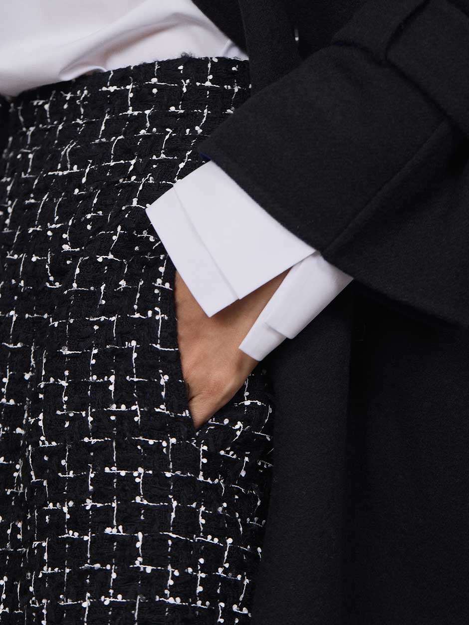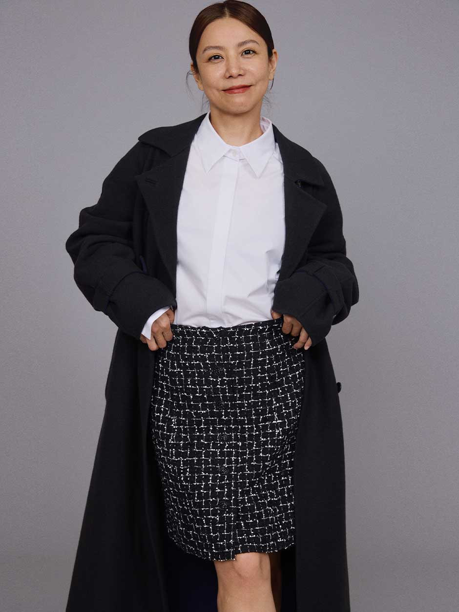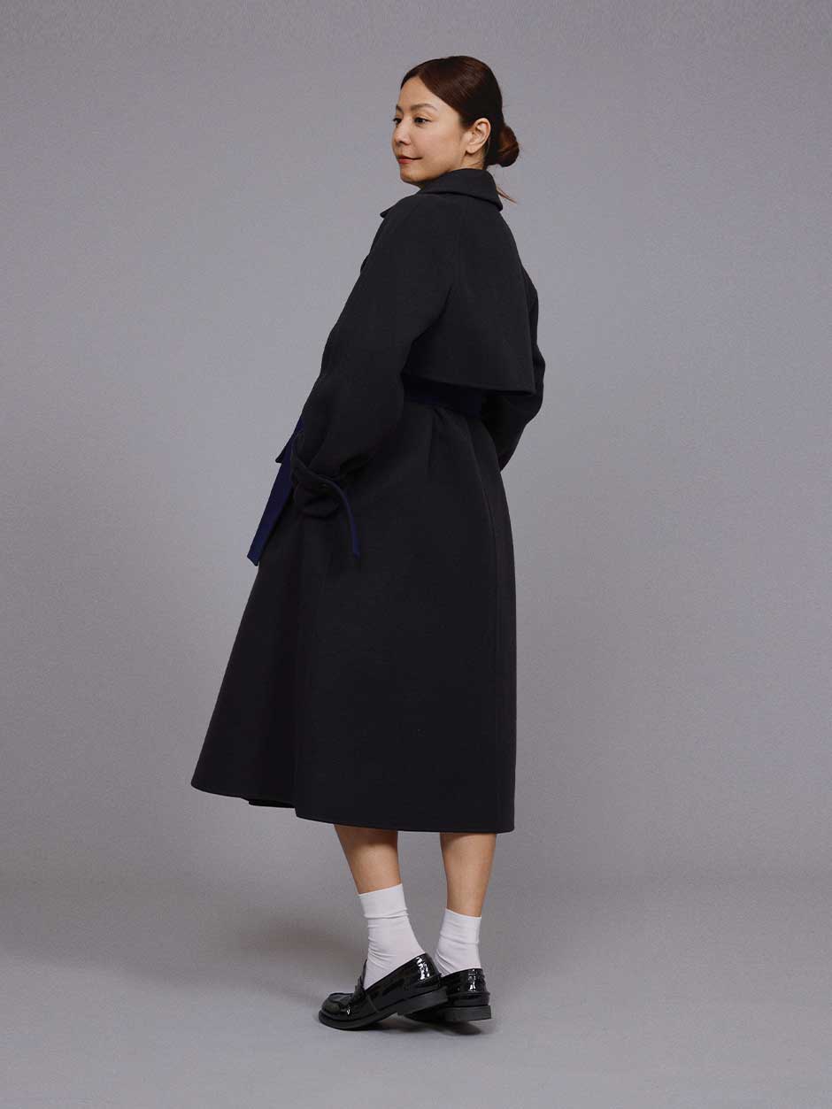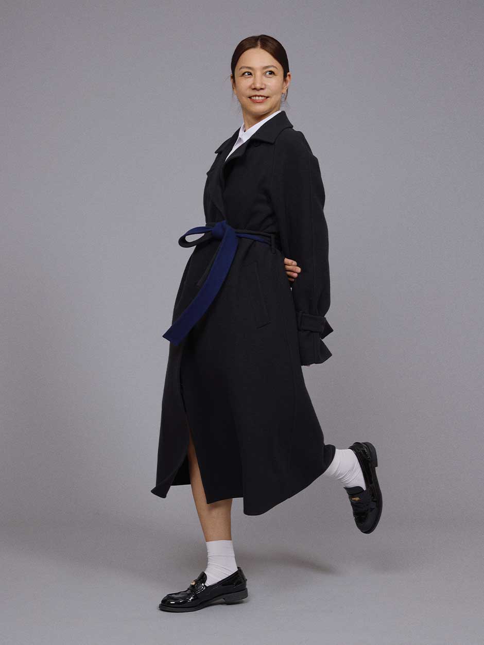 素材もシルエットも優しいウールのコート。襟の裏とベルトの裏面はロイヤルブルーで切り替えされ、さり気なく色のアクセントが効いたデザインだ。「ロイヤルブルーは私のラッキーカラー。ベルトを結んだ時に見えるブラックとのコントラストも好きなのですが、それをコート一枚で表現できてしまう遊び心に、おしゃれするモチベーションもアップします。重量感のあるリュクスな見た目ですが、着るとすごく軽くてあたたか。この冬はヘビロテしたいです」ハリ感のあるシャツは、襟が二重で取り外しが可能な「ありそうでなかった」デザイン。コートのボリューム感をすっきりと見せたいから、ボトムはミニスカートでフレッシュなバランスを心がけた。