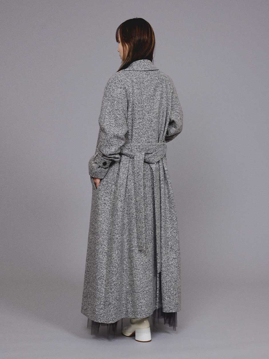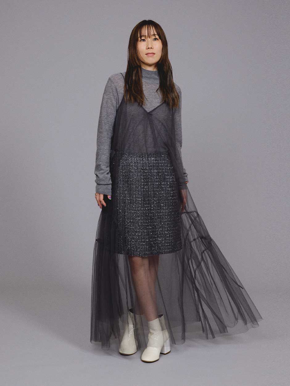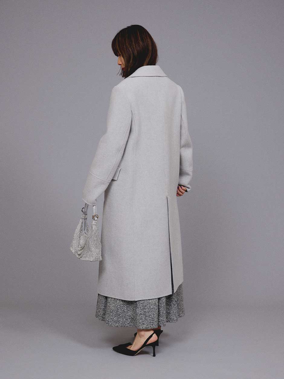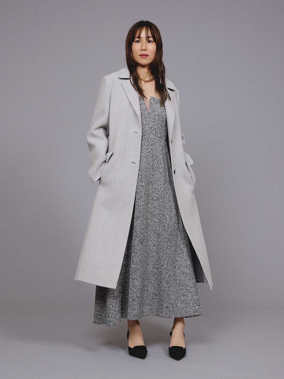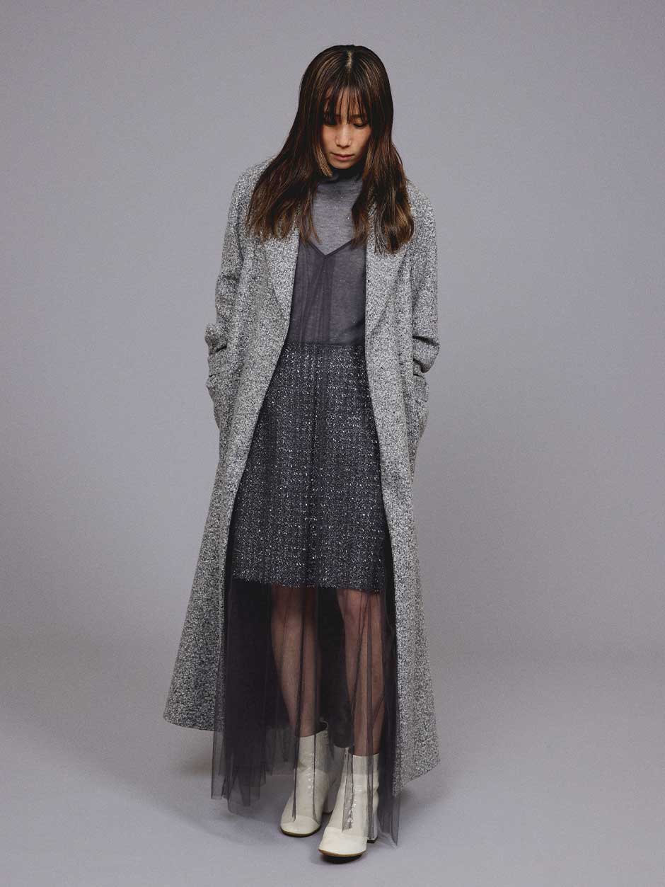 「この冬にトライしたいのは、グレーのワントーンスタイル。グレーが奏でる優しいハーモニーが好きなんです」と由田さん。ラメ入りのニットやツイードスカート、スパングルやチュールなど異素材をふんだんにミックスすることで、着こなしに心地よいリズム感が生まれる。ローブのようにボディを包むフルレングスのコートは、暖かさはもちろん、柔らかく軽やかな素材感も魅力。「素材が上質だからこそ、異素材のアイテムともすんなり馴染む。どんなコーディネイトもエレガントにまとめてくれます。寒い日のお出かけが楽しくなるような一着です」