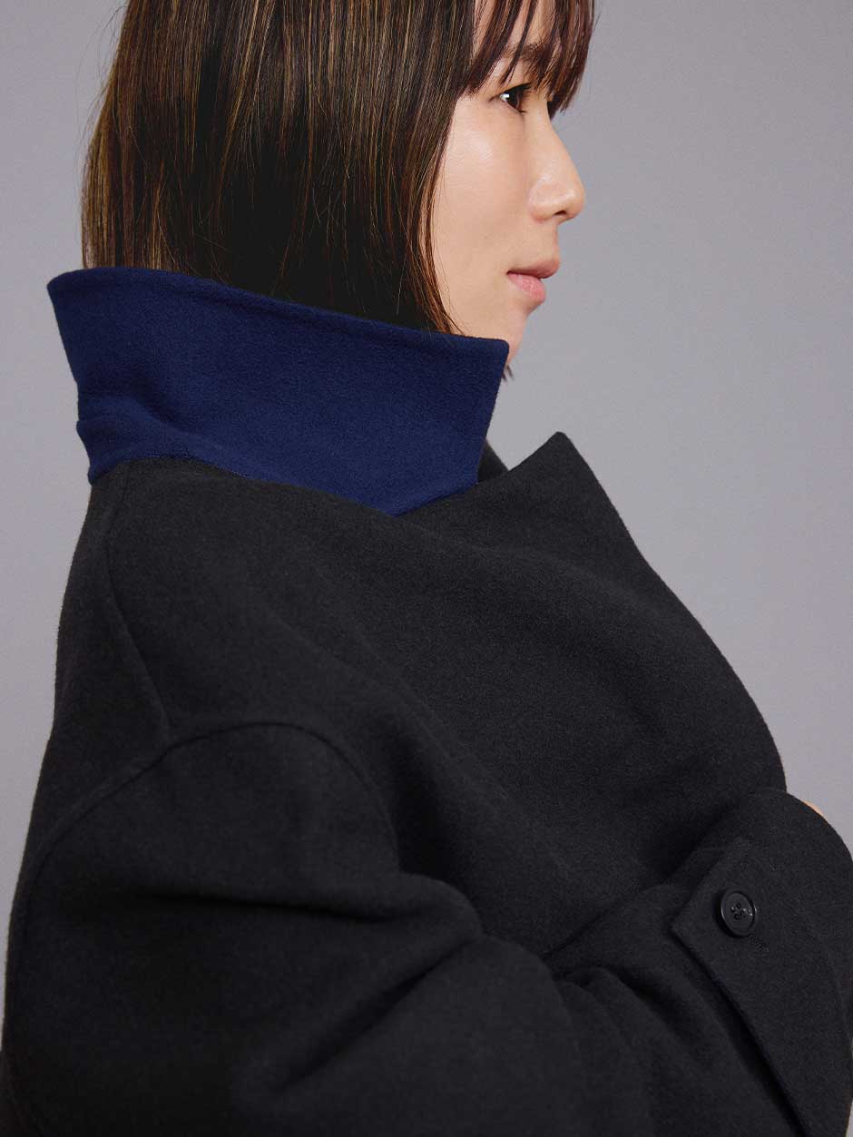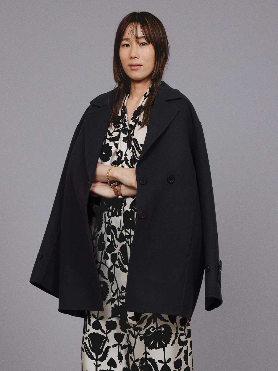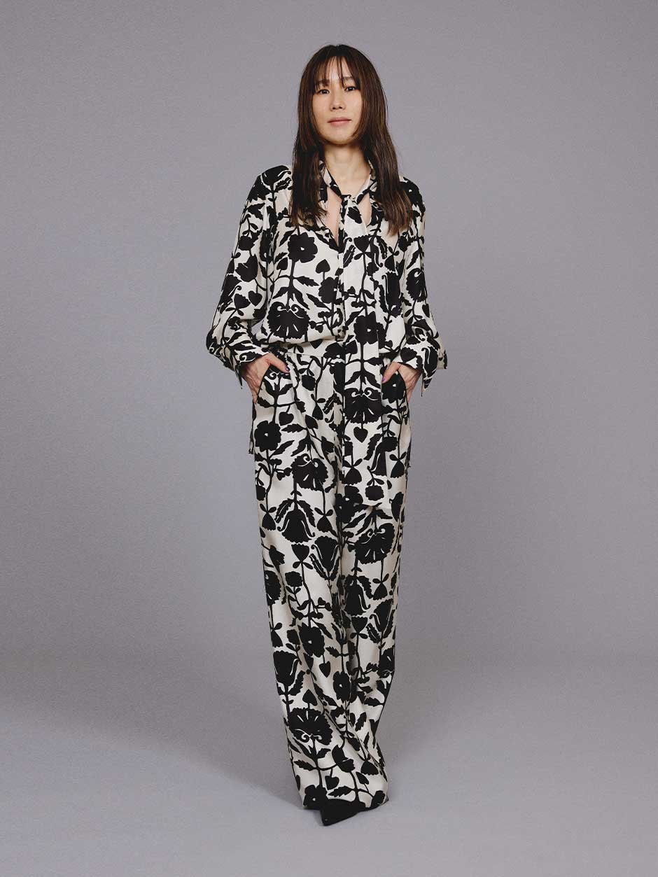 「目指す女性像は常に自然体のパリジェンヌ」と、大胆なフラワープリントのブラウスとパンツをチョイスした由田さん。こだわったのは引き算の美学。胸もとはあえて飾らず、ボウタイをラフに結びノンシャランなムードを演出した。「華やかなプリントもモノトーンならシックに。トップスとパンツは別々にも楽しめますが、ホリデーシーズンらしくセットアップ風のコーディネイトで華やかに。SA VILLE / SA VIEの服は、ポーズする時や袖を弛ませる時に、思うように調整できるのも大きな魅力。袖をまくった時にも落ちてこないよう丁寧にデザインされていると感じました」さらりと羽織ったウールのPコートは、肩周りを優しく包み込むボクシーなシルエット。リラックスしたサイズ感も今季のポイントだ。ブルーで切り替えされた襟の裏が、さりげなく大人の遊び心を演出する。