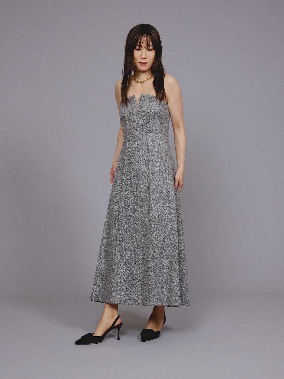 「普段はシューズやタイツで色をプラスするのが好きなのですが、このドレスはシルエットがとても綺麗なのでそれを活かすミニマルなスタイリングを心がけました」と、ライトグレーのドレス&コートで透明感のあるパーティスタイルを披露した由田さん。ダブルフェイスのチェスターコートで強調された縦長ラインがより洗練されたムードに。「今までオーバーサイズの服ばかり着ていたのですが、最近自分の体型に合うサイズの服を選ぶようになったことで、体重は変わってないのに「痩せた?」と聞かれることが多くなりました。SA VILLE / SA VIEの服はフィット感が抜群なので、身体のラインを美しく引き立ててくれるところが好きです」