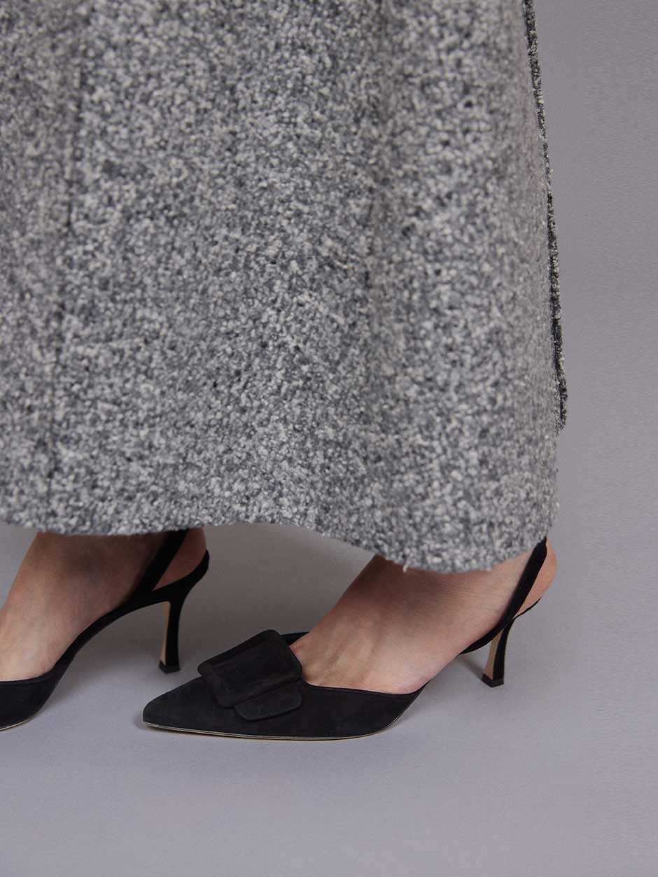 「バッグは、優しいライトグレーのカラーパレットと調和するシルバーをセレクト。スパングルの繊細な輝きがコーディネイトをより表情豊かにしてくれます」きらめきのアクセントをプラスして、ホリデーシーズンのオケージョンにもマッチするドレスアップスタイルが完成。