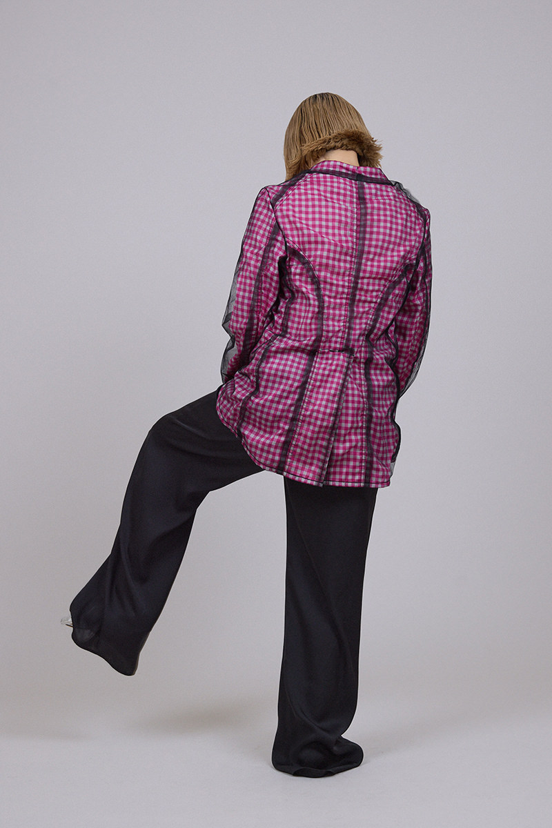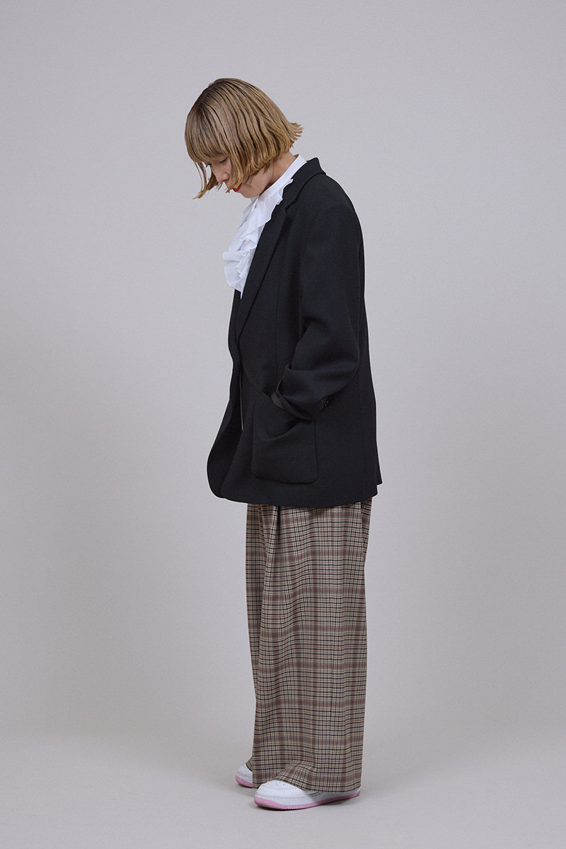 “落ち感のあるジャケットはフリルとも相性がいい。
