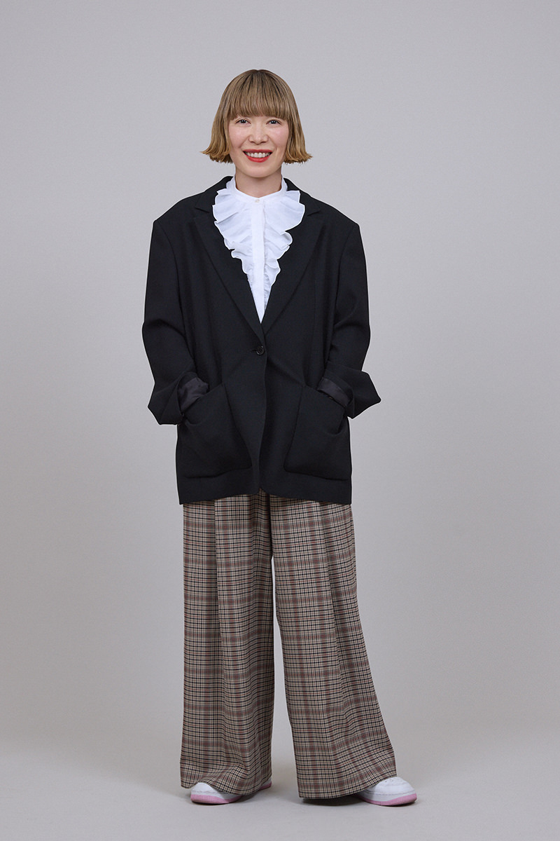 ボトムにはマニッシュなワイドパンツを合わせた山本さん。「このスタイリングは私の日常着の感覚です。メンズライクな服も好きなのですが、レディースがメンズ服を着るバランスが好きなので、そのままメンズっぽく着るというよりフリルのブラウスのようなフェミニンなアイテムを合わせたりします。足もともヒールだとよそ行き感が出るけれど、普段の私らしくスニーカーを合わせました」