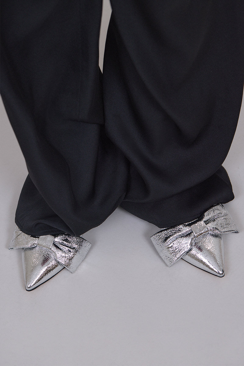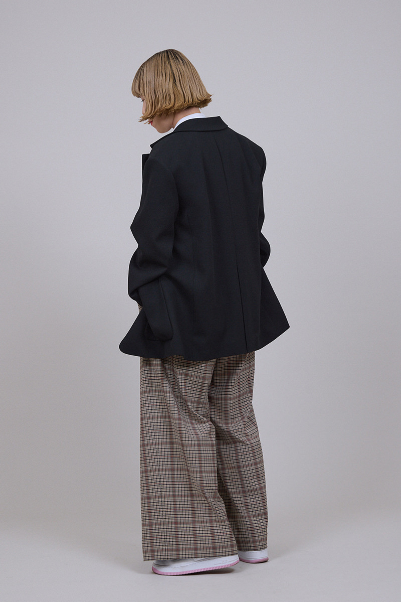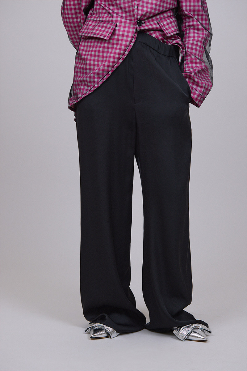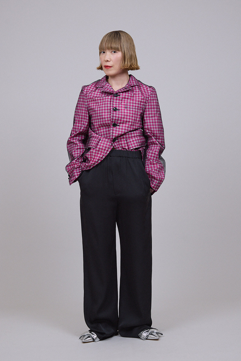 「遊びがある服を着たいし、年齢を重ねても服で遊びたい」と山本さん。テロンとした素材感が特徴のサテンパンツを、ギンガムチェックのジャケットとリボンがアクセントになったフラットパンプスで華やかにコーディネイトした。「おもちゃ気分をプラスした、ちょっとしたドレスアップのスタイルです。パンツがストンと落ちる綺麗なシルエットなので、遊び心のあるアイテムを合わせても、大人の女性のおしゃれが成立すると思います」。そんな山本さんのおしゃれのモットーはズバリ、楽しむこと。「毎日違う格好をします。着回しはしますが、前の日と同じ服は着ないのがルール」。では、このパンツを異なるスタイリングで楽しむなら?「綺麗めに着こなすよりも、ちょっと崩したい。よりデイリーに着るのなら、厚手のスウェットやメンズのトレーナーを合わせたいですね」