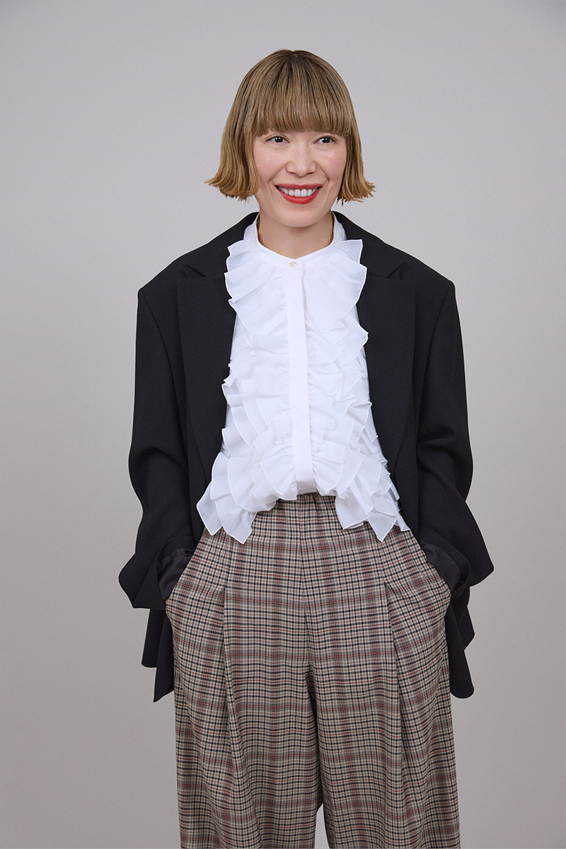 フリルのブラウスは自身の定番アイテムだという山本さん。「Tシャツ感覚で着ています。今回はボリューム感と素材のハリ感を生かしたくて、ウエストの直線的なラインに被せるようにインしました。合わせたジャケットは、落ち感のある素材でフリルとも相性がいい。サラッと気軽に着れる、けれど確実に綺麗になれる一着ですね」。遊び心のある服が好きだと語る山本さんに、SA VILLE / SA VIEの印象を聞いてみた。「大人のためのきれいな服という印象だったので正直自分とは遠いブランドだと思っていたのですが、私のワードローブにもしっくり馴染む。季節を問わず、いろいろとコーディネートが膨らみそうです。ブラウスはオールシーズン使える万能アイテム。冬だったら上にロングのカーディガンを羽織ったりして着こなしたいですね」