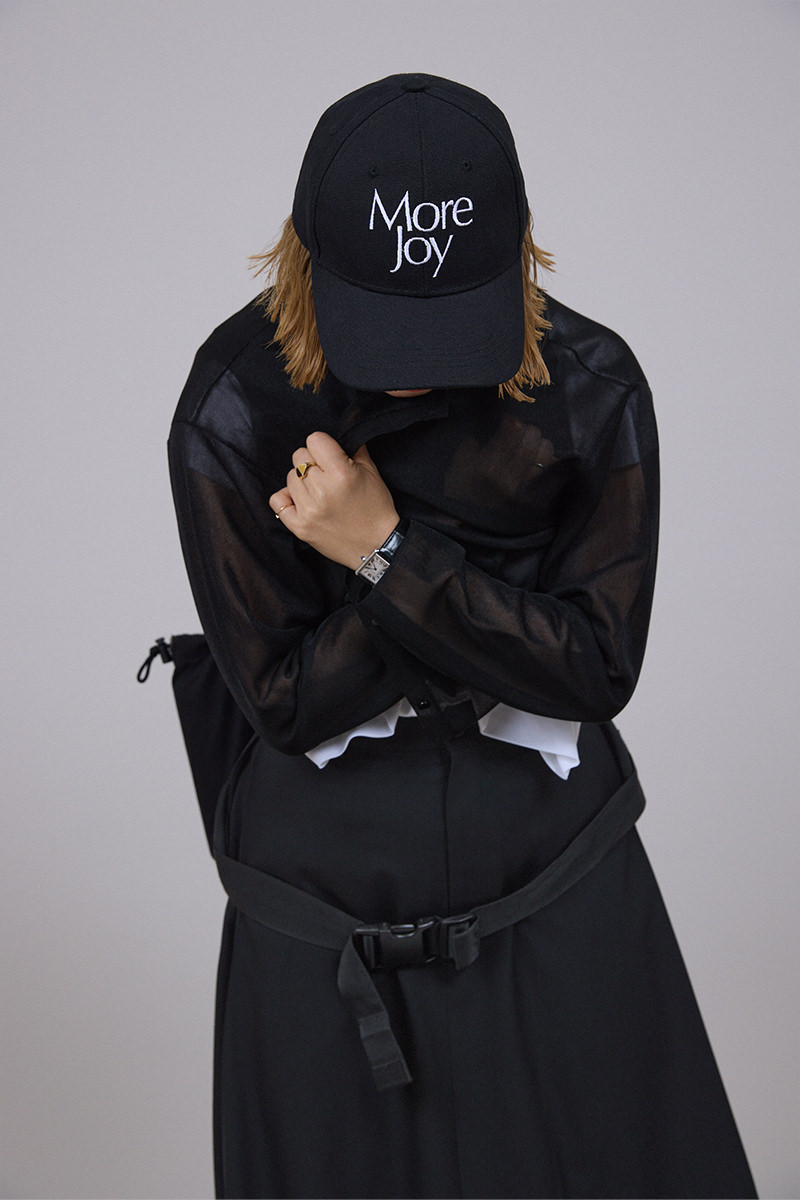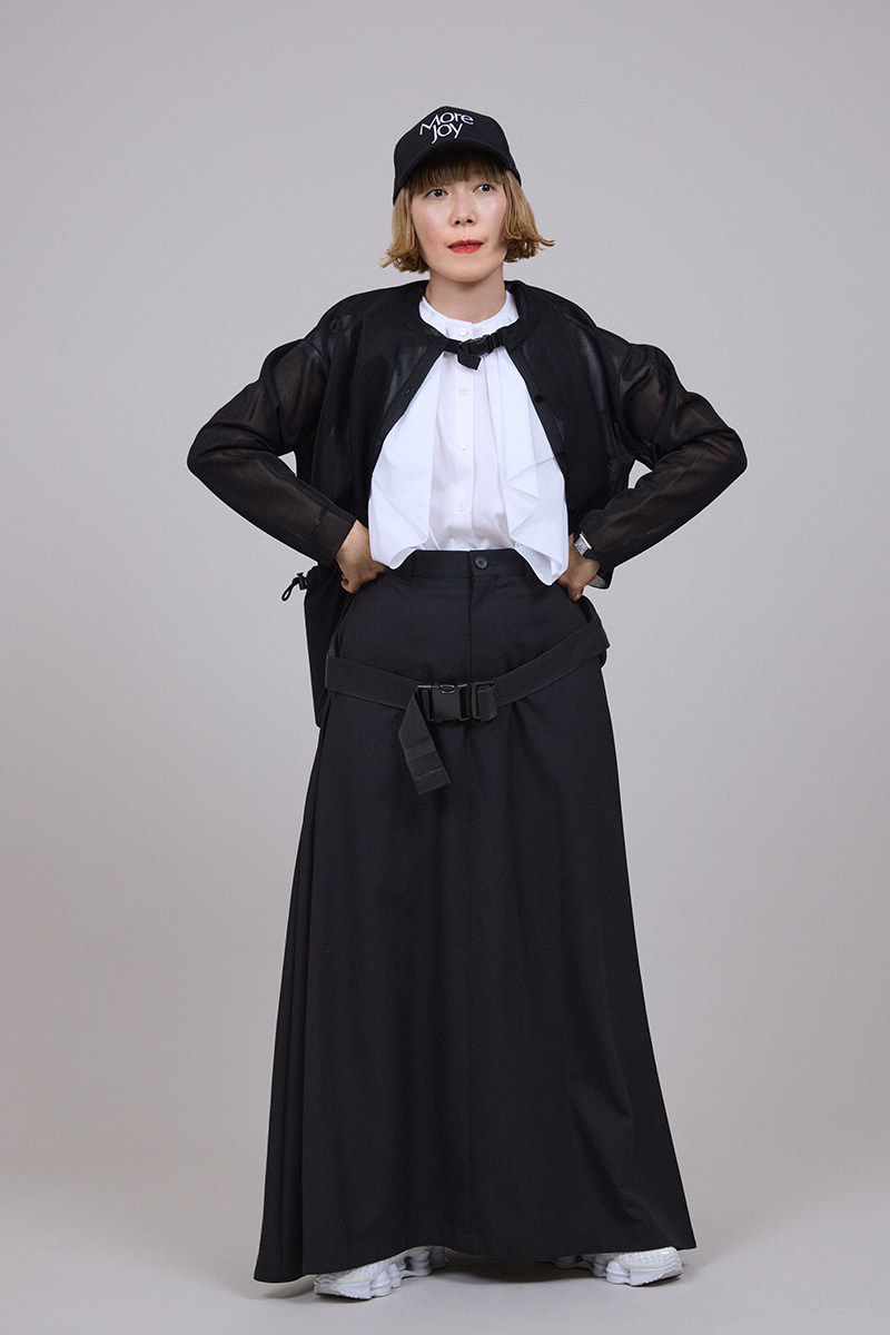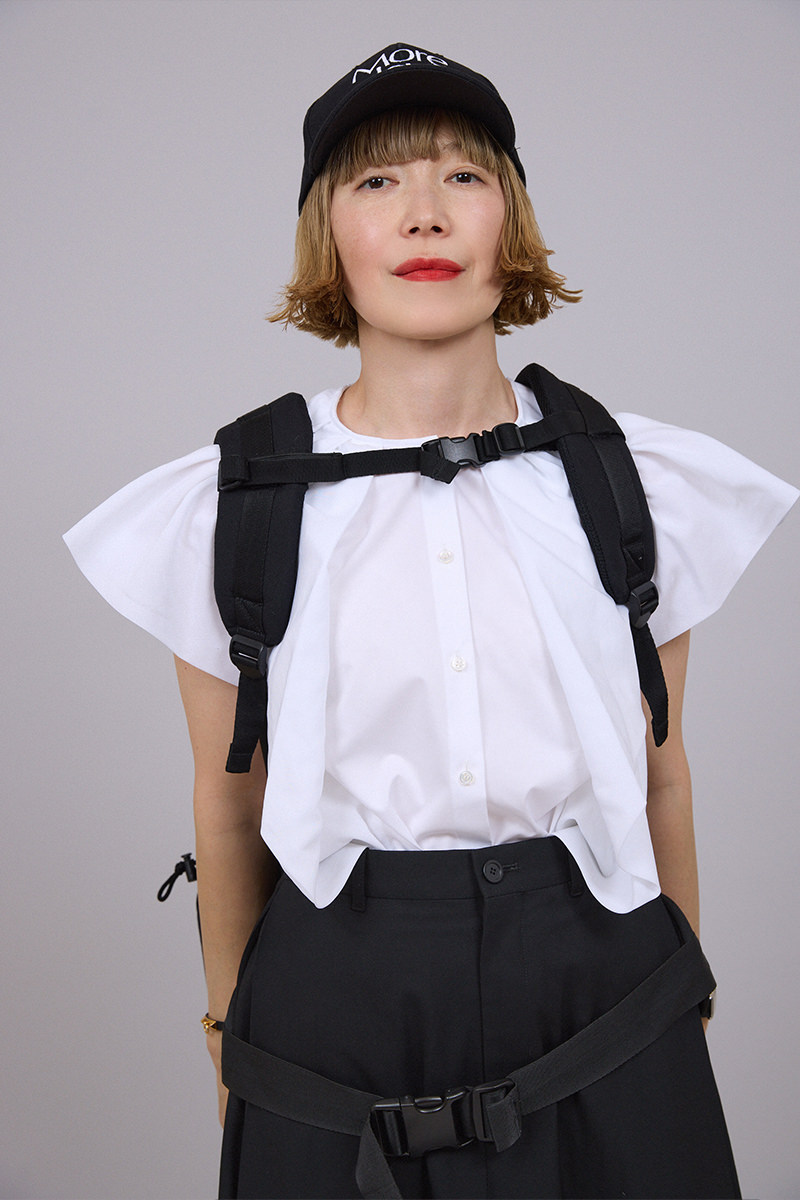 「フェミニンなブラウスにもスポーティなものが意外と合うんです」と、山本さん。肩周りを優しく包み込むシルエットが特徴のブラウスに、メンズ小物でカジュアルな味付けをした。「腕を出すことには抵抗があるのですが、ロングスカートでボトムのバランスを下げれば全体のバランスがよく見えるので、気持ち的にも取り入れやすくなります」。今回初めてSA VILLE / SA VIEの服を着てみた山本さんにその感想を尋ねてみると?「私のように遊びがある服を好む人でも、難しく考えないで手持ちのアイテムとのスタイリングが思い浮かんだし、こういう着方をしたいな、というアイディアも次々と湧いてきたんです。服って腕を通すことが大事なんだということを改めて実感しました。スニーカーにも合うし、色んなスタイリングを幅広く受け入れてくれるブランドですね」