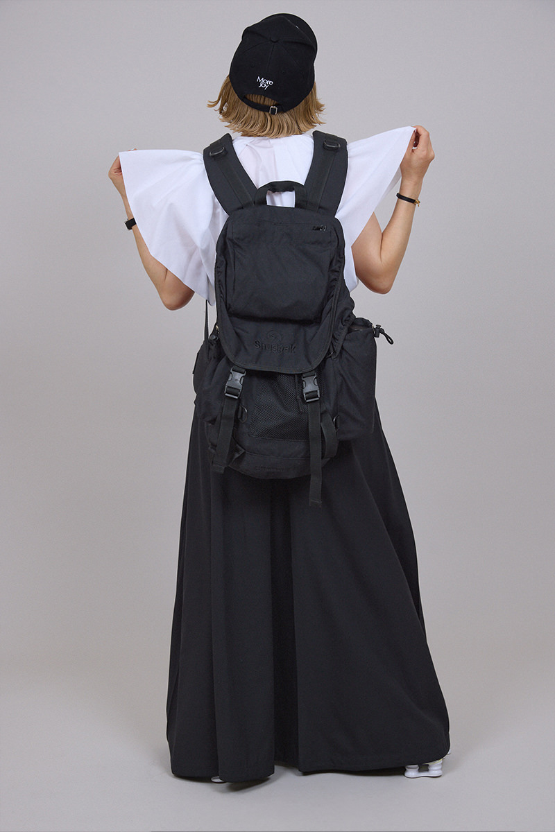バックパックのウエストベルトさえも、スタイリングのアクセントとしてしまう山本さん。「小さいバッグに憧れはありつつも、荷物が多いのでどうしても小さくできないんです。『荷物のためにしかたなく』ではなく、おしゃれな気持ちを大事にして選んでいます」。大好きなカラーであるピンクをソックスに忍ばせて、モノトーンスタイルだって自分らしく遊ぶ。