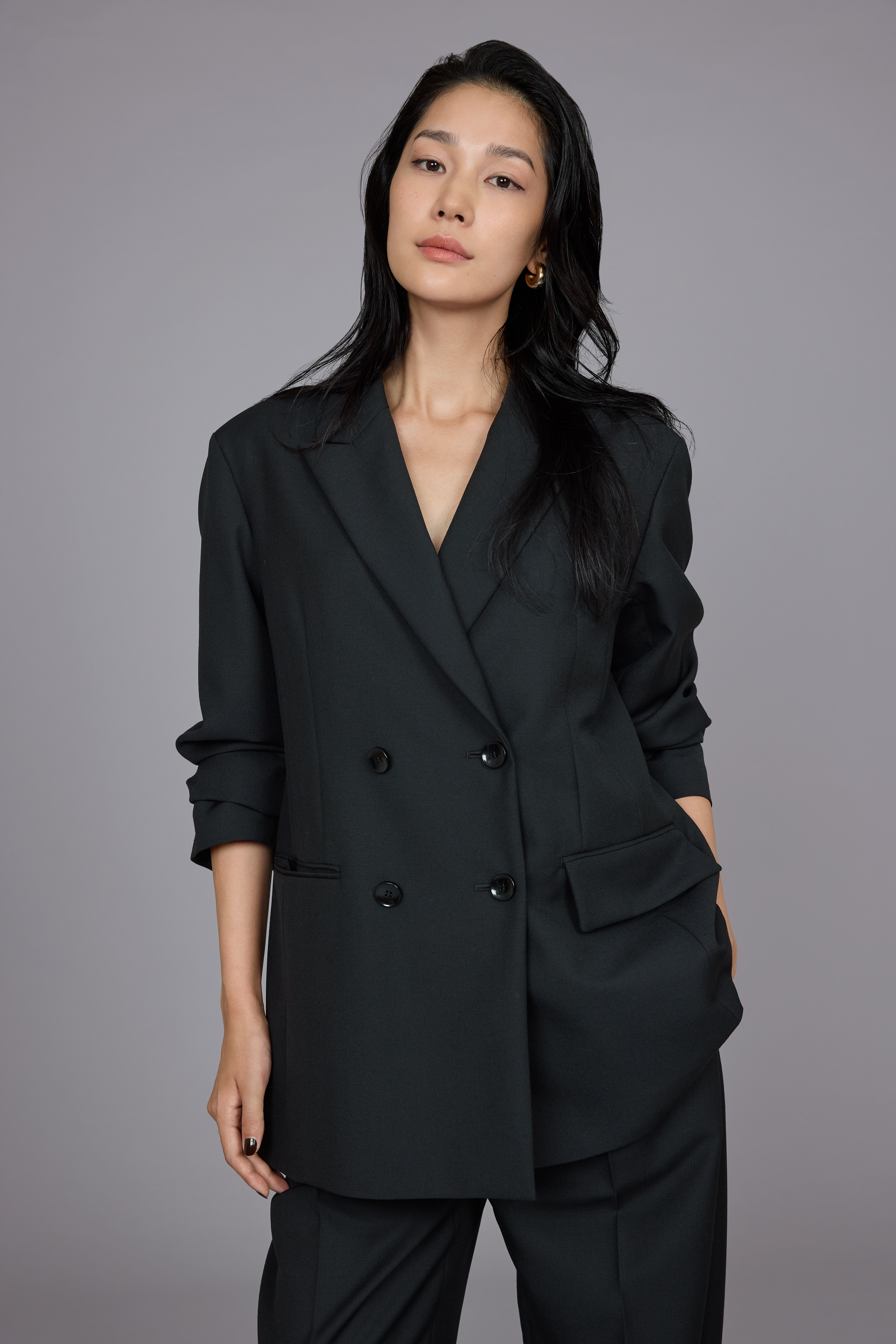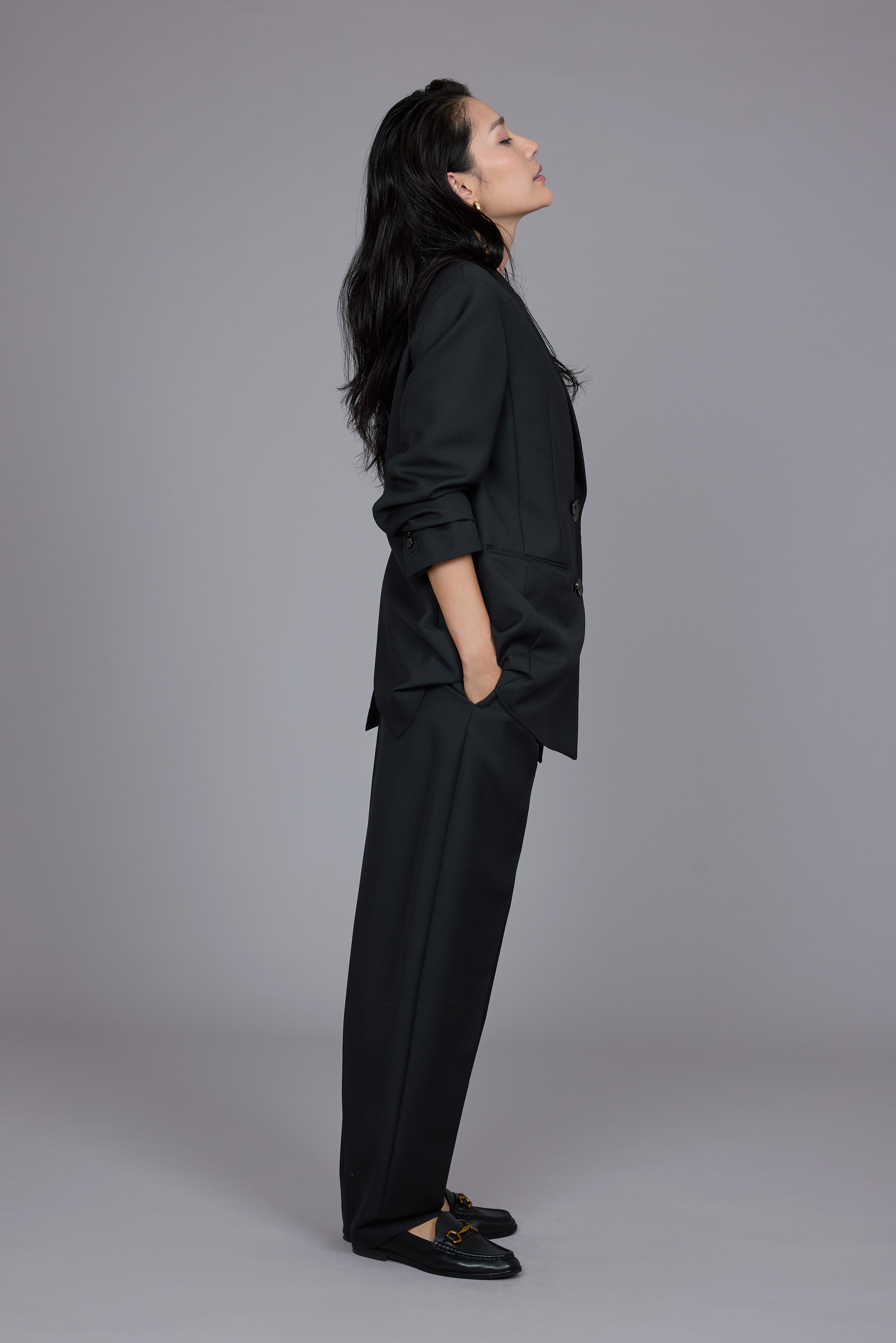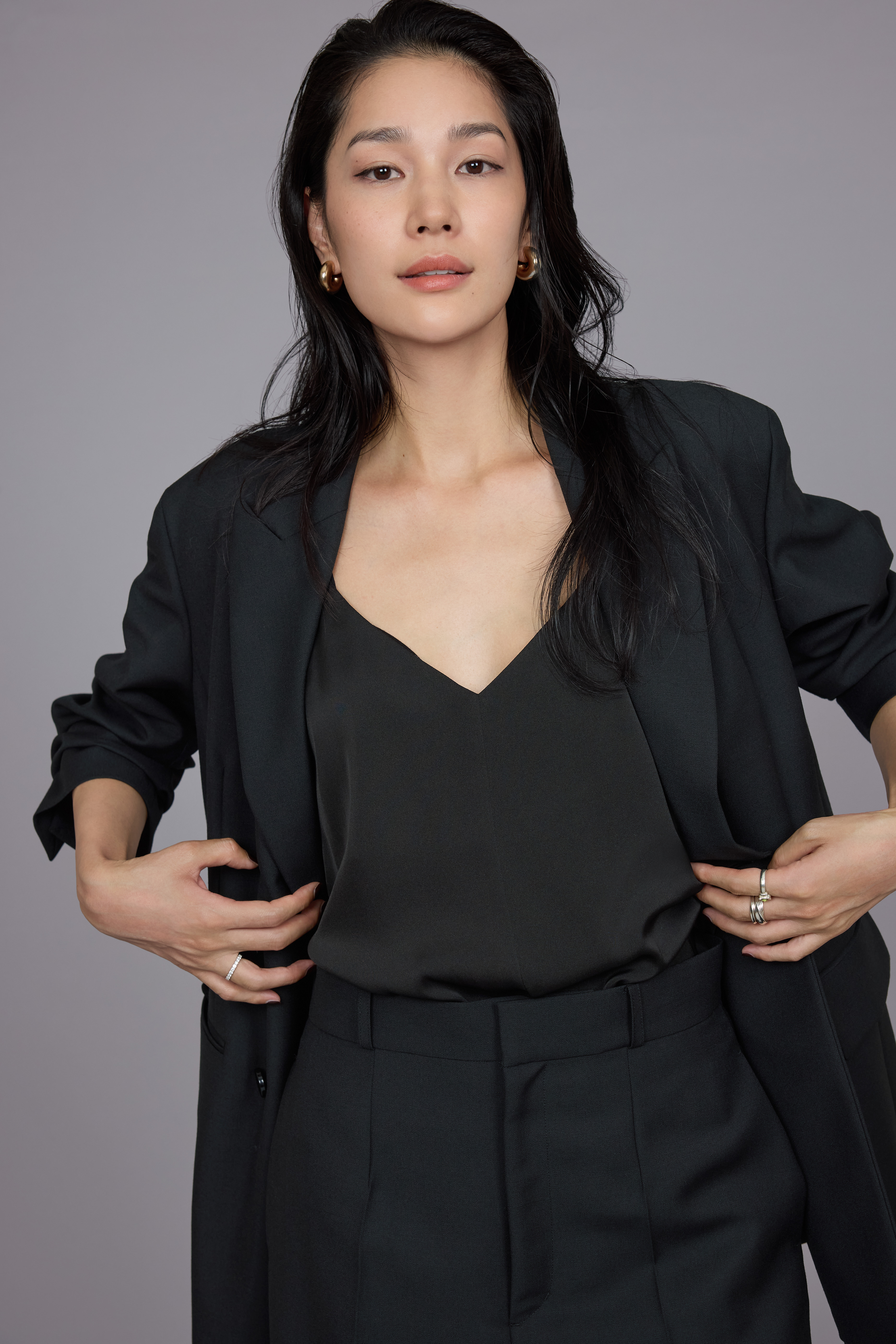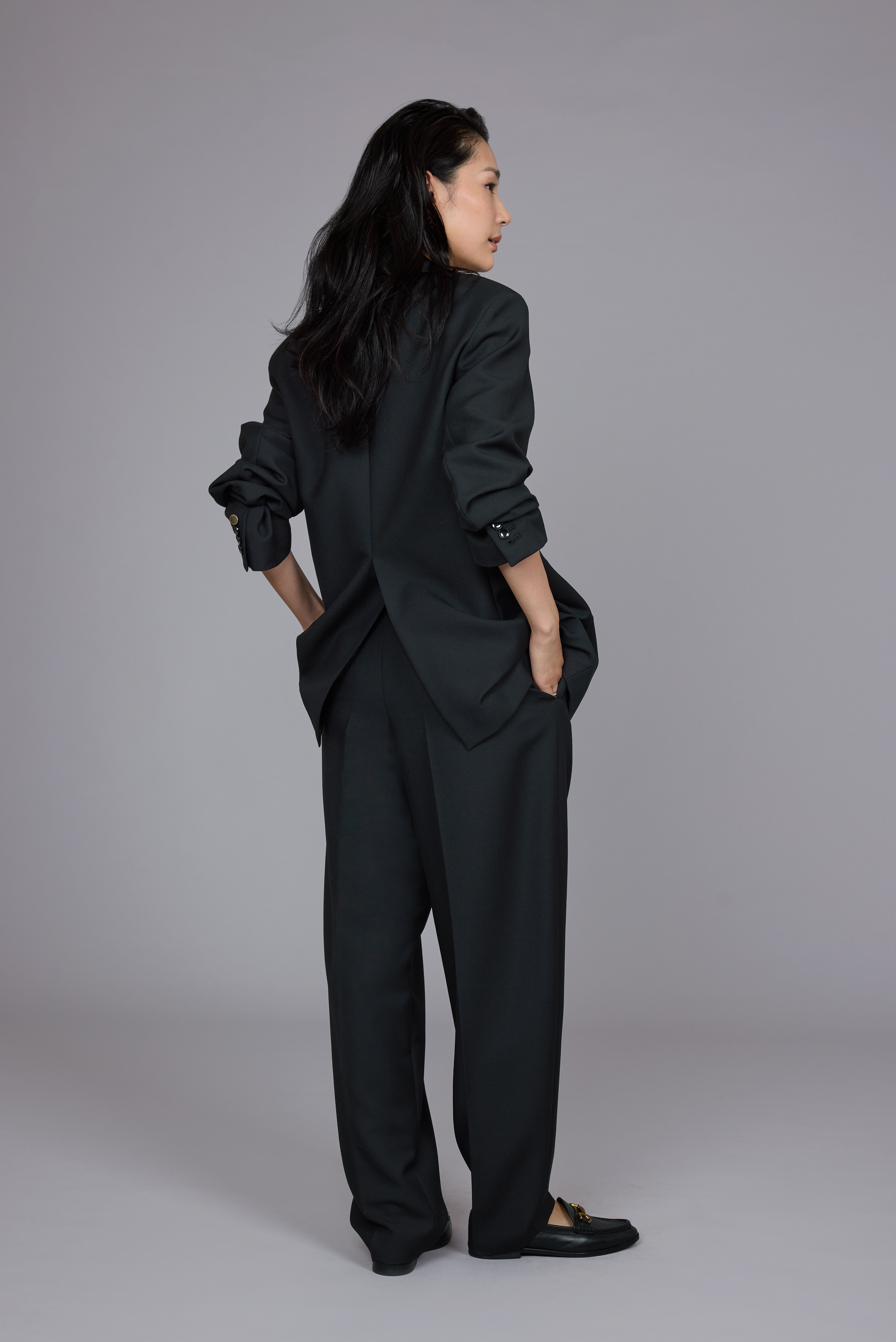 「クールな女性が好きで、今回もかっこいい女性像を意識してスタイリングを組みました」と、大塚さん。マスキュリンなムードが魅力のダブルのテーラードジャケットは、着る人をソフトに包むややオーバーサイズのシルエット。程よい光沢感とハリ感を持つウールモヘヤの素材感がラフに袖をまくった姿も品よく見せる。「ハンサムな着こなしが素敵だなと思うのはジュリア・ロバーツ。彼女の若い頃の着こなしを見てみると、スーツでも自然体で着こなしている。下手に飾らないからこそ滲み出るかっこよさがありますよね」。クールな中にも媚びのない色香が漂う秘訣はコーディネイトのトータルバランス。「ヘアメイクや服のディテールで女性らしさを足すようにしています。今回はヘアを無造作におろして、インナーはシルクサテンのキャミで素肌感を少し強調。仕上げにピアスで顔周りをキラリと華やかさをプラスしました」