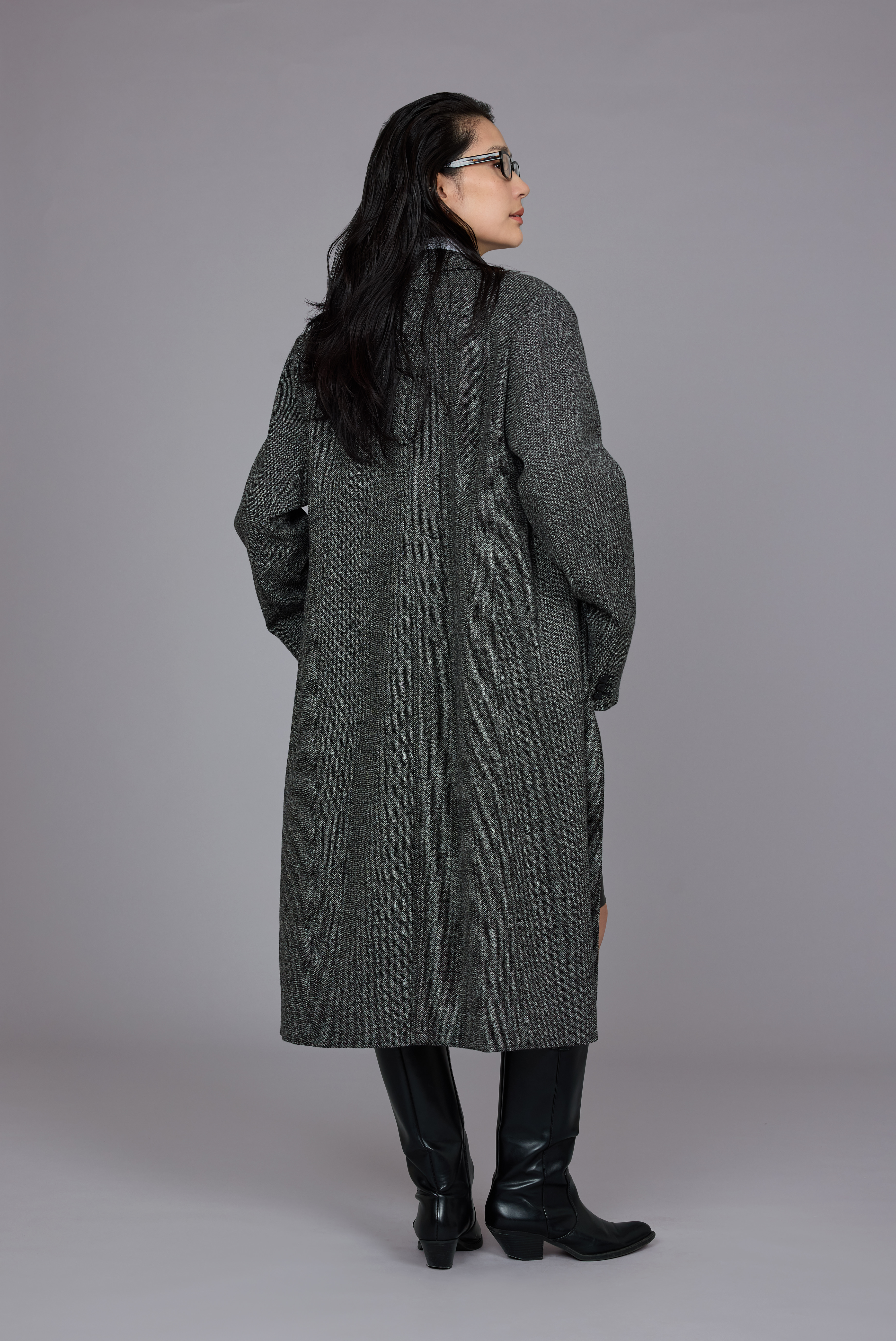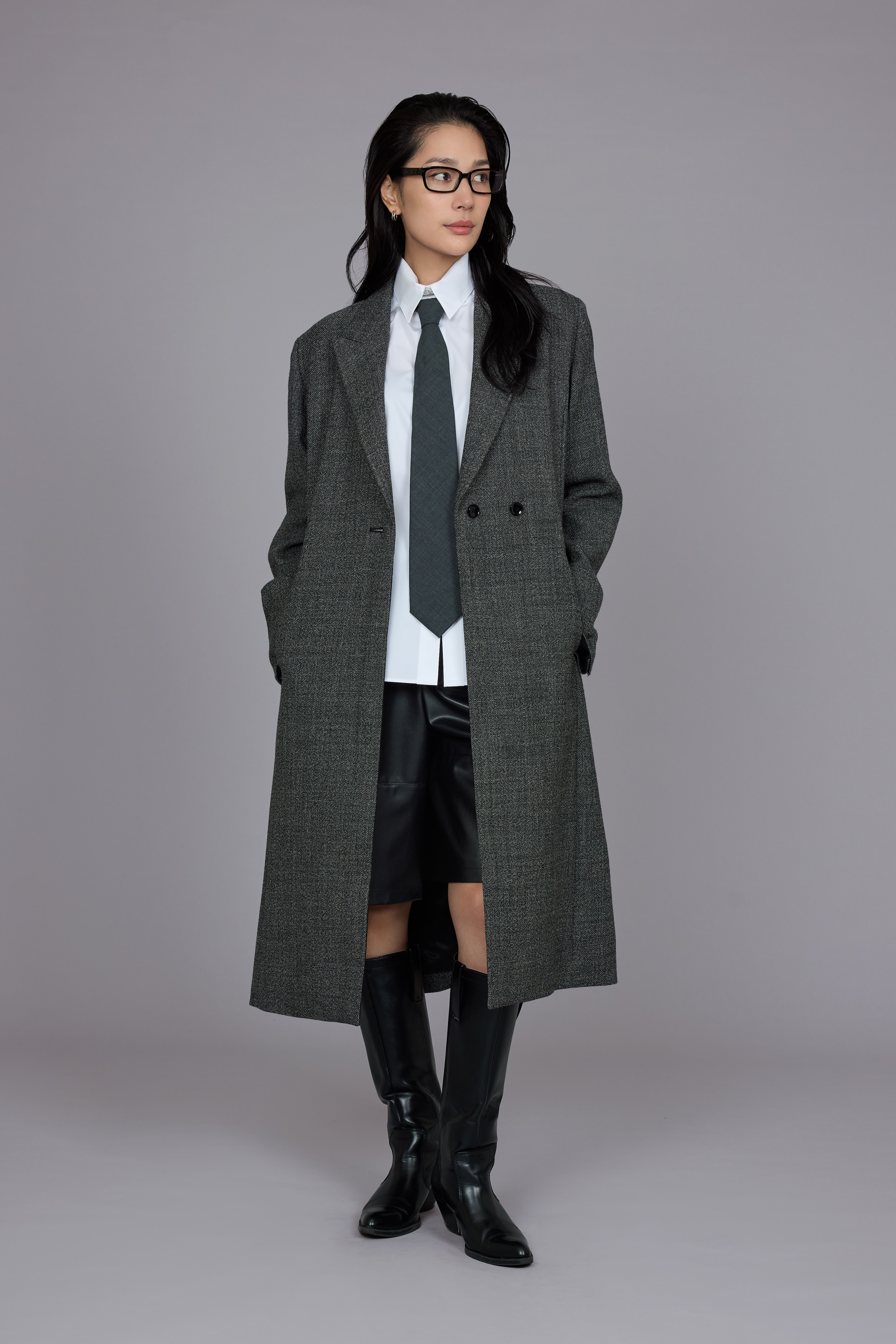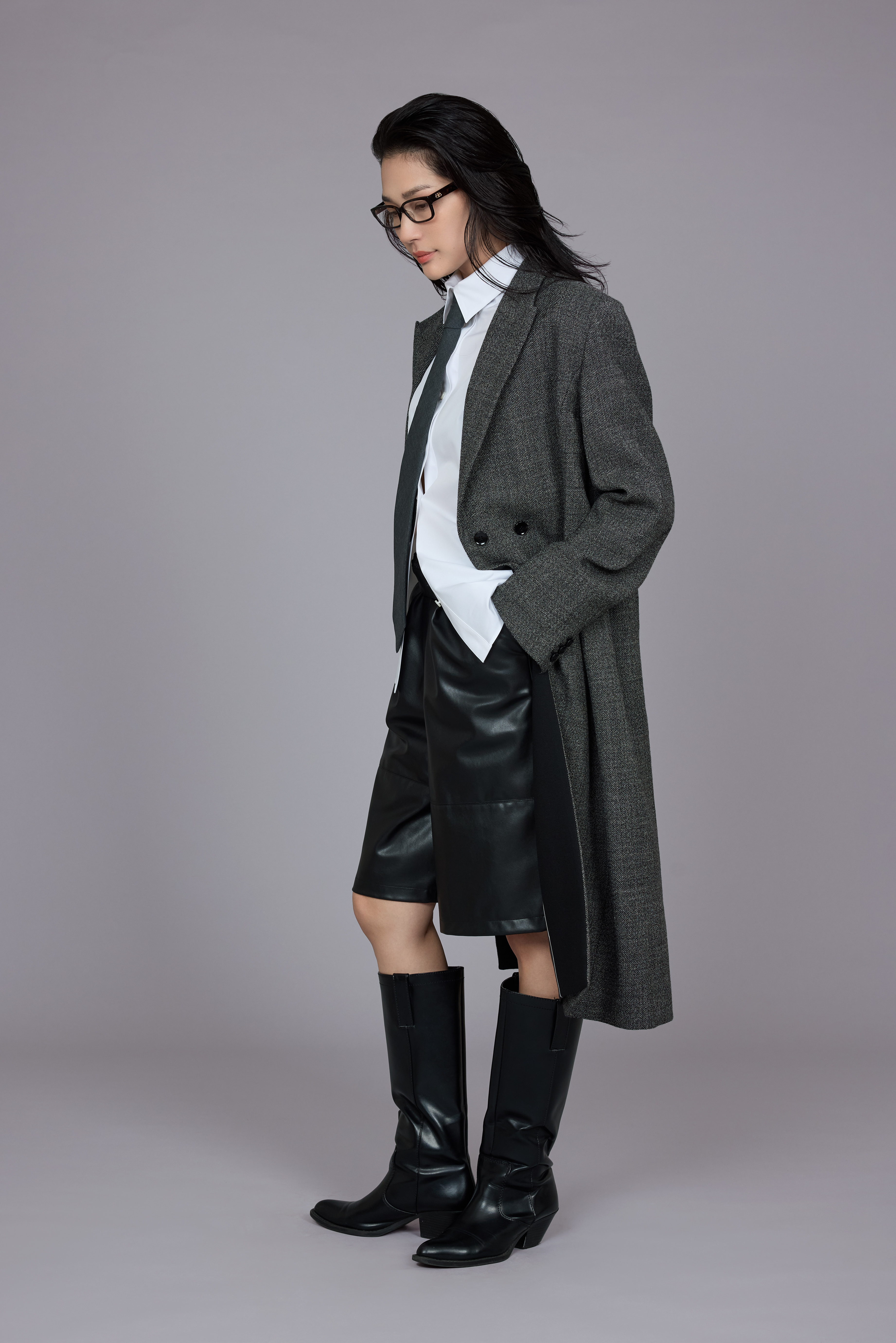 「コートのムードを生かしたくて、コーディネイトをとことんメンズライクなムードに寄せました。パリッとしたシャツとネクタイを合わせていますが、ボトムはエコレザーのハーフパンツとウエスタンブーツで、男性の着こなしとは違う雰囲気に仕上げています」。チェスターコートは、襟の大きさから肩のラインにいたるまで、スマートなフォルムを追求したアイテム。テーラード仕立てなのでジャケット感覚で着こなせる。「SA VILLE / SA VIEのシルエットの良さと着心地へのこだわりが伝わってくるコート!細身のコートやジャケットって、形が綺麗でも肩周りに違和感を覚えたり、窮屈に感じてしまうものもあるのですが、このコートにはそれがまったくないんです」。コーディネイトの仕上げには、自身のおしゃれの定番アイテムだと語るアイウェアをプラス。「今は細めのフォルムが好きで、服がシンプルな時はカラーで遊んだりします」