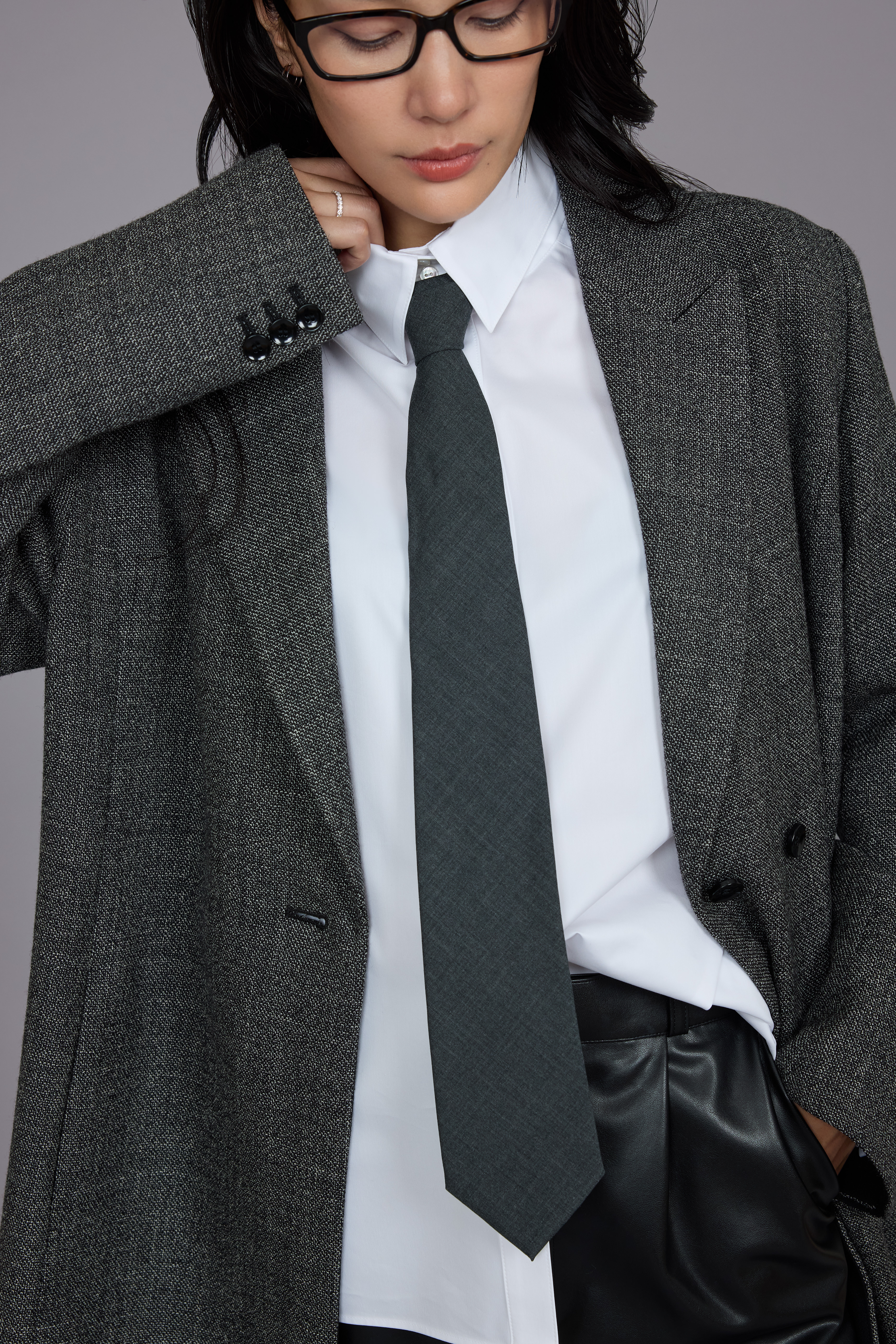 「ハンサム好きが高じて、ネクタイも好きなアイテムです。ネクタイのバランスにもこだわりがあって、メンズの着こなしに倣って少し長めに結ぶようにしています。今回はブーツを合わせたので、固い雰囲気になりすぎないようネクタイは少しゆるめに。綺麗にしすぎるのではなく、ニュアンスや抜け感をどう出すかを意識しました」