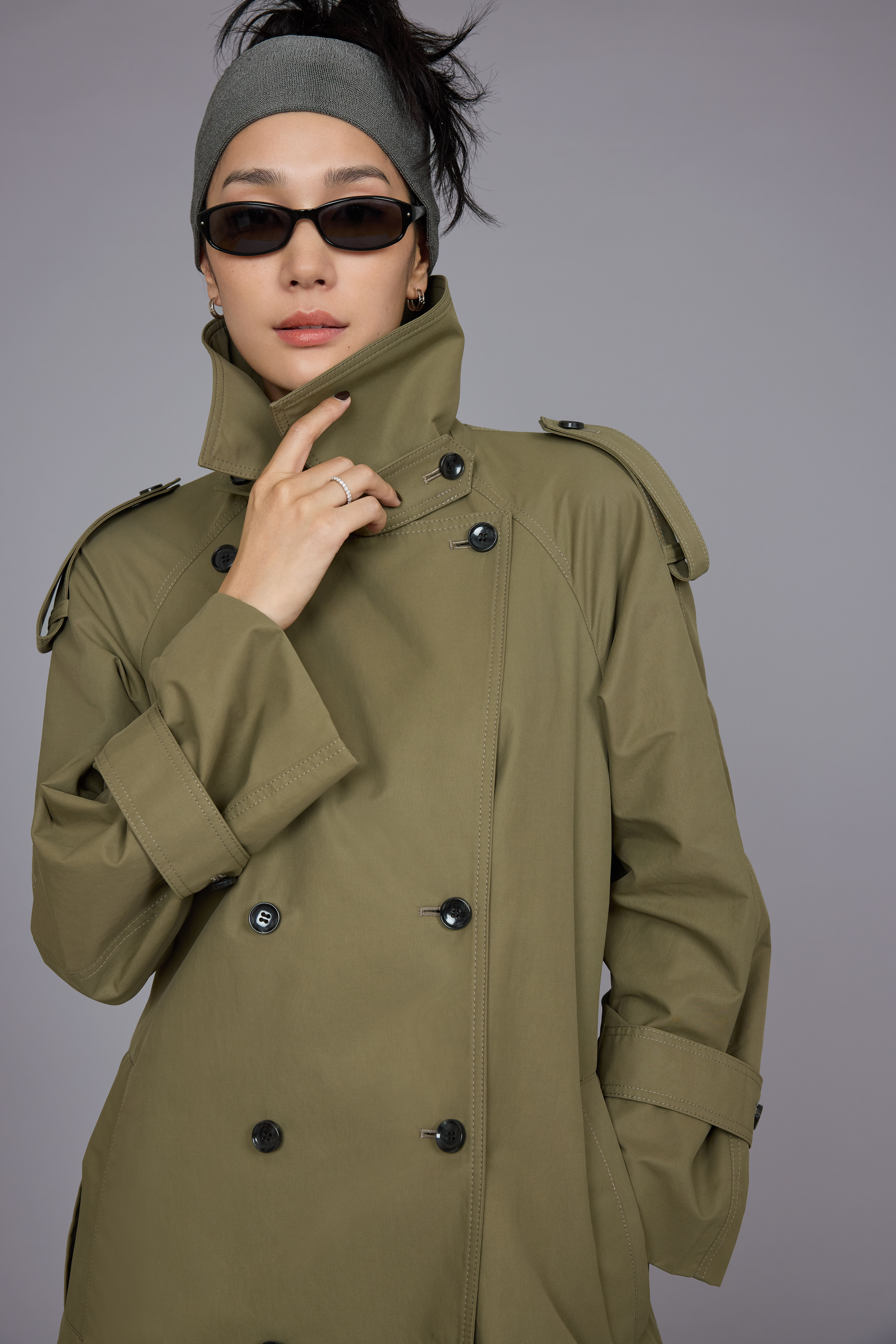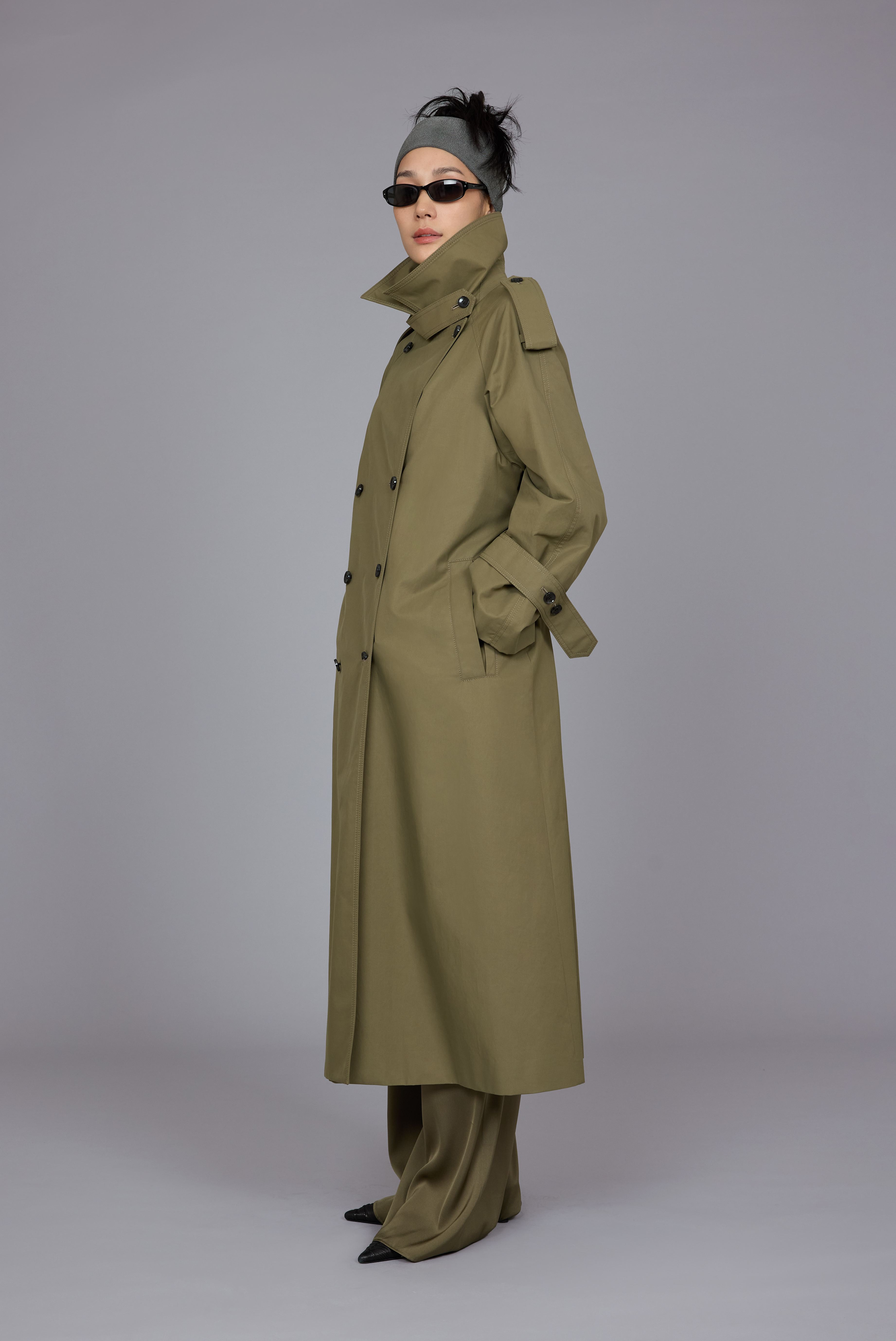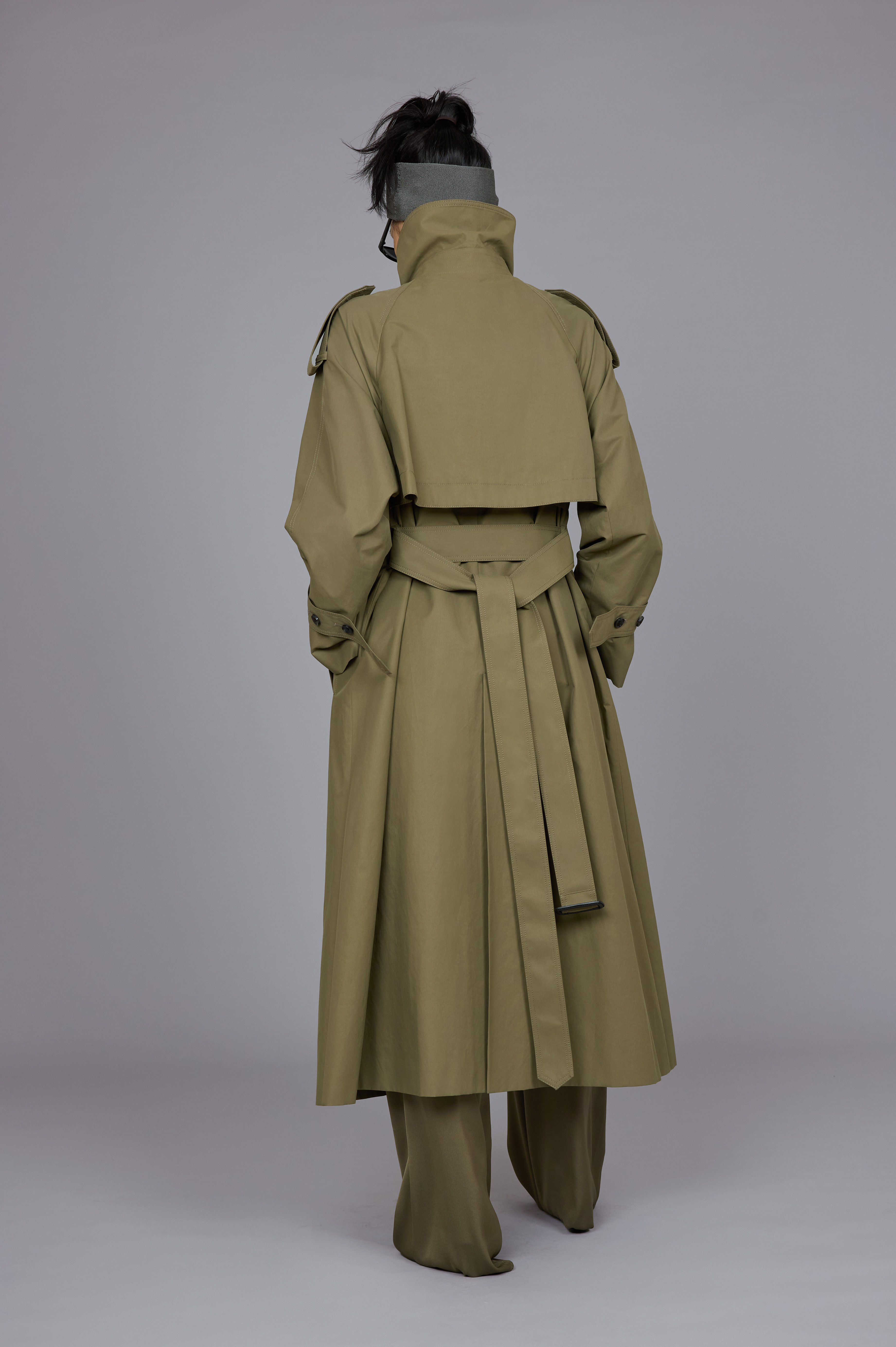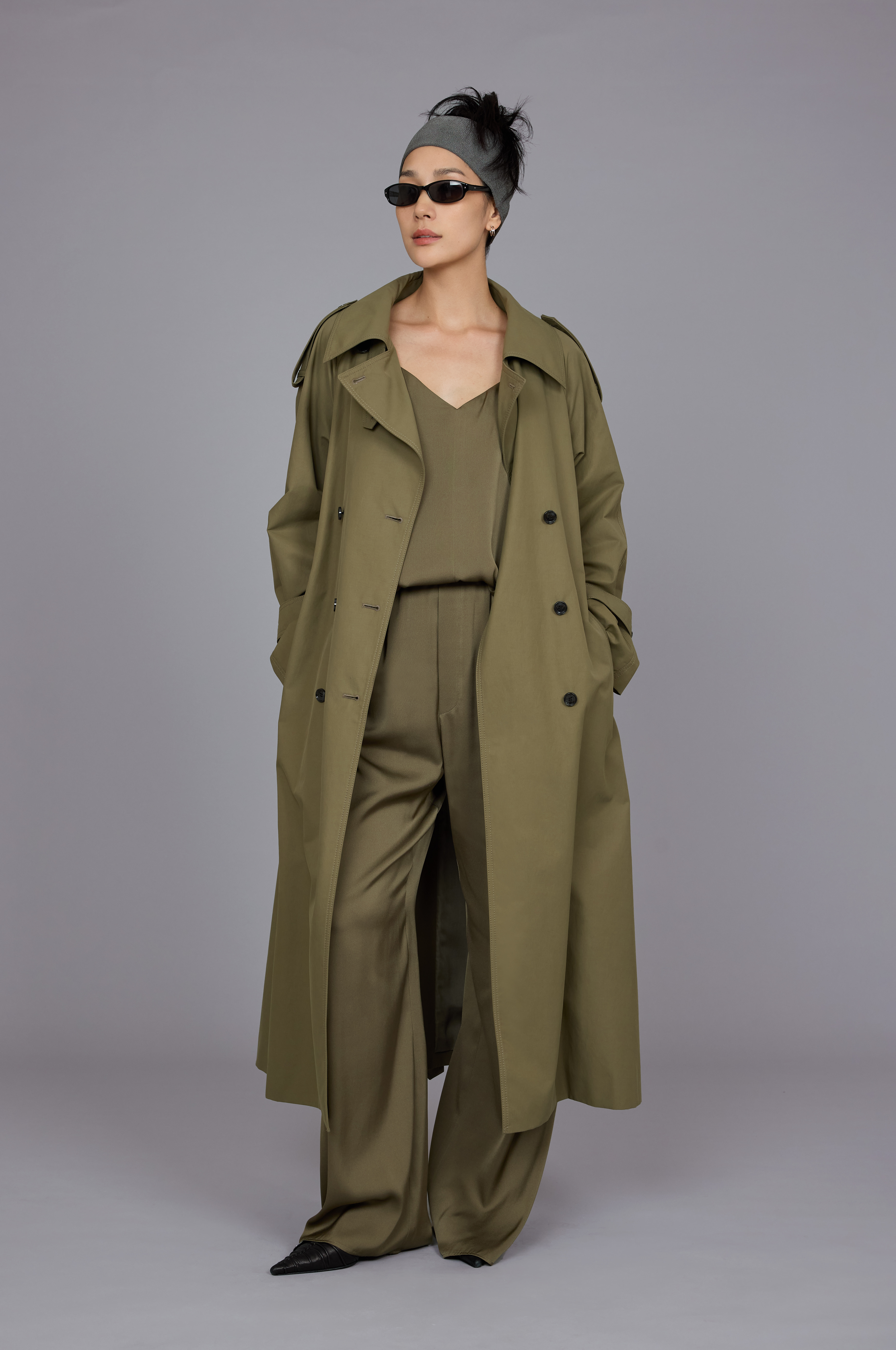 自身の持つ空気感に合わせた、クールでエッジの効いたトレンチコートの着こなしを提案してくれた大塚さん。襟を高くとったトレンチは、大塚さんのようにスタンドカラー風に着こなすとよりシャープな印象に。ウエストを絞れば裾にかけて優雅に広がるドレスライクなデザインだが、大塚さんはあえて結ばずオーバーサイズのシルエットを生かしたスタイリングに。「寝起きに近所のカフェへ行くようなイージームードをイメージしました。ラフにヘアバンドをして、サングラスですっぴんを隠す。すごく急いでたり、気合いを入れておしゃれをするのが面倒という時でも、これさえ着ていたらOKっていう頼れるアイテムですね」。インナーには、エフォートレスなムードが漂うシルクサテンのキャミとパンツをセレクト。「このパンツは、特に横から見た時のシルエットが綺麗。すとんと落ちるワイドシルエットも好みで履き心地も最高です」