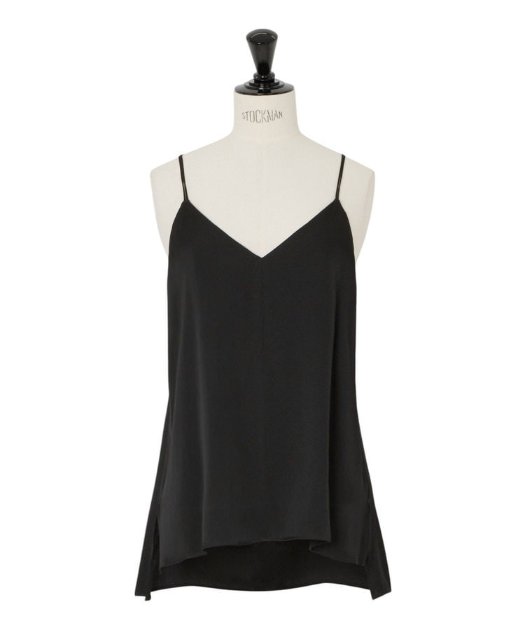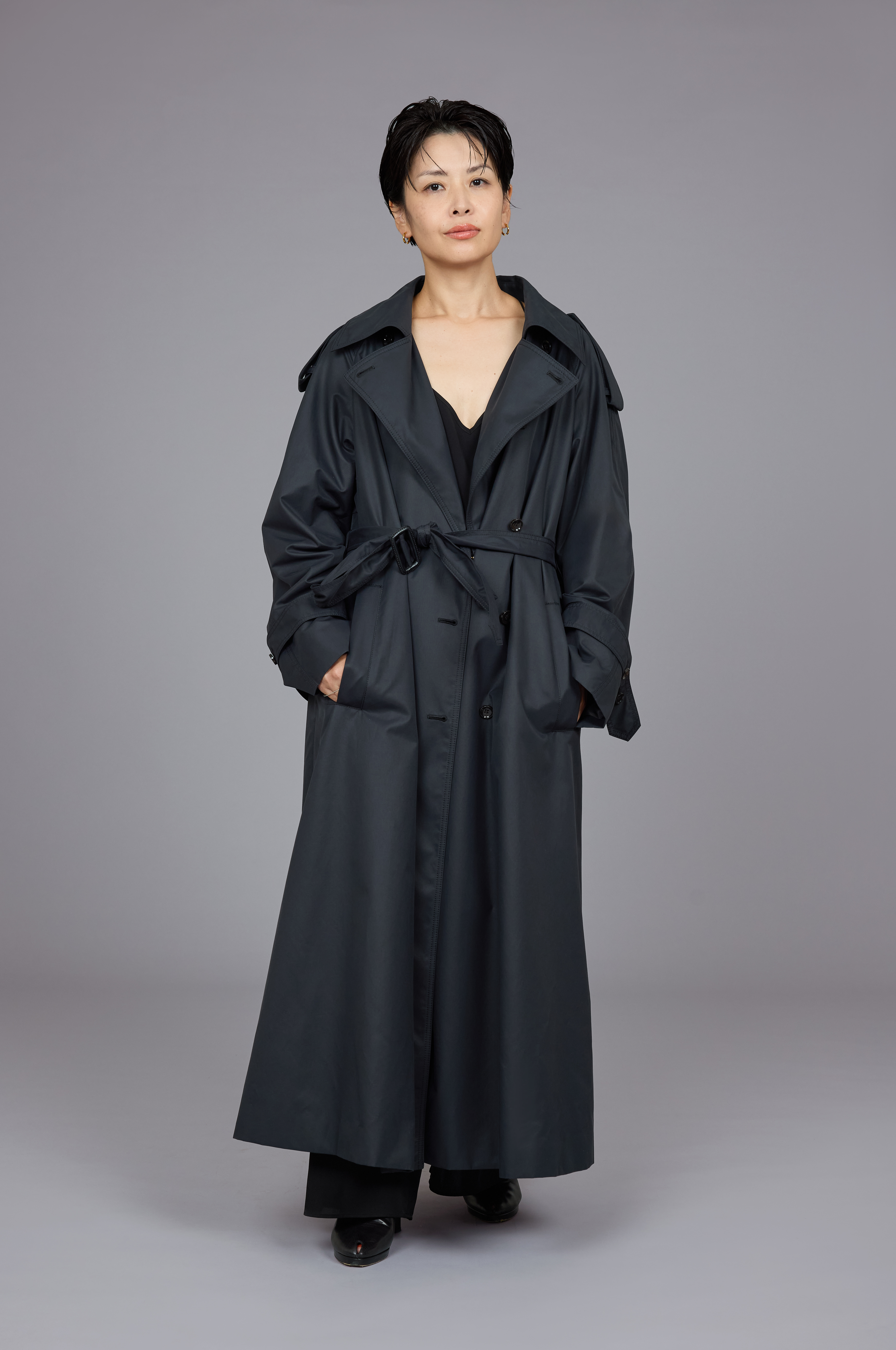 イタリアンレースのトリムがあしらわれたスリット入りのキャミソールドレスに、シルクサテンのパンツをレイヤードしたオールブラックのコーディネイト。「ワントーンのときは、表情の違った素材をミックスして奥行きのあるスタイルを意識しています。ブラックは、シンプルだからこそ難しい色。コーディネイトに少し癖をつけた方が自分らしく着こなせると思います」。仕上げのトレンチコートは、立ち襟気味なデザインがデコルテを綺麗に見せてくれる。表面は微光沢のギャバジン素材。肌に触れる裏面をコットン素材にしているので、優しい着心地を追求した1着だ。「素肌に重ねてもゴワゴワせず、ストレスフリー。見えない部分からもSA VILLE / SA VIEのこだわりを感じました。ドロップショルダーでオーバーサイズのつくりですが、ウエストとカフスのベルトがシルエットを美しく締めてくれるので、女性らしいムードで着こなせます」