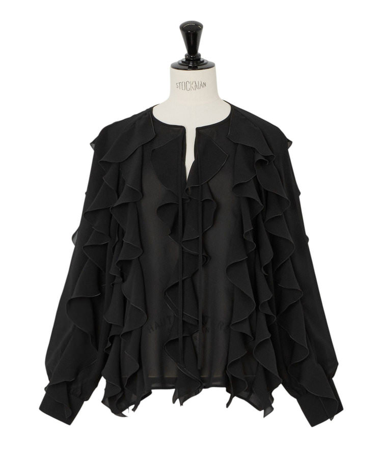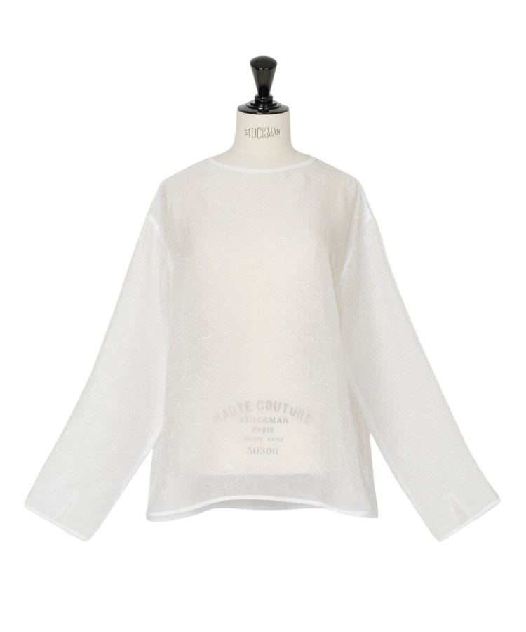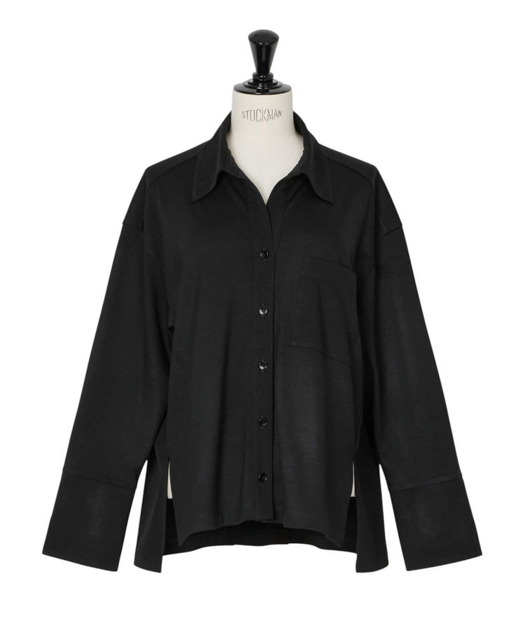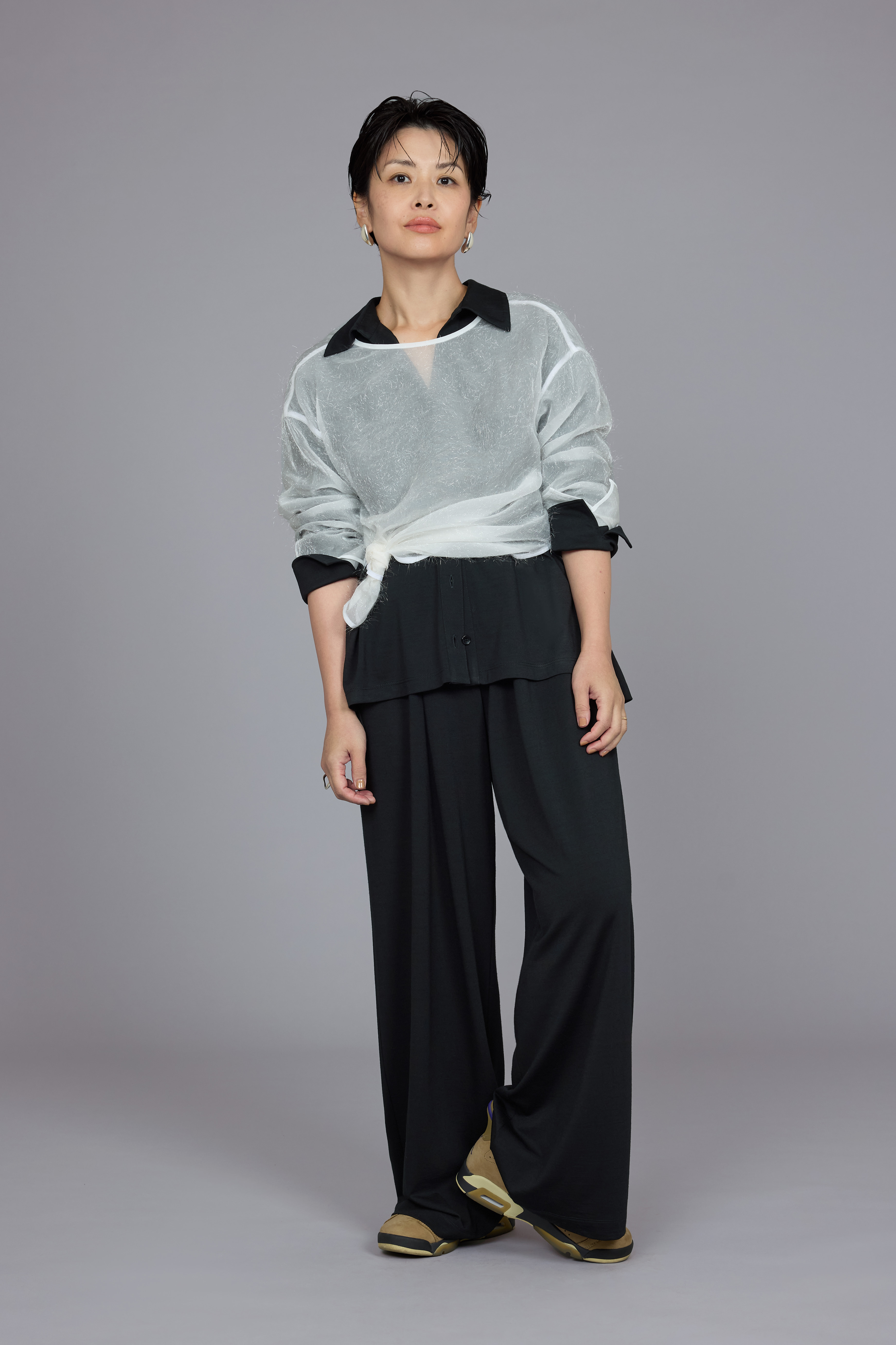 「これは名作!」と岩田さんが絶賛するのは、とろみ感のあるウールジャージーのシャツとパンツのセットアップ。「フライトウェアのような、心地よさとおしゃれを両立したスタイルを意識してブランドづくりをされていると聞いたのですが、そのこだわりを実感しました。オーバーサイズシャツなのに細く見せてくれるし、カフスの長さや襟の開け方が上品。肌触りがとても気持ち良く、パンツもスタイルをよく見せてくれる。シワにもなりにくい素材なので、リースや撮影といった仕事着としても大活躍です」。上質なリラックス感が漂うスタイルには、透け感のある繊細なカットジャガード素材のノーカラーブラウスをレイヤードして華やかさをプラス。小柄な岩田さんには、パンツコーデをスタイルアップさせるバランス術があるという。「このコーディネイトでは、ブラウスの裾をきゅっと結んで、インナーのシャツのボタンを3つ開けています。ポイントを上に作ると、ウエスト位置が上がって見えるんです」