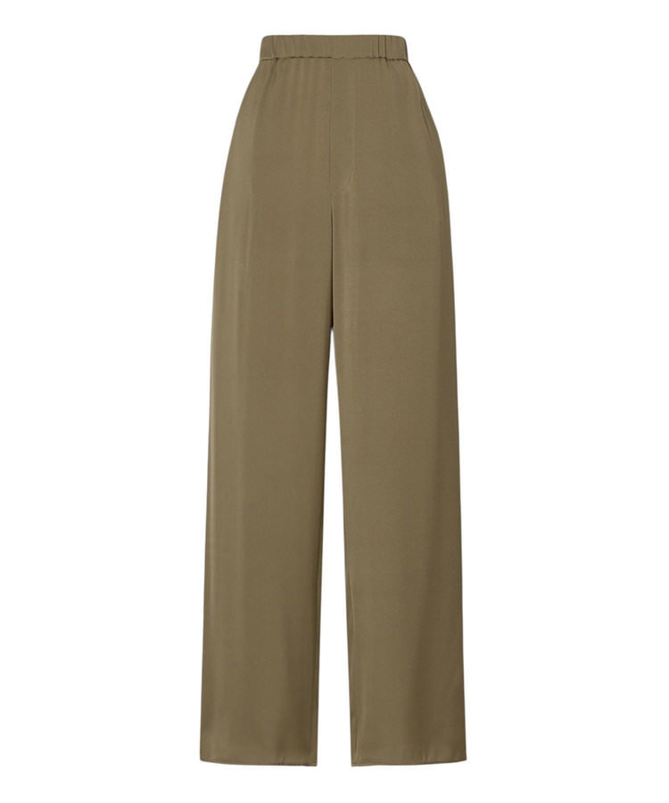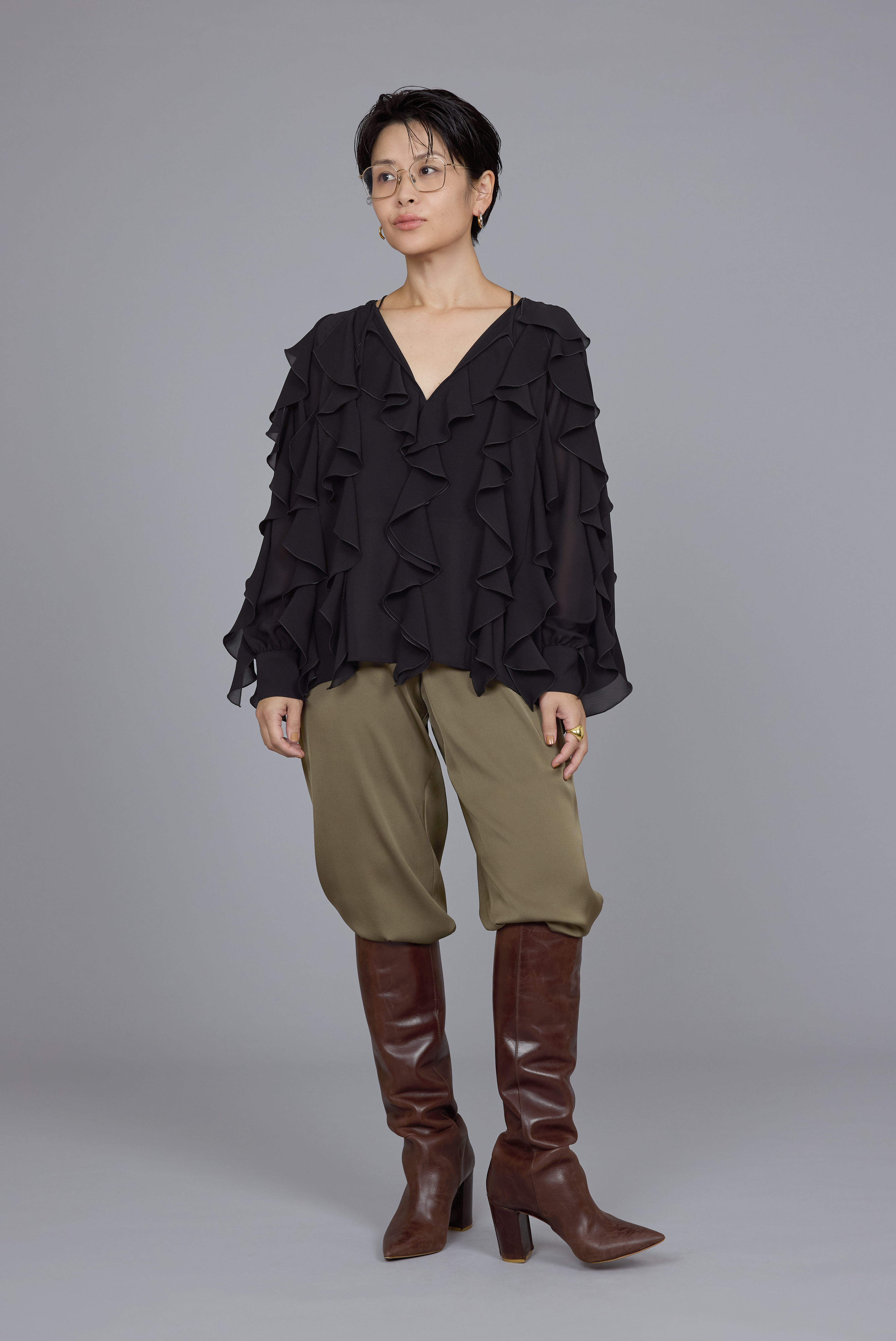 ワイドシルエットのシルクサテンパンツをブーツインして、フリルのブラウスをハンサムに着こなした岩田さん。シルエットに変化をつけることもまた、岩田さん流のバランスアップのテクニックのひとつ。「首、手首、足首のどこかを引き締めることでスタイル良く見せることができます。今回はラッフルが生むボリュームが素敵なブラウスをメインにしたかったので、タイトなシルエットのブーツを使い下に向けて細くなるプロポーションとシルエットにしました。落ち感のある素材でブーツインもしやすいので、ロングシーズン活躍してくれるアイテムです」。コーディネイトを一層クールに仕上げるのがゴールドのアイウェア。「ドレッシーにも着こなせるブラウスですが、ジュエリー以外できらりとした輝きを足すことで違ったムードでコーディネイトを楽しめます」