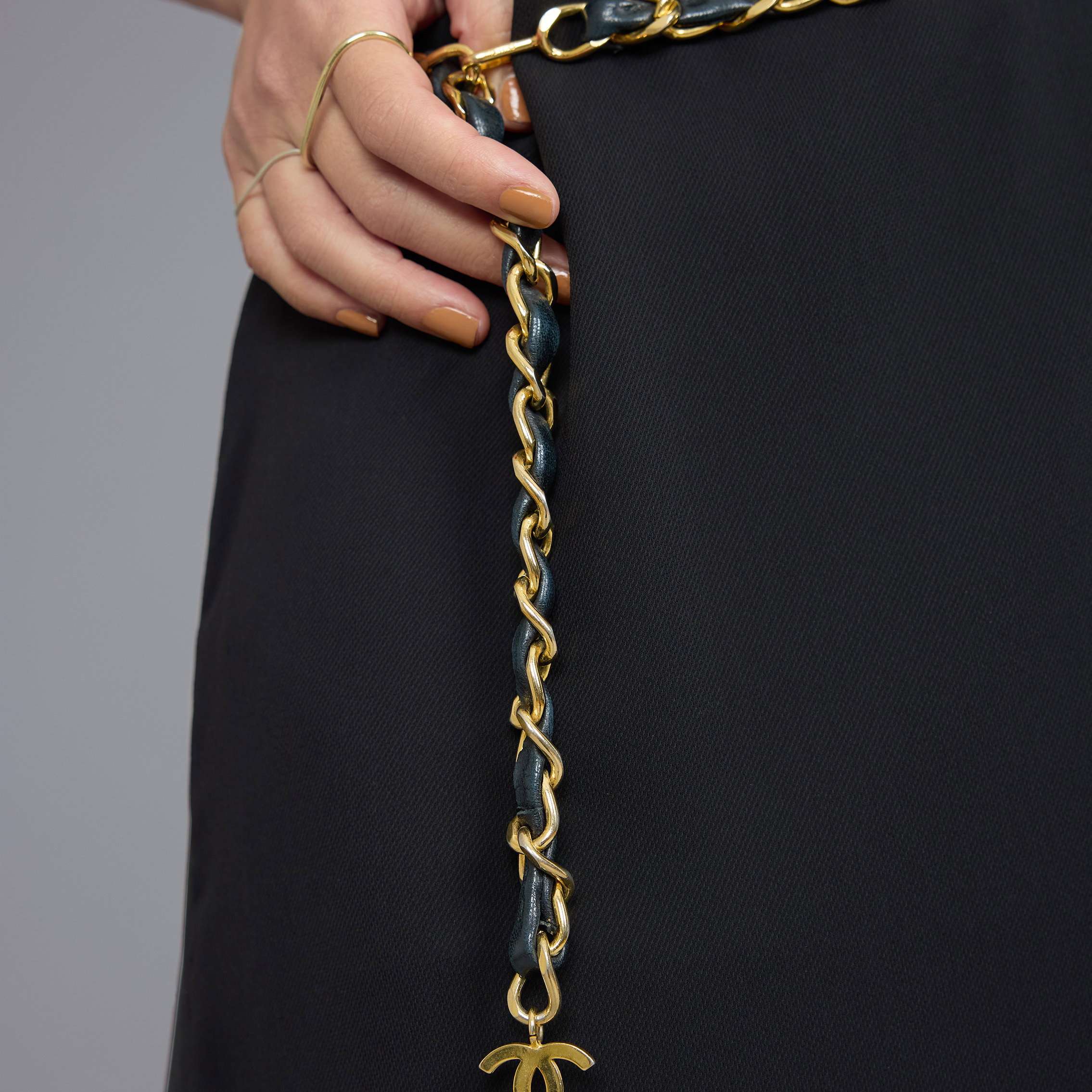 キャミソールドレスの繊細なシルエットに、レザーとゴールドが編み込まれたシャネルのヴィンテージのチェーンベルトでアクセントをプラス。「ちょっとだけ懐かしさを感じるようなアイテムが好き。トレンド感のあるスタイリングにも、アクセなどでひと癖足すことを意識しています」