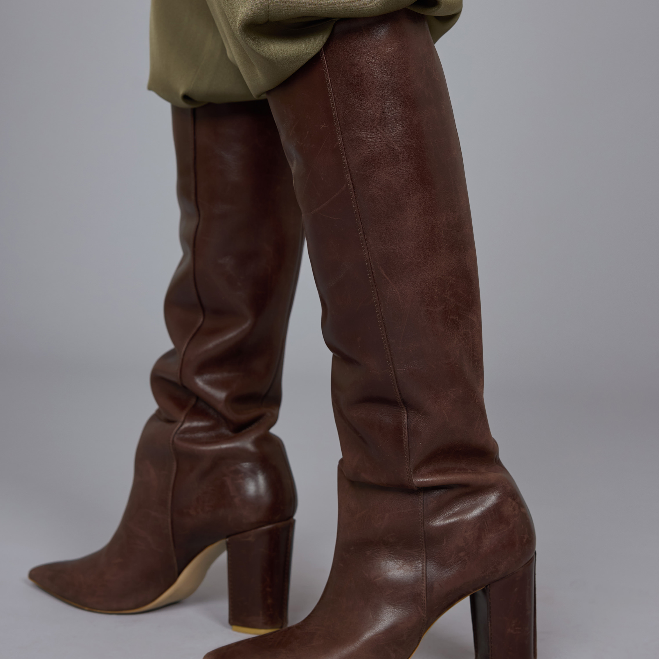 「SA VILLE / SA VIEのニュアンスのある色使いがすごくツボだったので、このコーディネイトはカラーバランスを大事にしました」と岩田さん。ブランドのアイコニックカラーであるブラックと、今季のメインカラーのカーキ、そこにブーツのブラウンを足して、秋らしいシックなグラデーションコーデが完成。