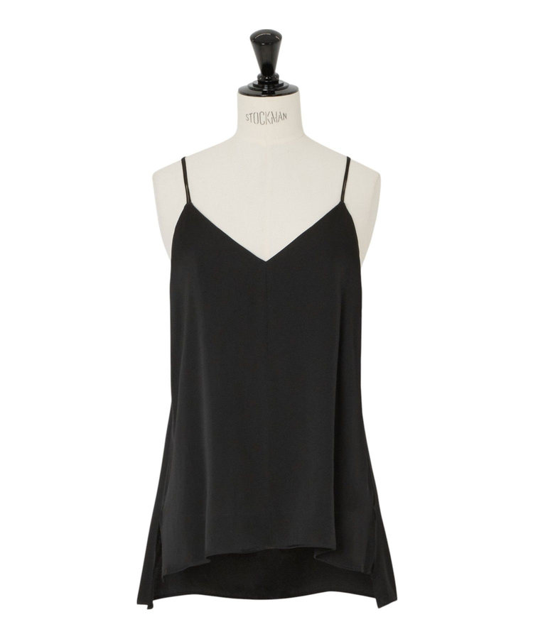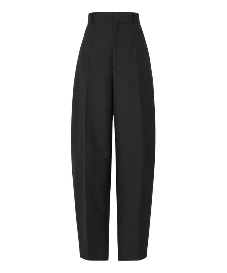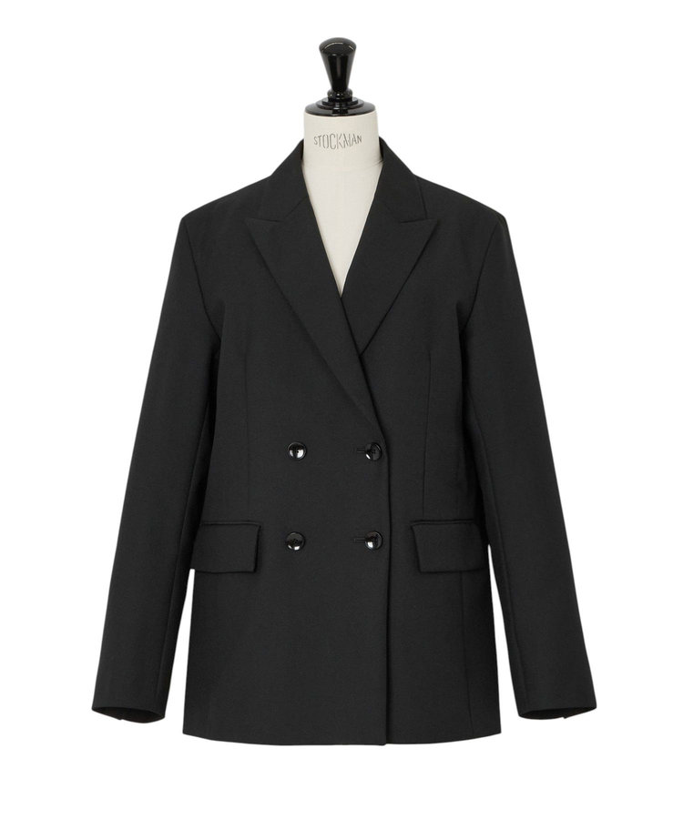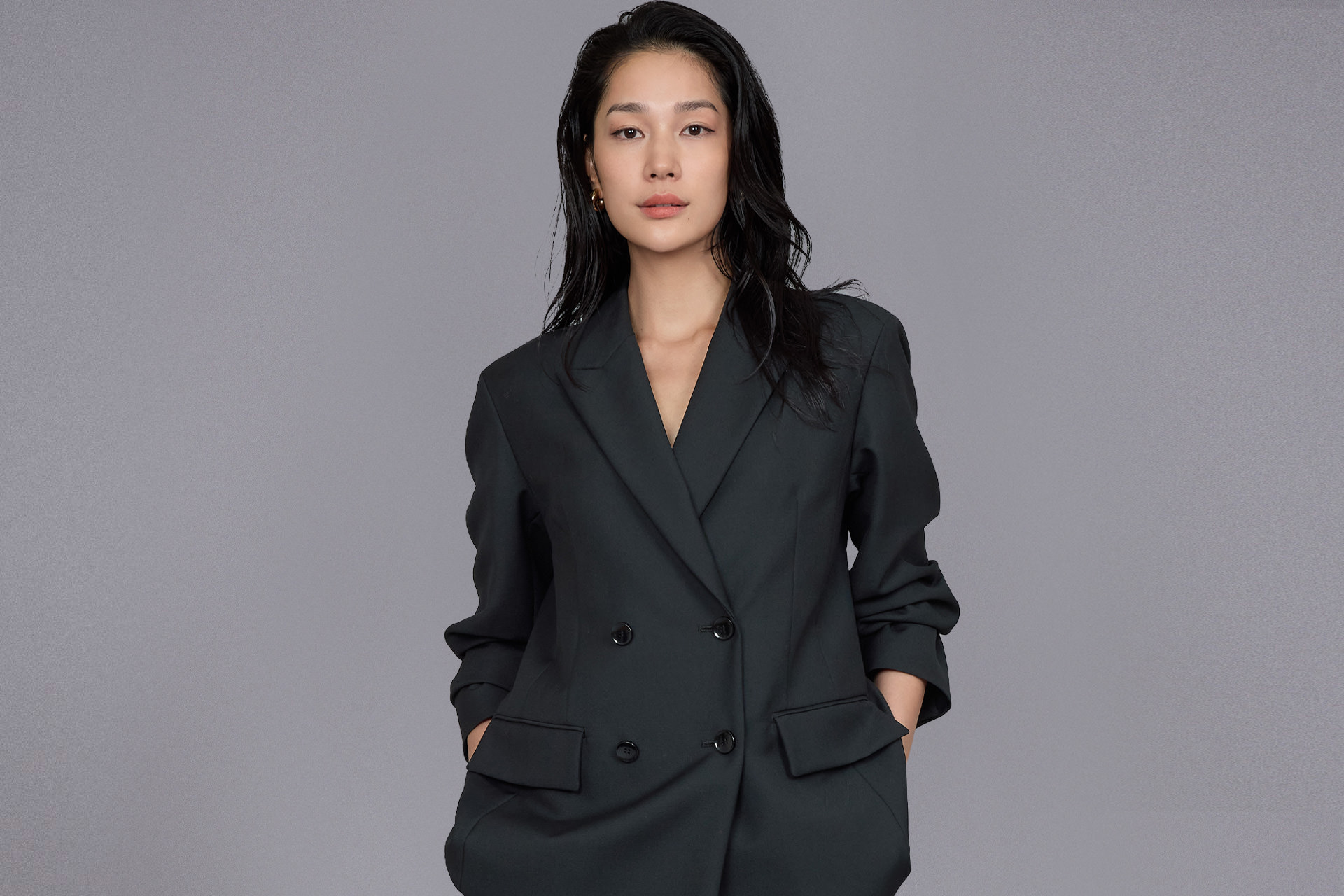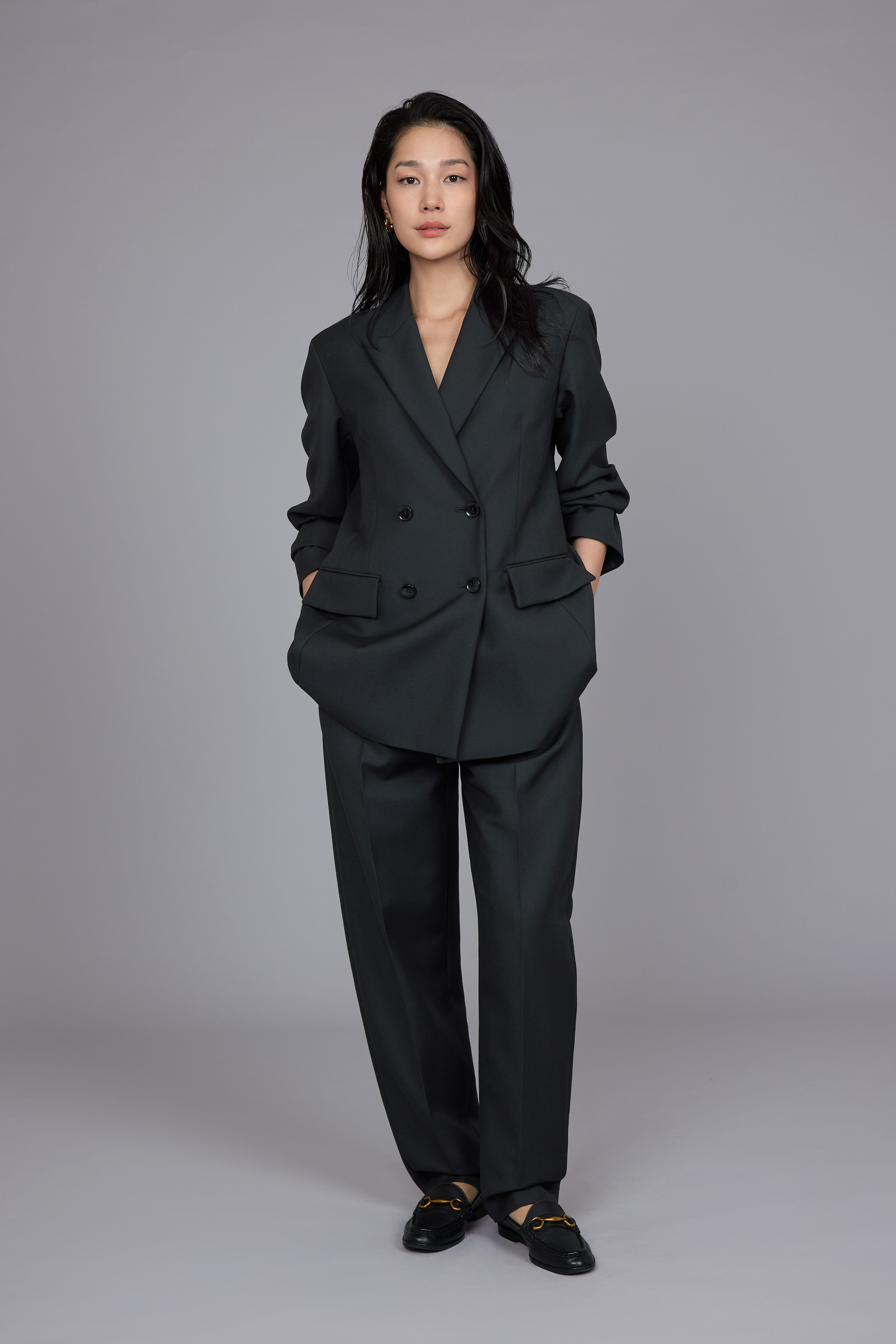 「クールな女性が好きで、今回もかっこいい女性像を意識してスタイリングを組みました」と、大塚さん。マスキュリンなムードが魅力のダブルのテーラードジャケットは、着る人をソフトに包むややオーバーサイズのシルエット。程よい光沢感とハリ感を持つウールモヘヤの素材感がラフに袖をまくった姿も品よく見せる。「ハンサムな着こなしが素敵だなと思うのはジュリア・ロバーツ。彼女の若い頃の着こなしを見てみると、スーツでも自然体で着こなしている。下手に飾らないからこそ滲み出るかっこよさがありますよね」。クールな中にも媚びのない色香が漂う秘訣はコーディネイトのトータルバランス。「ヘアメイクや服のディテールで女性らしさを足すようにしています。今回はヘアを無造作におろして、インナーはシルクサテンのキャミで素肌感を少し強調。仕上げにピアスで顔周りをキラリと華やかさをプラスしました」