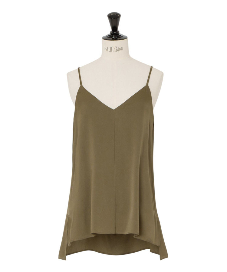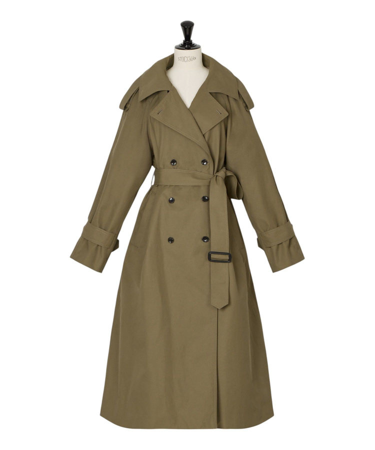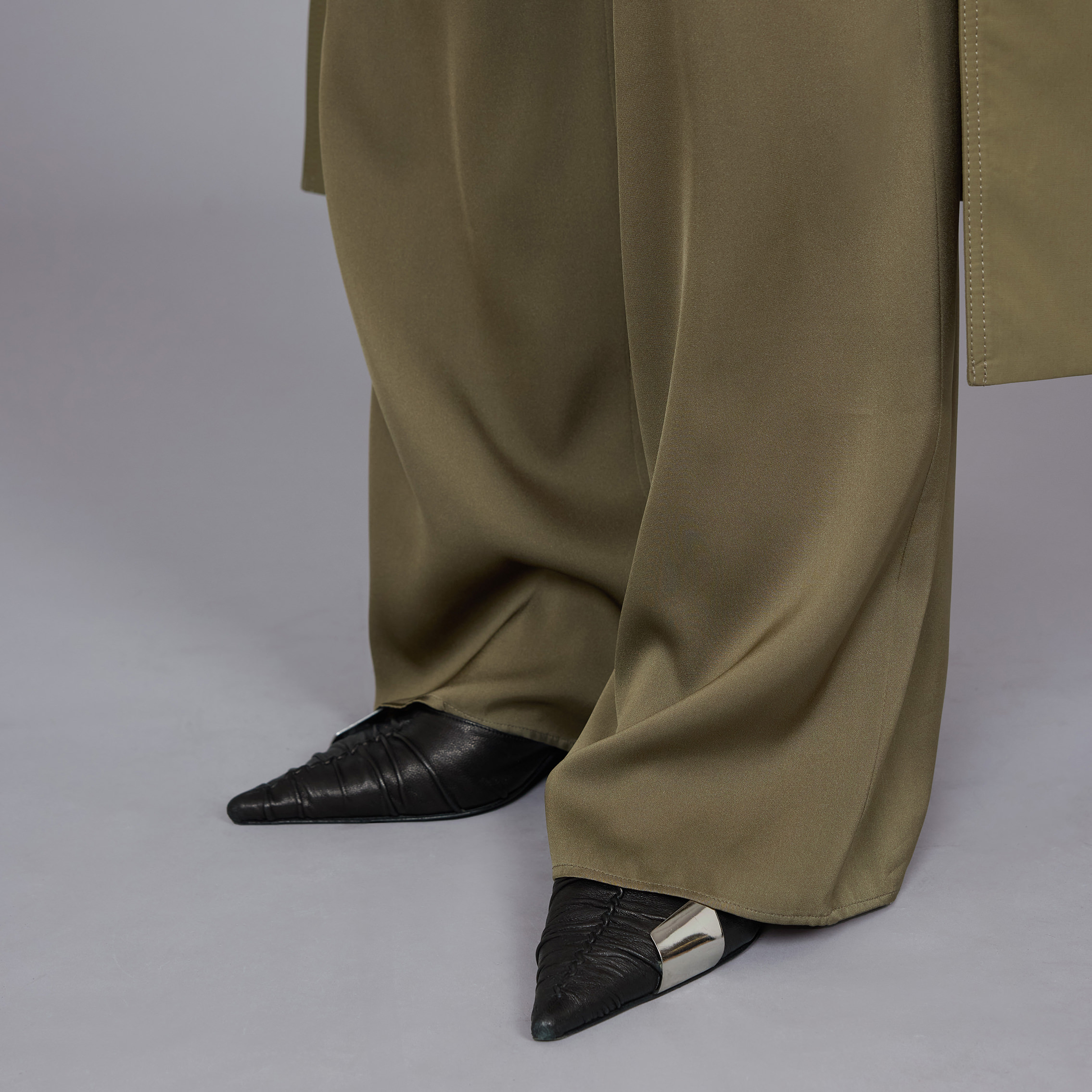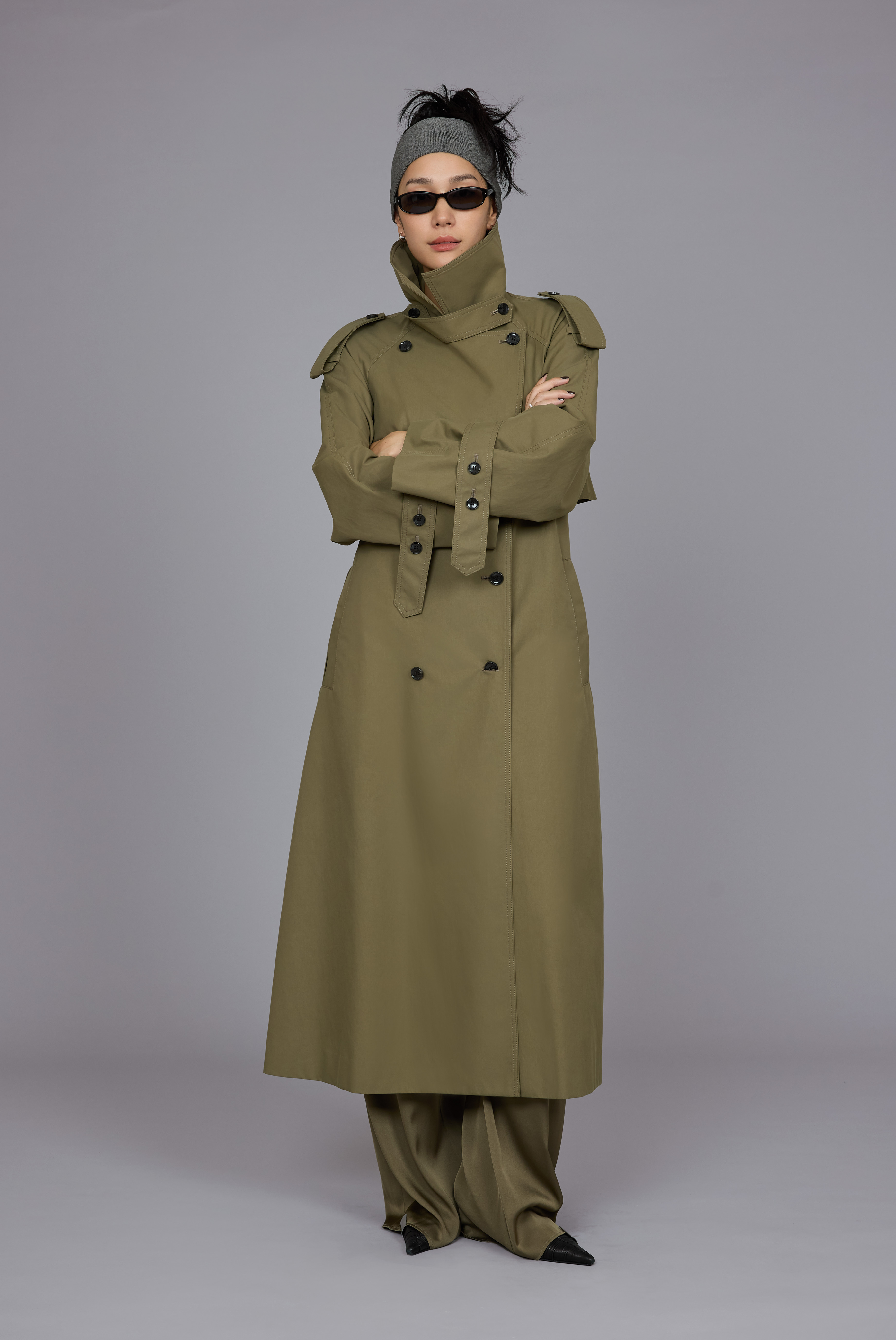 自身の持つ空気感に合わせた、クールでエッジの効いたトレンチコートの着こなしを提案してくれた大塚さん。襟を高くとったトレンチは、大塚さんのようにスタンドカラー風に着こなすとよりシャープな印象に。ウエストを絞れば裾にかけて優雅に広がるドレスライクなデザインだが、大塚さんはあえて結ばずオーバーサイズのシルエットを生かしたスタイリングに。「寝起きに近所のカフェへ行くようなイージームードをイメージしました。ラフにヘアバンドをして、サングラスですっぴんを隠す。すごく急いでたり、気合いを入れておしゃれをするのが面倒という時でも、これさえ着ていたらOKっていう頼れるアイテムですね」。インナーには、エフォートレスなムードが漂うシルクサテンのキャミとパンツをセレクト。「このパンツは、特に横から見た時のシルエットが綺麗。すとんと落ちるワイドシルエットも好みで履き心地も最高です」