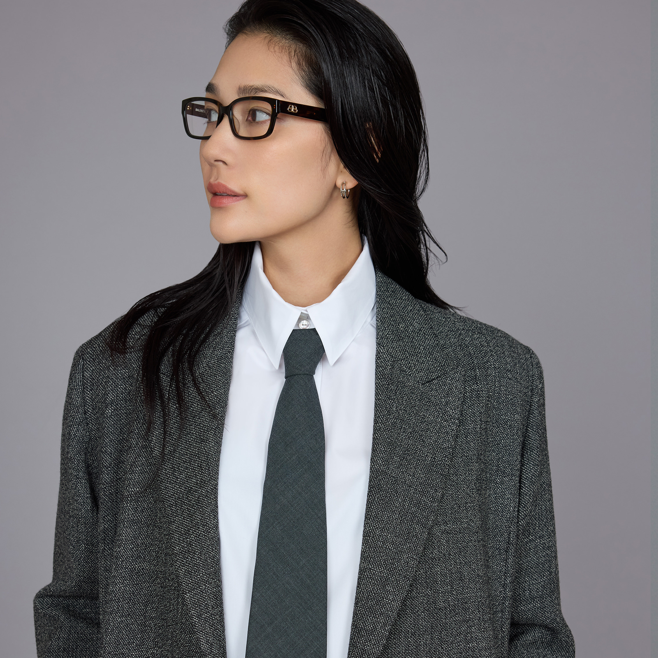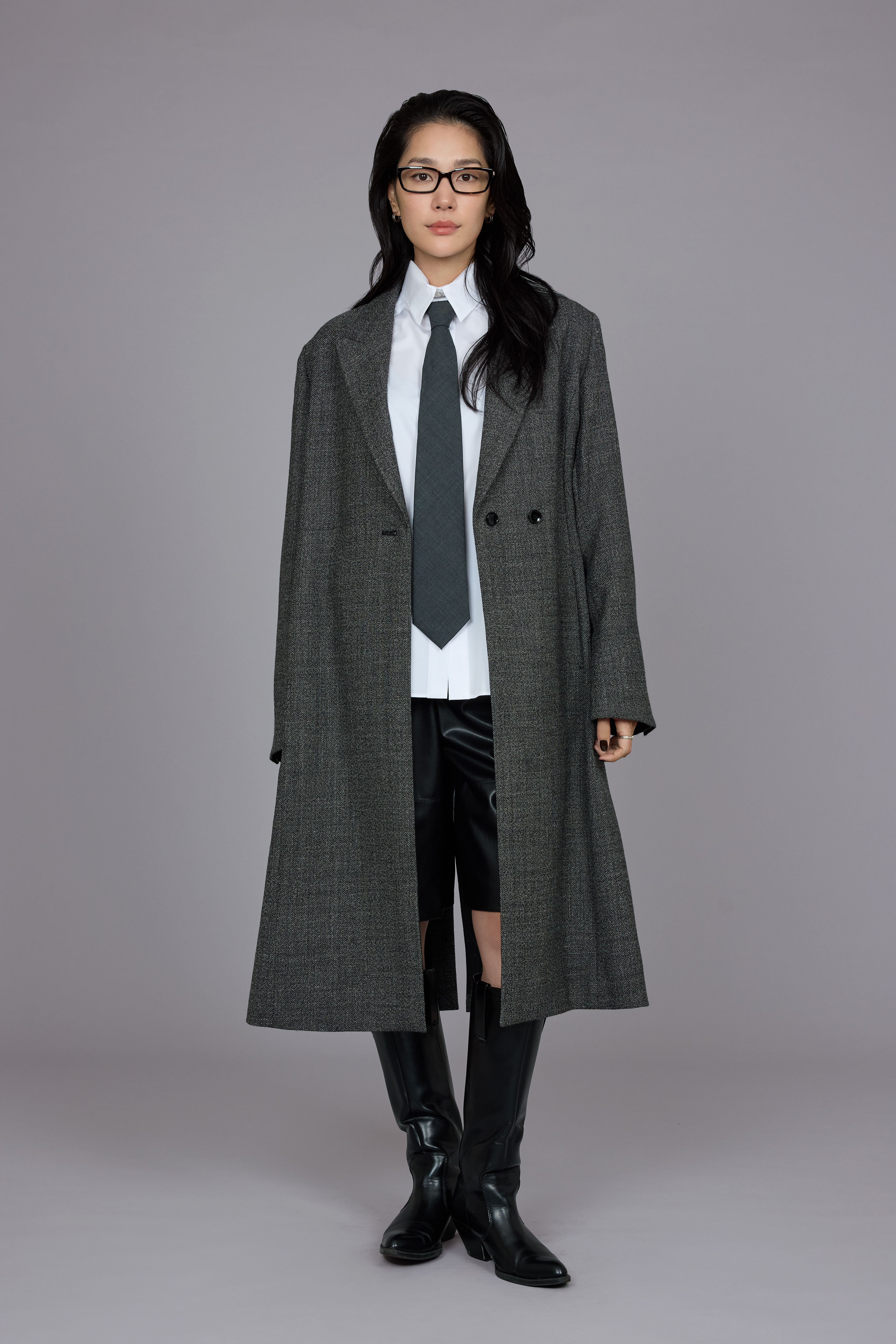 「コートのムードを生かしたくて、コーディネイトをとことんメンズライクなムードに寄せました。パリッとしたシャツとネクタイを合わせていますが、ボトムはエコレザーのハーフパンツとウエスタンブーツで、男性の着こなしとは違う雰囲気に仕上げています」。チェスターコートは、襟の大きさから肩のラインにいたるまで、スマートなフォルムを追求したアイテム。テーラード仕立てなのでジャケット感覚で着こなせる。「SA VILLE / SA VIEのシルエットの良さと着心地へのこだわりが伝わってくるコート!細身のコートやジャケットって、形が綺麗でも肩周りに違和感を覚えたり、窮屈に感じてしまうものもあるのですが、このコートにはそれがまったくないんです」。コーディネイトの仕上げには、自身のおしゃれの定番アイテムだと語るアイウェアをプラス。「今は細めのフォルムが好きで、服がシンプルな時はカラーで遊んだりします」
