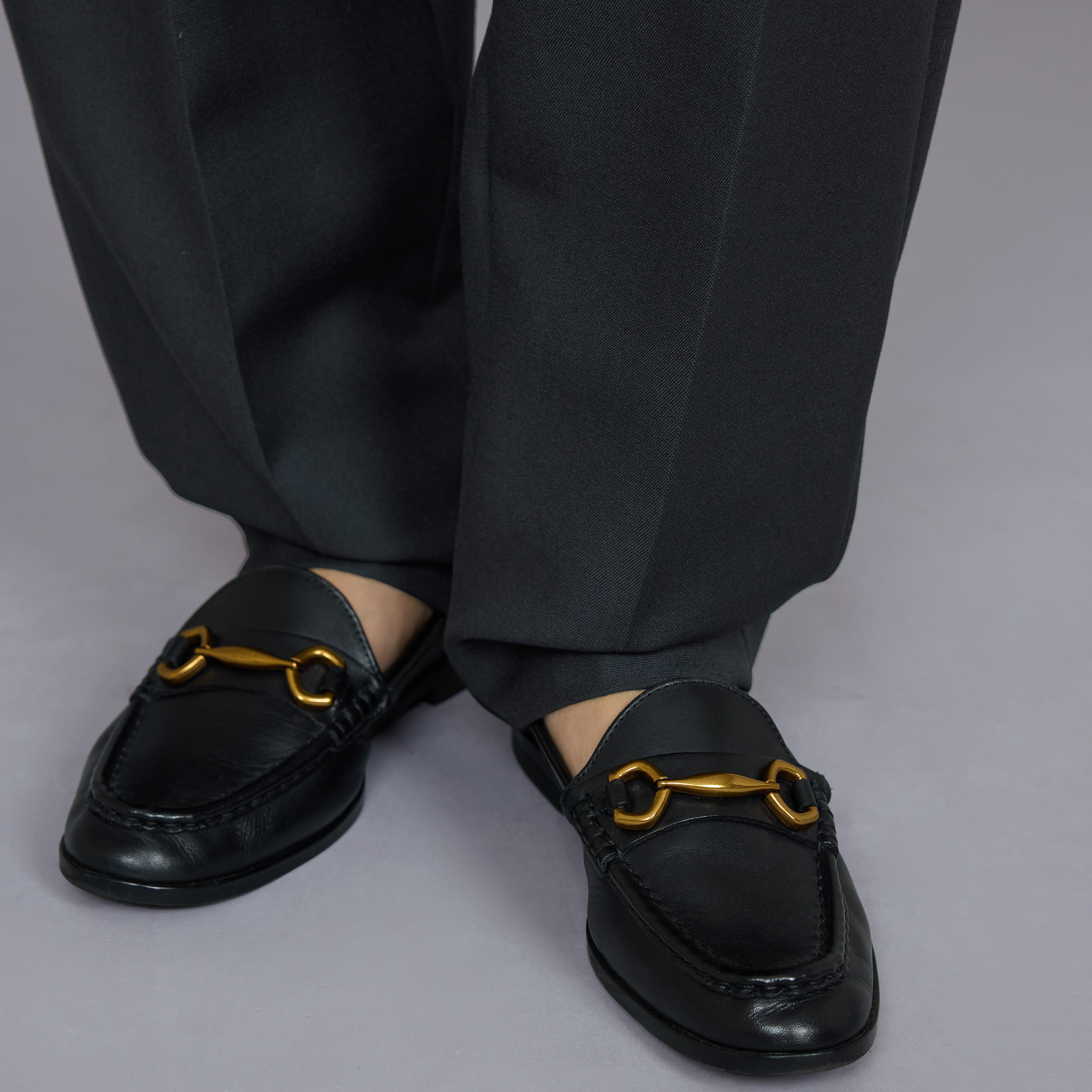 足もとはオーソドックスなローファーで、知性漂うマスキュリンムードを追求。「私服のコーディネイトを組む時には、よくピンタレストを参考にしています。女性に限らず、メンズの写真を見てその着こなしを取り入れたりもするんですよ。女性と男性のコーデの良い部分を合わせて、自分だけの着こなしをしたいと思っています」。