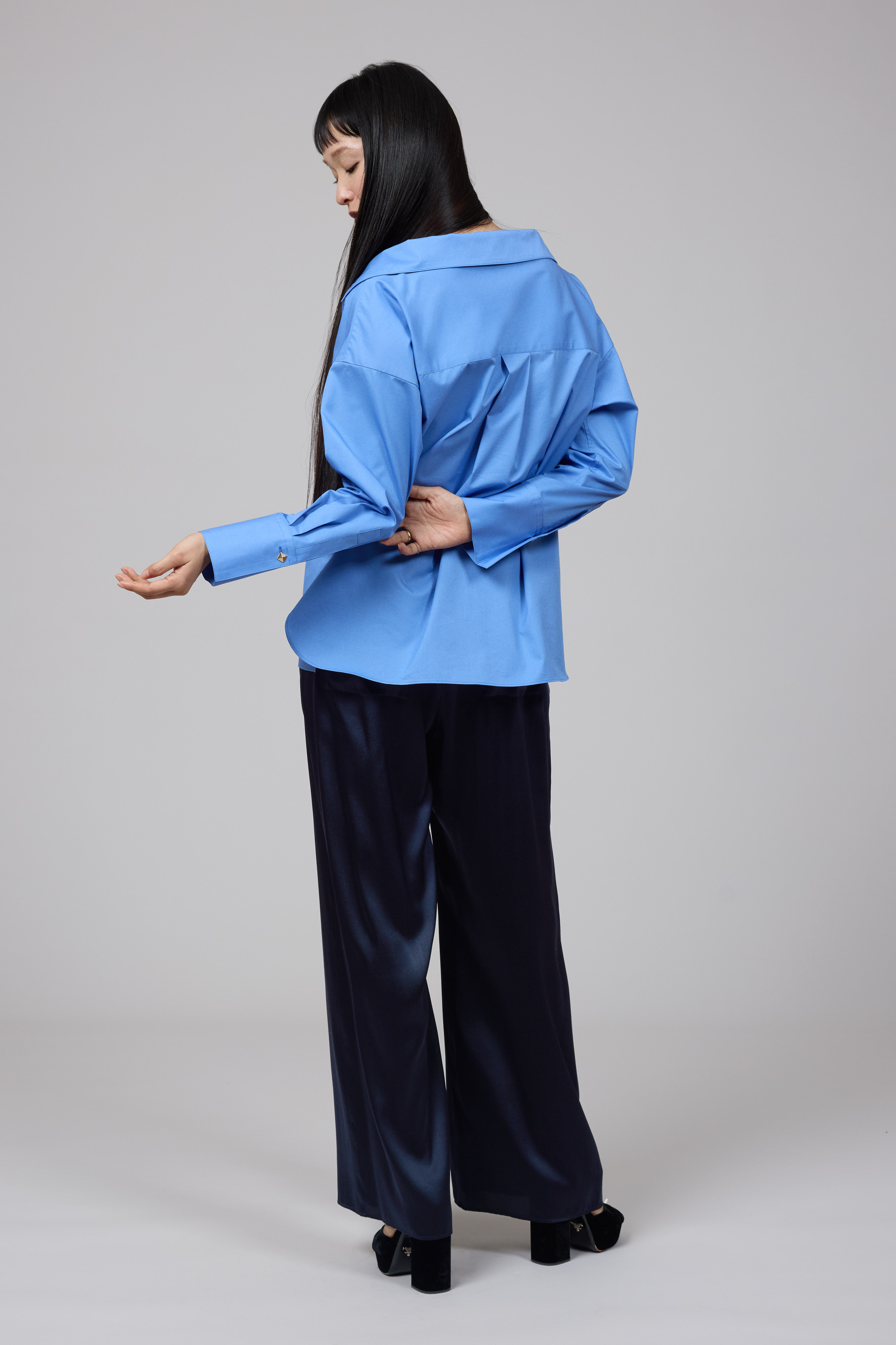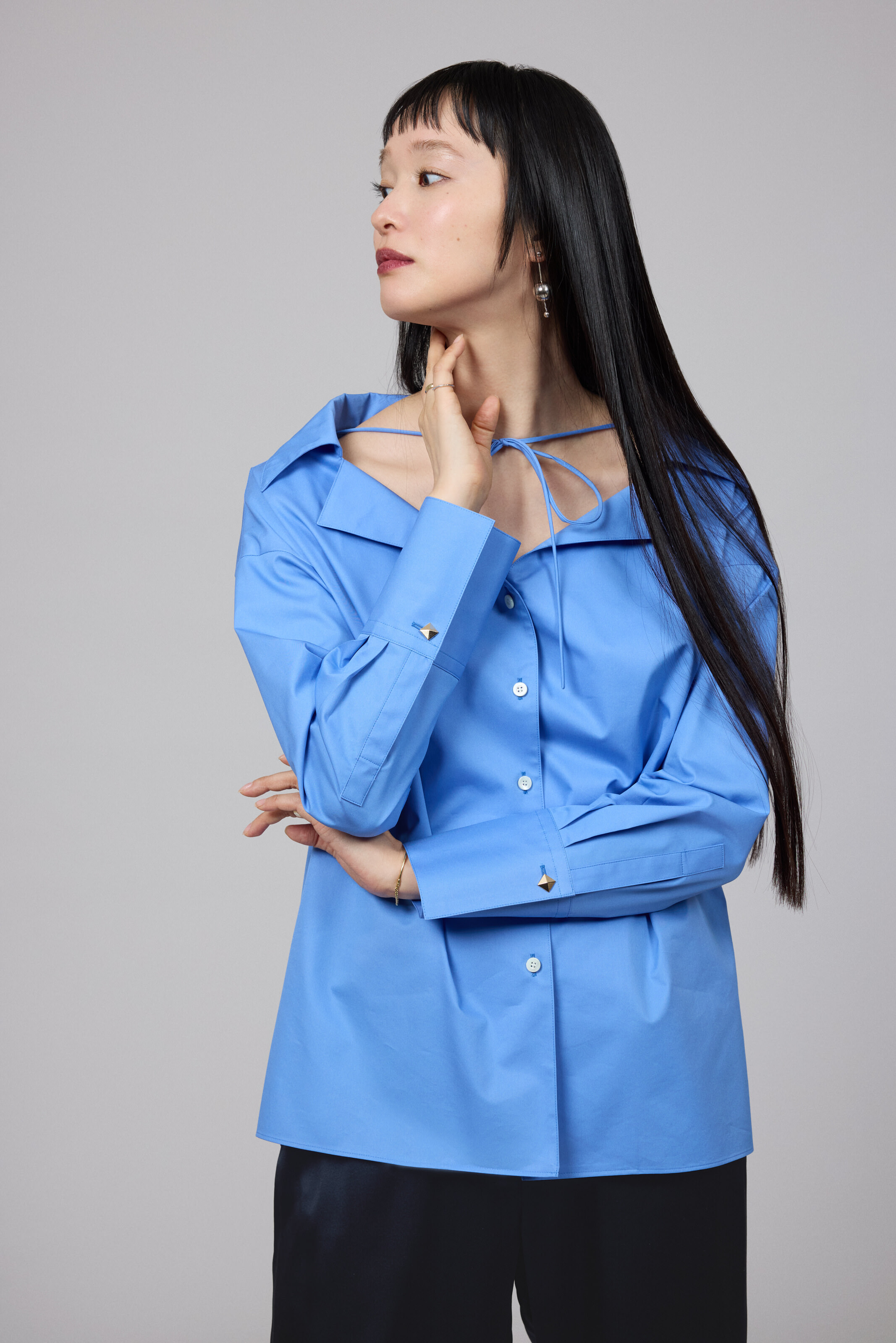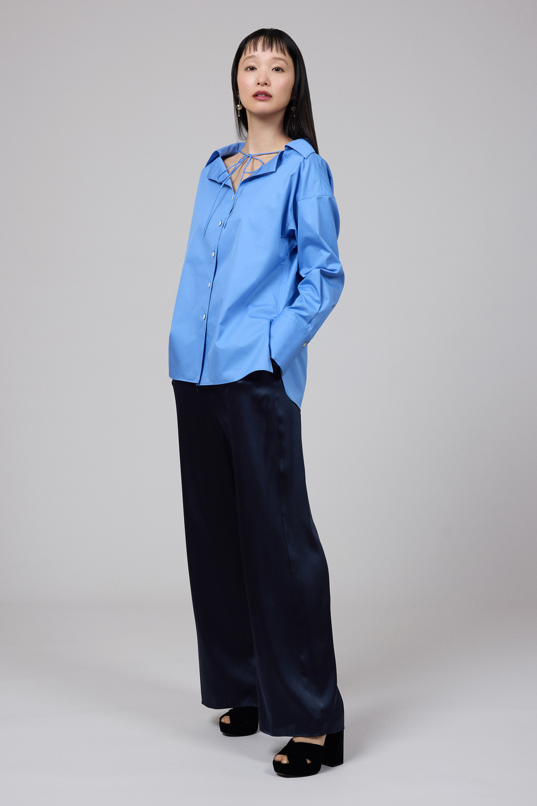 「このシャツブラウスは“肌見せスタイルを上品に”という望みを叶えてくれる1枚。胸もとのリボンタイが効いていて、デコルテを綺麗に見せてくれます。とにかく暑い最近の夏にもぴったり」。合わせたのは上品な光沢感が美しいシルクサテンのパンツ。「サラっとした肌触りで、履いていてすごく気持ちがいい!ウエストもゴム仕様なので、スタイリングに合わせて腰を落として履くこともできる。これからの季節に毎日履きたくなります」。シルエットに並々ならぬこだわりがあるという萬波さん。「和裁士だった祖母からの教えで、仕立てが良く、長く愛せる服かどうかを大事な基準にしています。このシャツブラウスもパンツも、身体のラインを全部は拾わず素敵に補完してくれるシルエット。女性の身体を綺麗に見せたいという思いが伝わってくるような服です」。さらりと着こなしたシンプルなスタイルでもキマるのは、シルエットが美しいからこそ。ベルベットのサンダルでモードなタッチを加えてコーディネイトが完成!