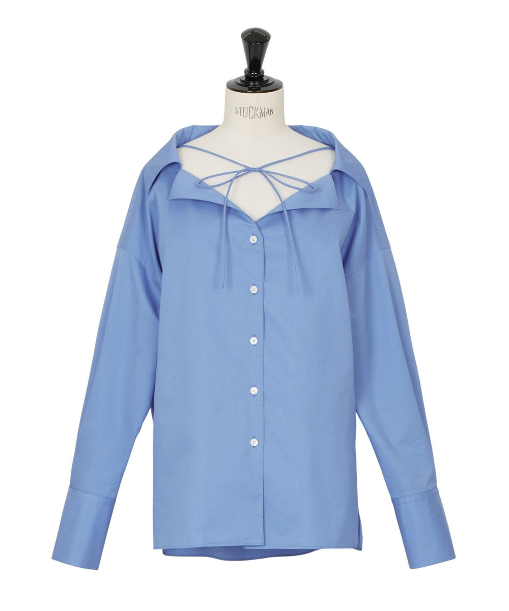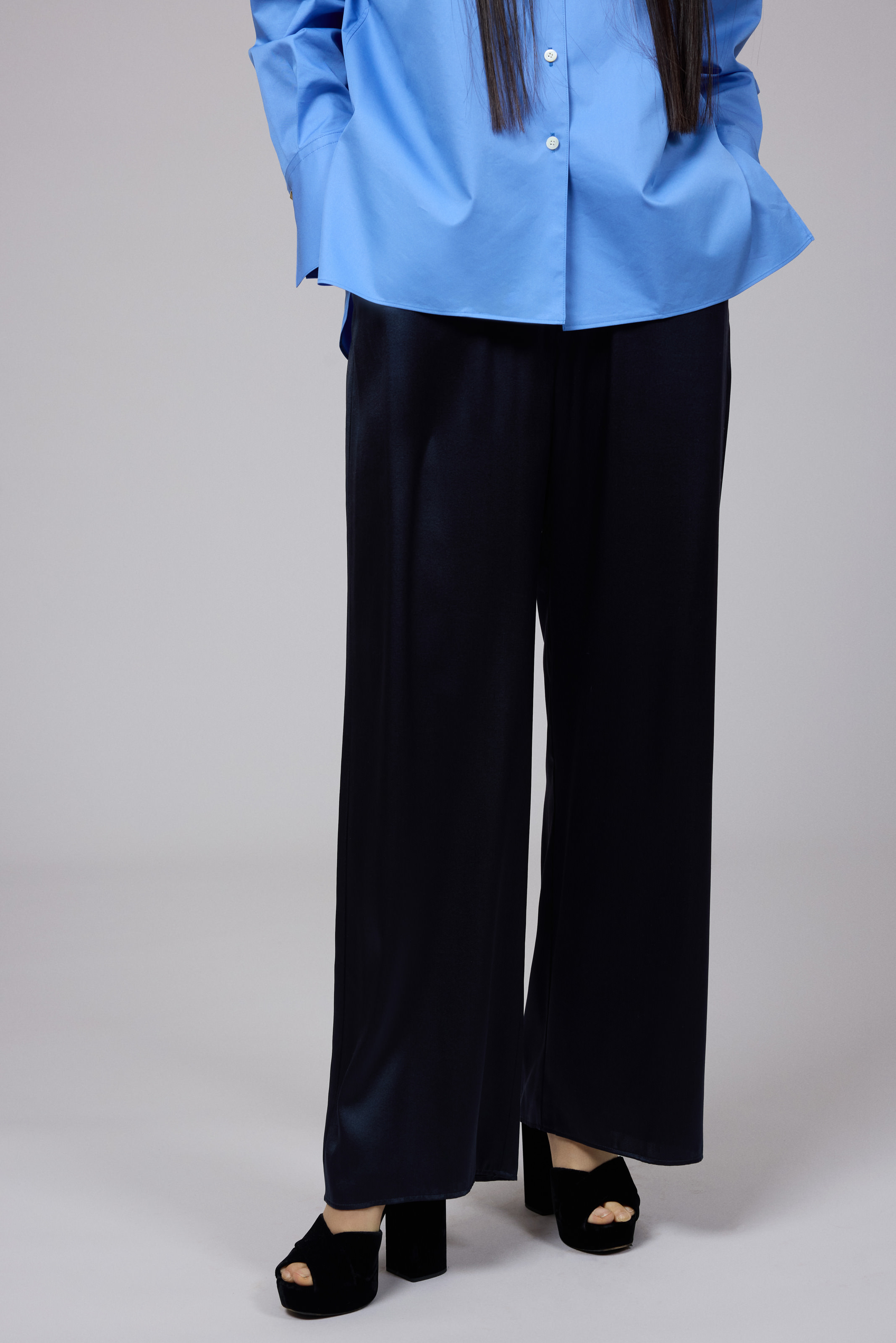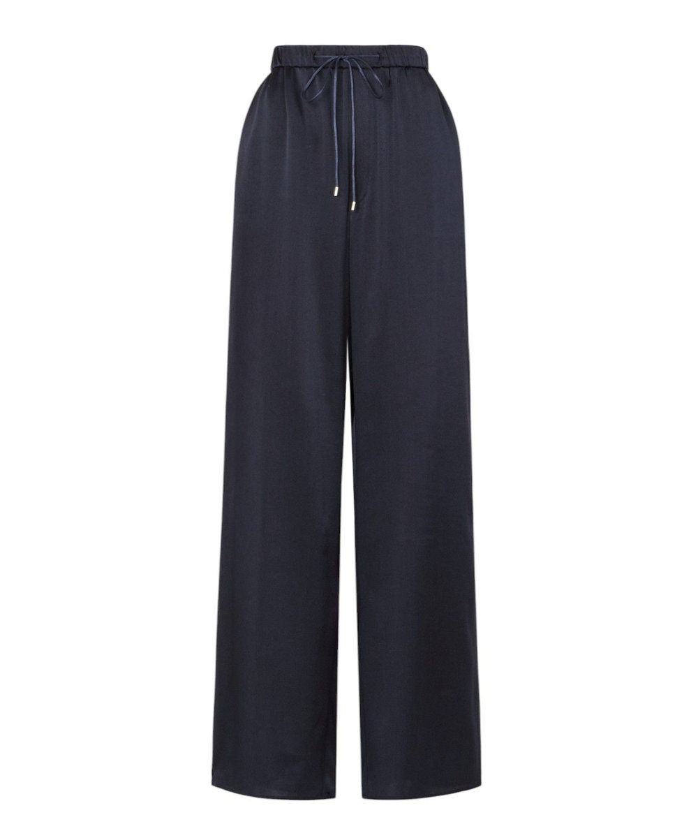 「このシャツブラウスは“肌見せスタイルを上品に”という望みを叶えてくれる1枚。胸もとのリボンタイが効いていて、デコルテを綺麗に見せてくれます。とにかく暑い最近の夏にもぴったり」。合わせたのは上品な光沢感が美しいシルクサテンのパンツ。「サラっとした肌触りで、履いていてすごく気持ちがいい!ウエストもゴム仕様なので、スタイリングに合わせて腰を落として履くこともできる。これからの季節に毎日履きたくなります」。シルエットに並々ならぬこだわりがあるという萬波さん。「和裁士だった祖母からの教えで、仕立てが良く、長く愛せる服かどうかを大事な基準にしています。このシャツブラウスもパンツも、身体のラインを全部は拾わず素敵に補完してくれるシルエット。女性の身体を綺麗に見せたいという思いが伝わってくるような服です」。さらりと着こなしたシンプルなスタイルでもキマるのは、シルエットが美しいからこそ。ベルベットのサンダルでモードなタッチを加えてコーディネイトが完成!