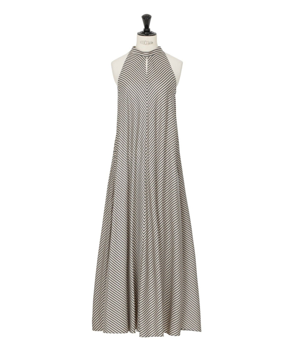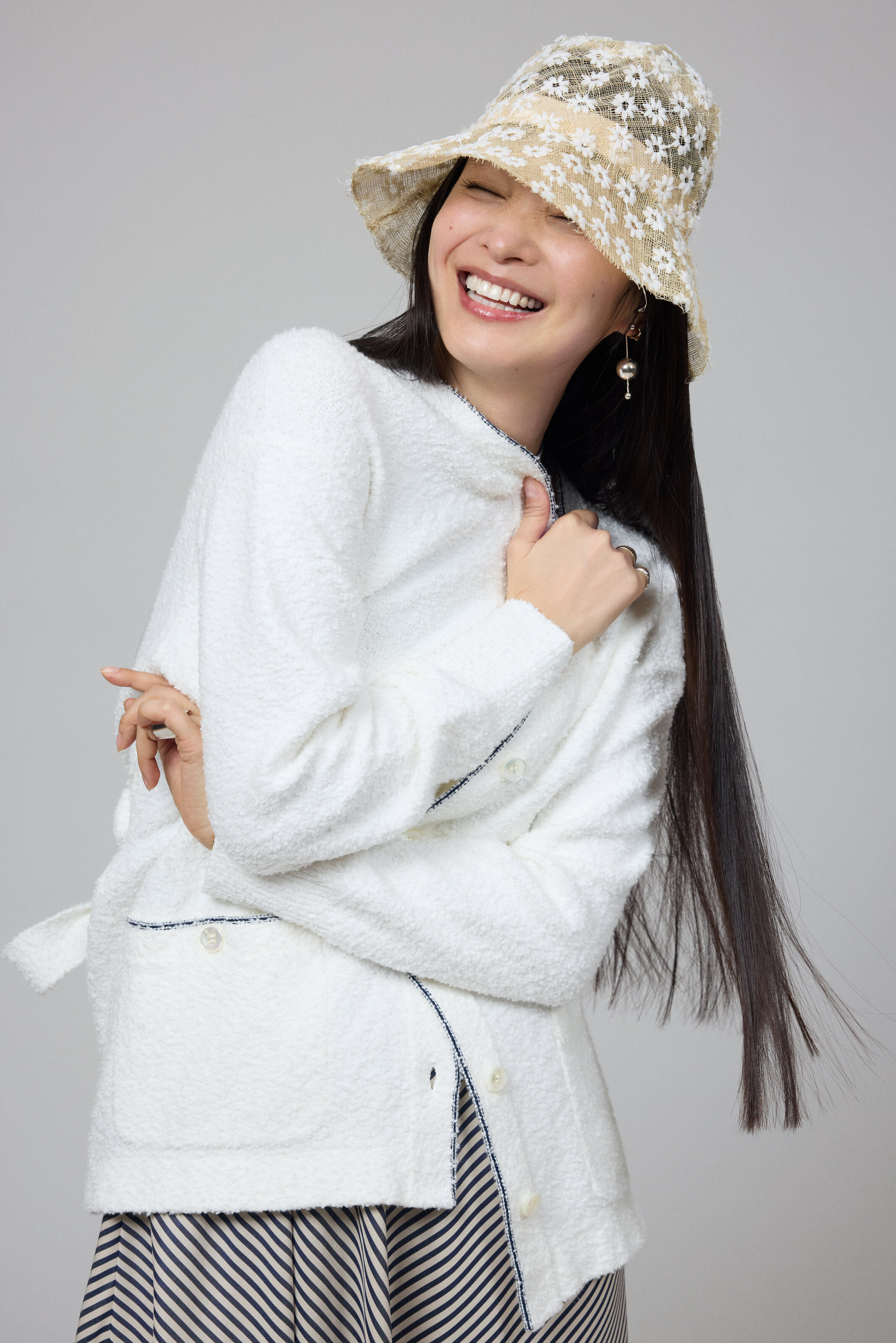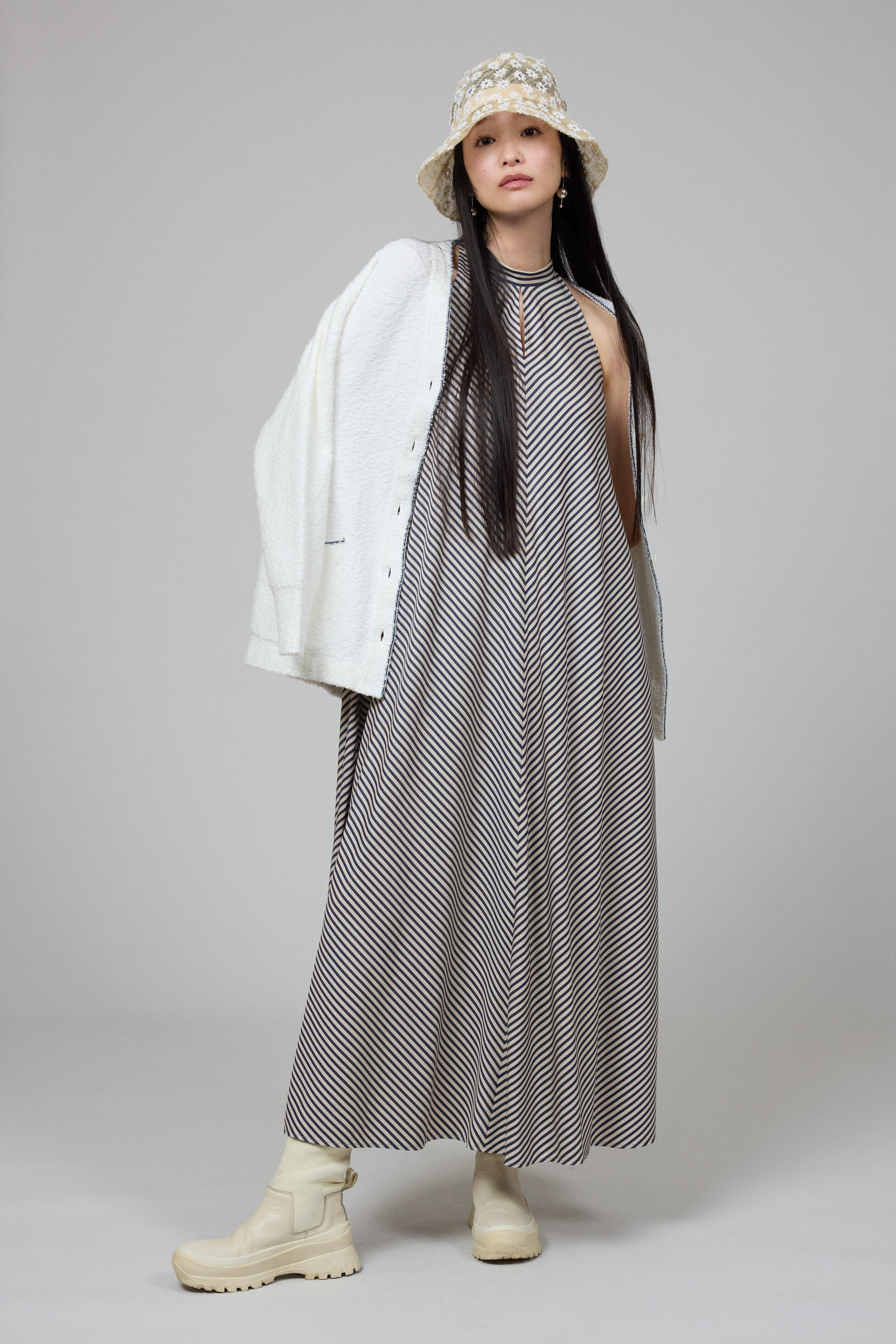 「私の街、私の人生」をテーマにコレクションを繰り広げるSA VILLE / SA VIE。今季の舞台であるフランス北西部のノルマンディー地方にある高級リゾート地、ドーヴィルの街にもぴったりのコーディネイトを提案してくれた萬波さん。「素材がしっかりしていて布感もたっぷりのストライプ柄ワンピース。一見シンプルなのですが、胸もとにさりげなくスリットがポイントになっていたりと、ぱっと目を引く素敵なデザイン。程よくハリのある素材感も気持ちいいです」。シティにも映える一着だが、今回はリゾートを意識して、レトロシックなハットとスポーティなロングブーツをコーディネイトした萬波さん。「海辺との親和性をイメージして、ライフジャケットの素材で作られたブーツで遊び心をプラスしてみました」。コーディネイトに合わせて、パイル地のカーディガンはさらりと羽織るだけ。それだけで抜け感のある雰囲気が漂う。