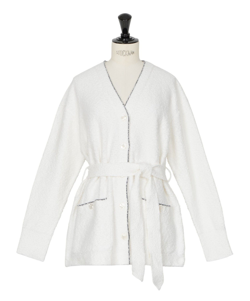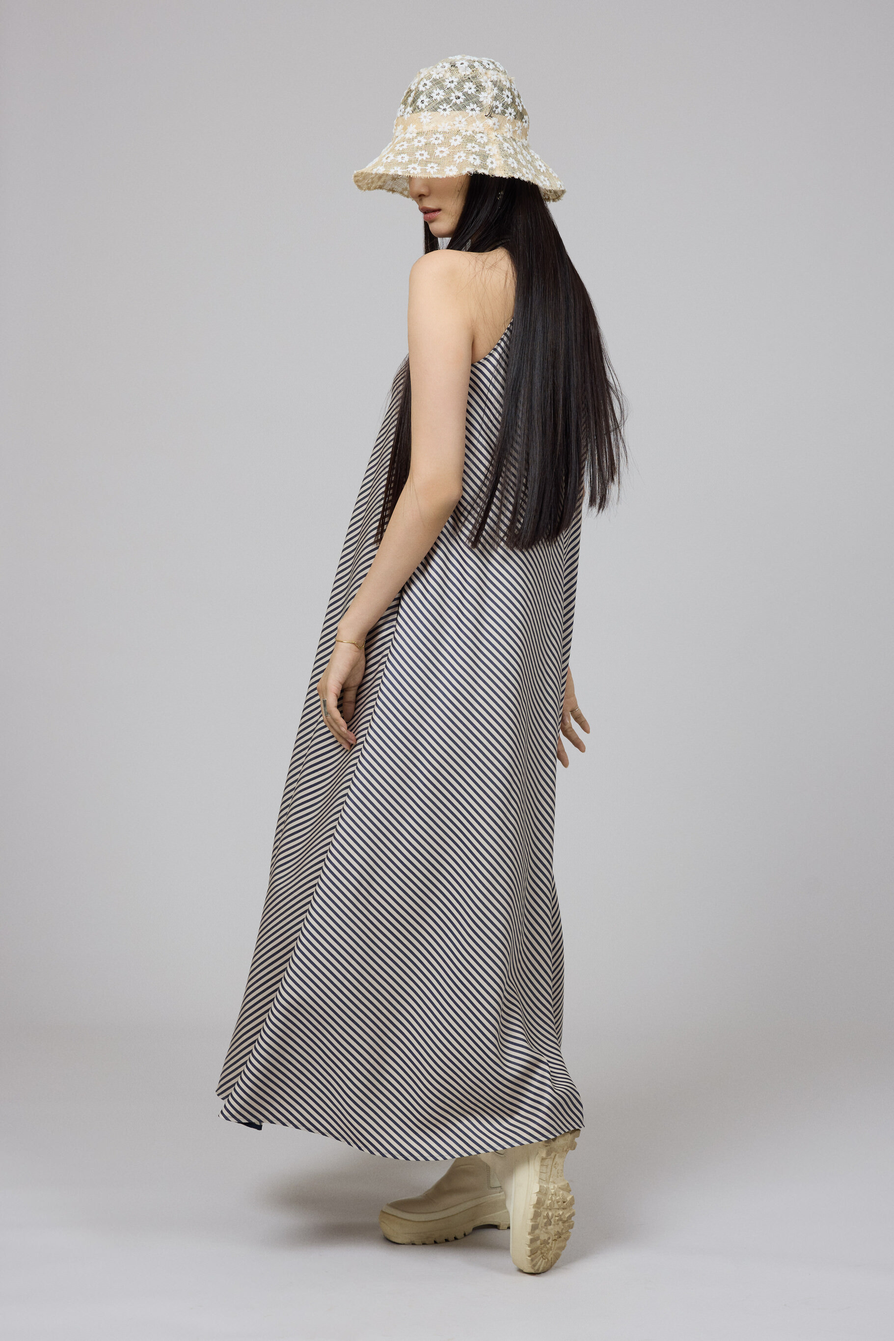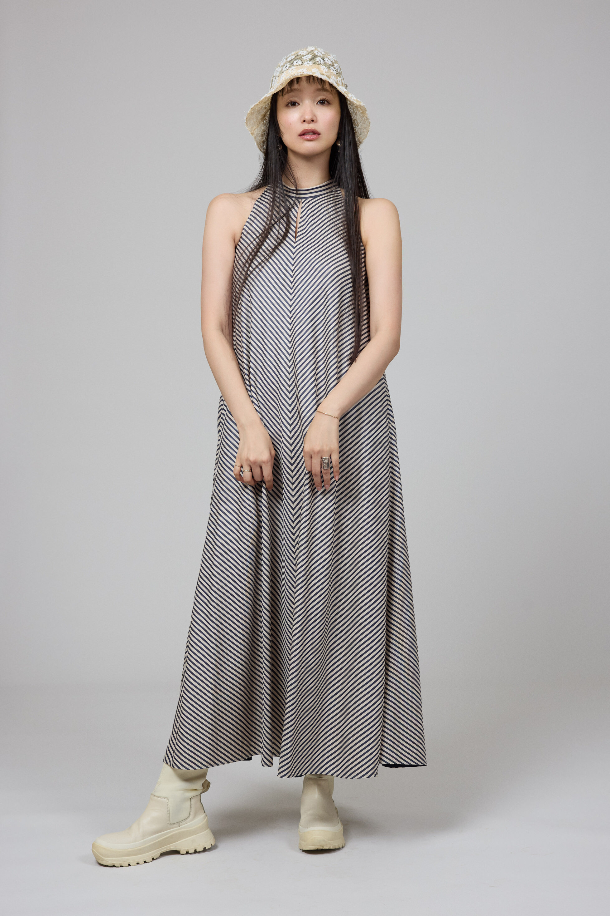 「私の街、私の人生」をテーマにコレクションを繰り広げるSA VILLE / SA VIE。今季の舞台であるフランス北西部のノルマンディー地方にある高級リゾート地、ドーヴィルの街にもぴったりのコーディネイトを提案してくれた萬波さん。「素材がしっかりしていて布感もたっぷりのストライプ柄ワンピース。一見シンプルなのですが、胸もとにさりげなくスリットがポイントになっていたりと、ぱっと目を引く素敵なデザイン。程よくハリのある素材感も気持ちいいです」。シティにも映える一着だが、今回はリゾートを意識して、レトロシックなハットとスポーティなロングブーツをコーディネイトした萬波さん。「海辺との親和性をイメージして、ライフジャケットの素材で作られたブーツで遊び心をプラスしてみました」。コーディネイトに合わせて、パイル地のカーディガンはさらりと羽織るだけ。それだけで抜け感のある雰囲気が漂う。
