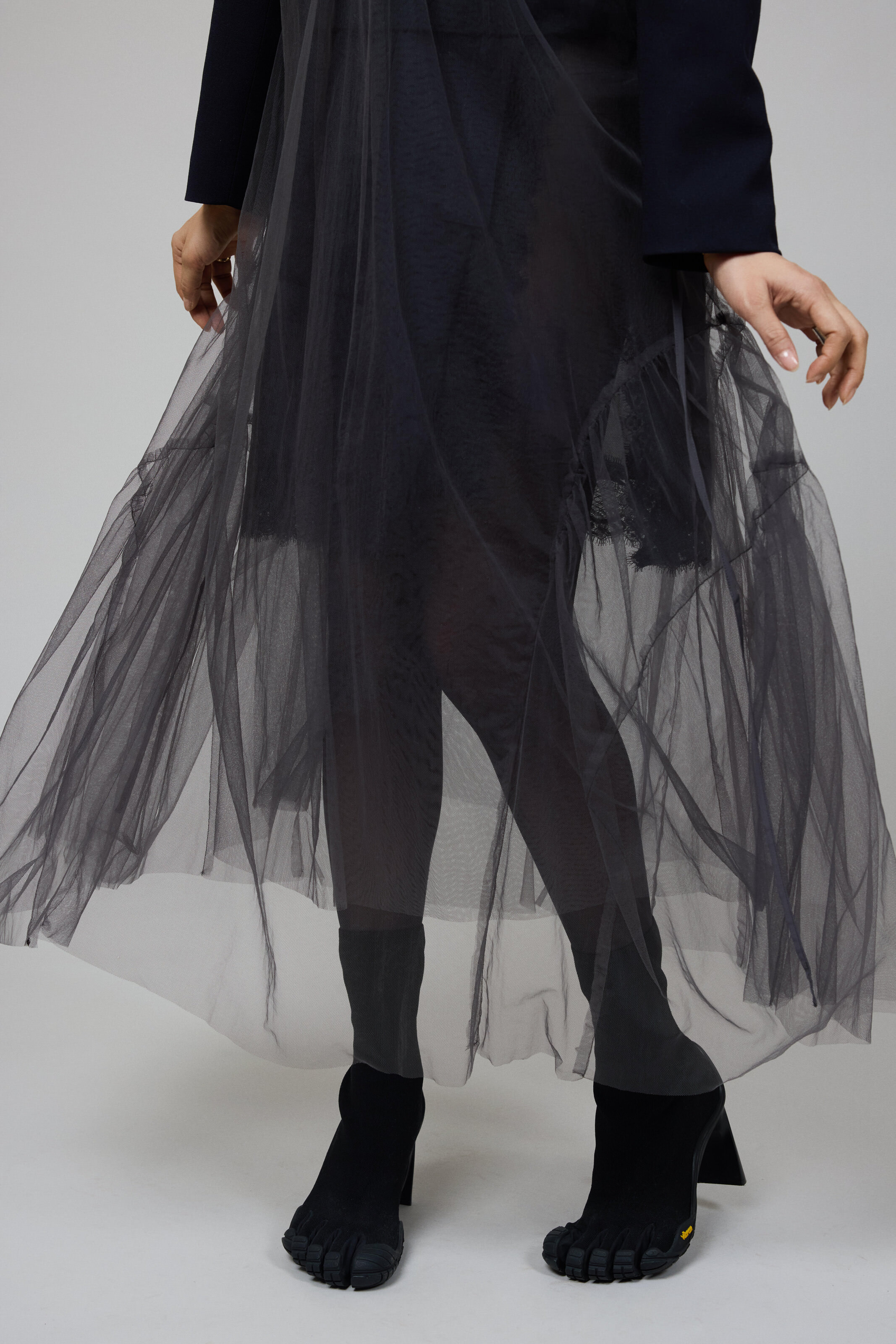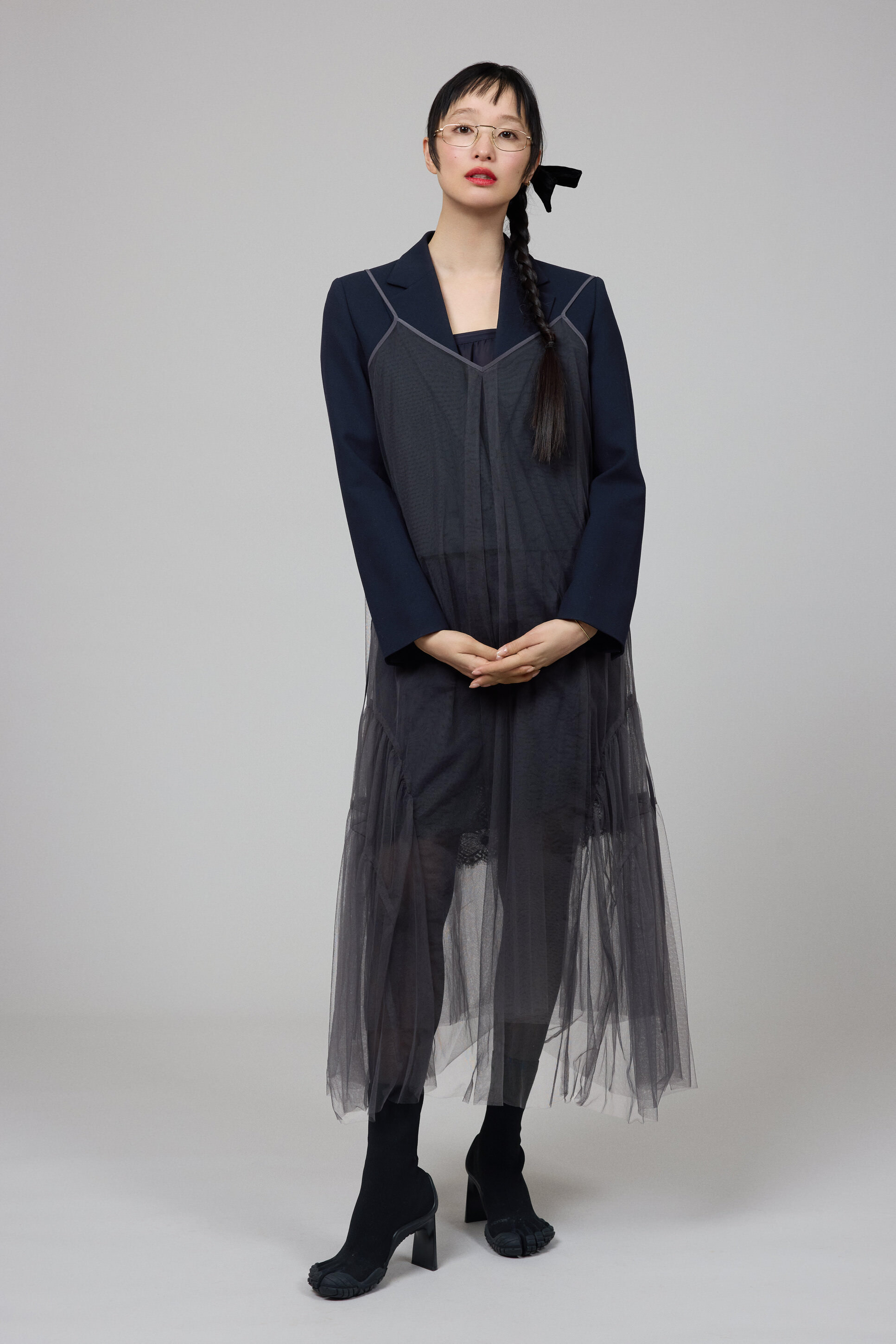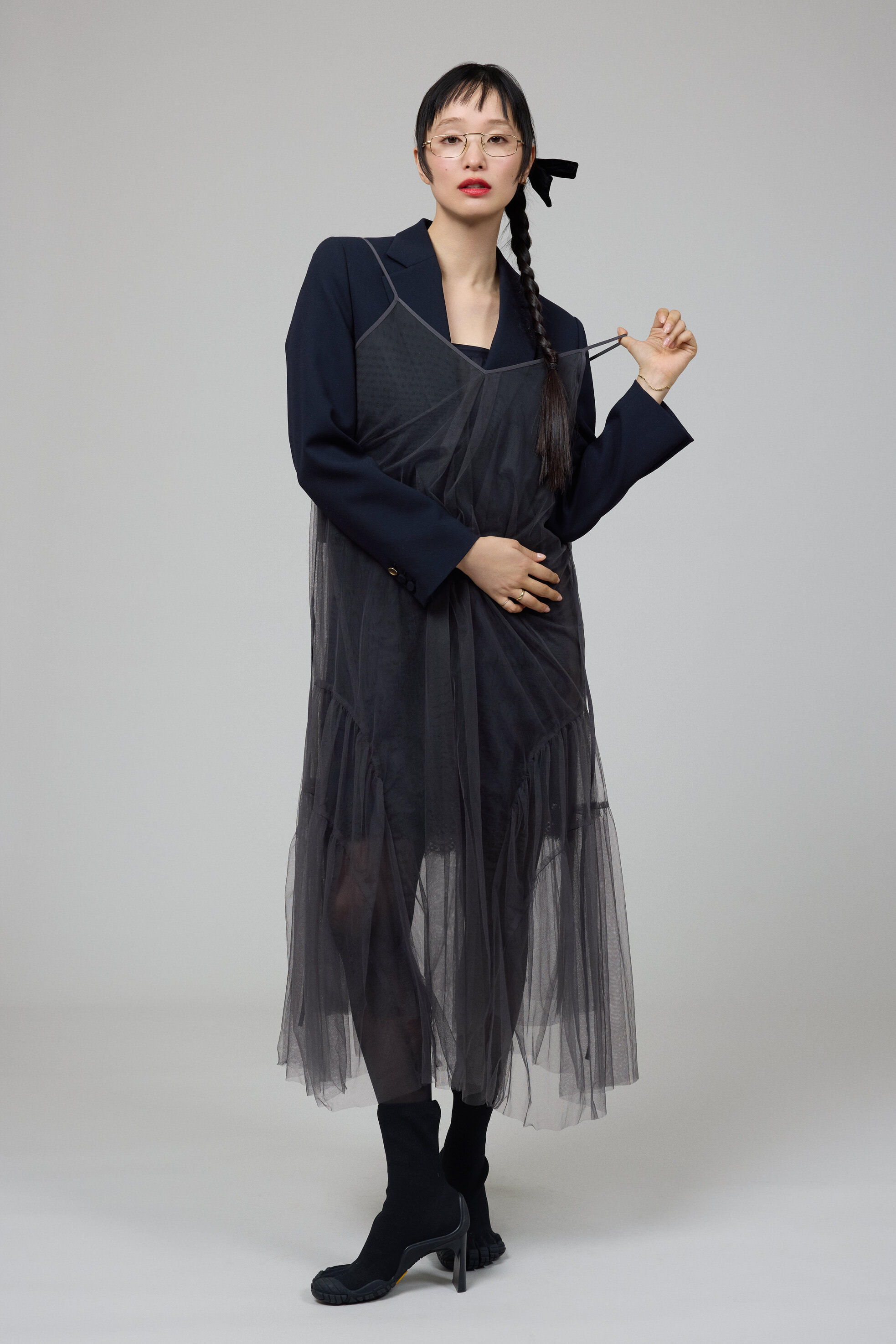 ショート丈のジャケットとラップスカートの上からチュールのドレスを重ねて、フレッシュなレイヤードスタイルを披露してくれた萬波さん。「フランスのオタクの女の子をイメージしたコーディネイトは、カッチリしつつもスイートでチャーミングさを意識。でもやっぱり、どこかハズしたいのでビブラムソールの5本指ソックスブーツを合わせました」。既存のルールに囚われない自由な着こなしが彼女らしい。「すれ違った人が「あれ、なんか素敵だったな?」と振り返ってしまうくらいの、ちょっとした意外性やいい意味での違和感あるコーディネイトを意識しています」。仕立てのよいジャケットを包みこむチュールのワンピースは、ニュアンスあるグレーをセレクト。「顔色を綺麗に見せてくれて、どんな雰囲気の人にも似合うニュアンスのある色ですね。リボン紐で、ラインにちょっとしたアレンジも加えることもできるので、色々な着こなしが楽しめそう」