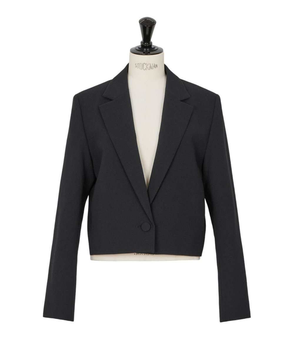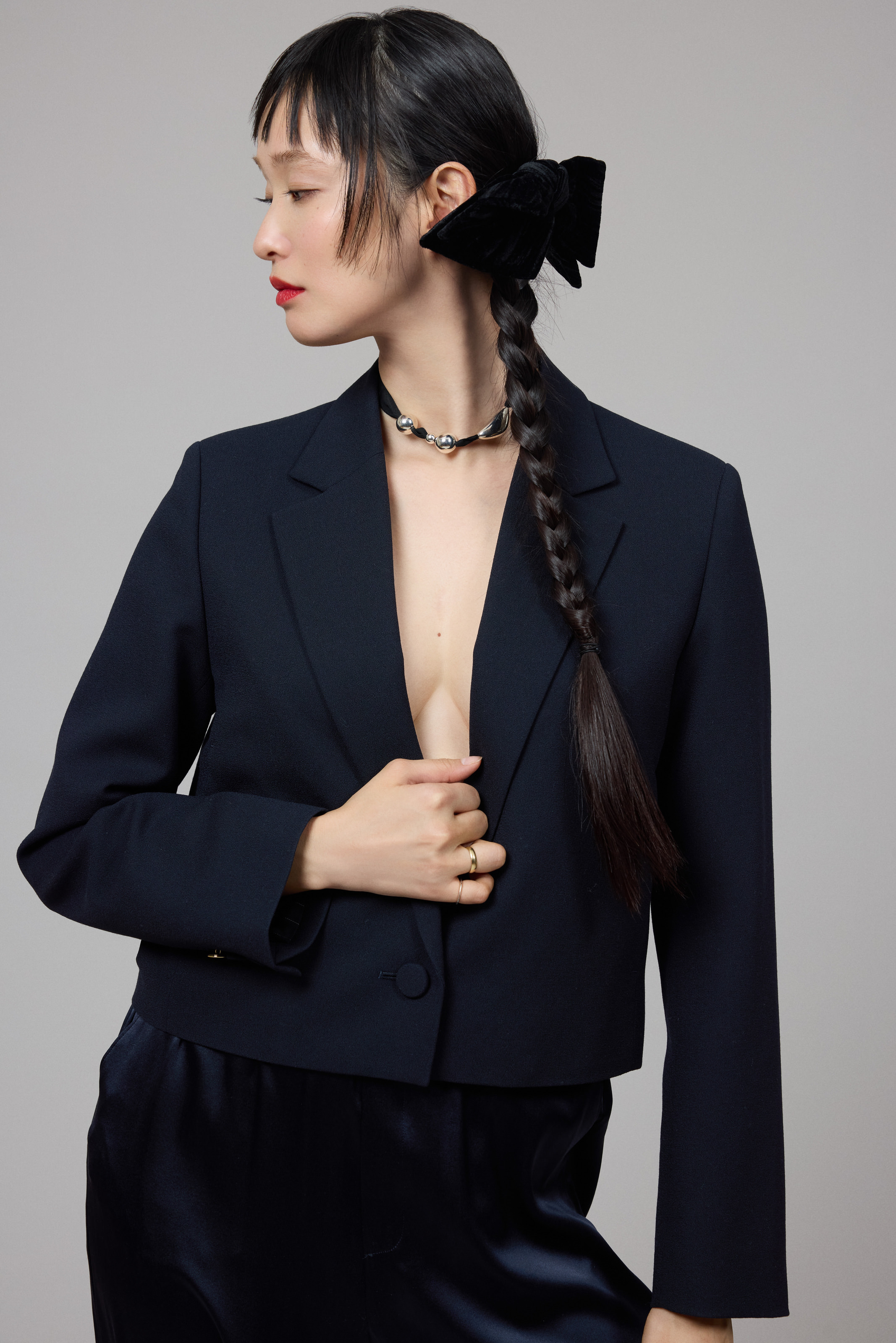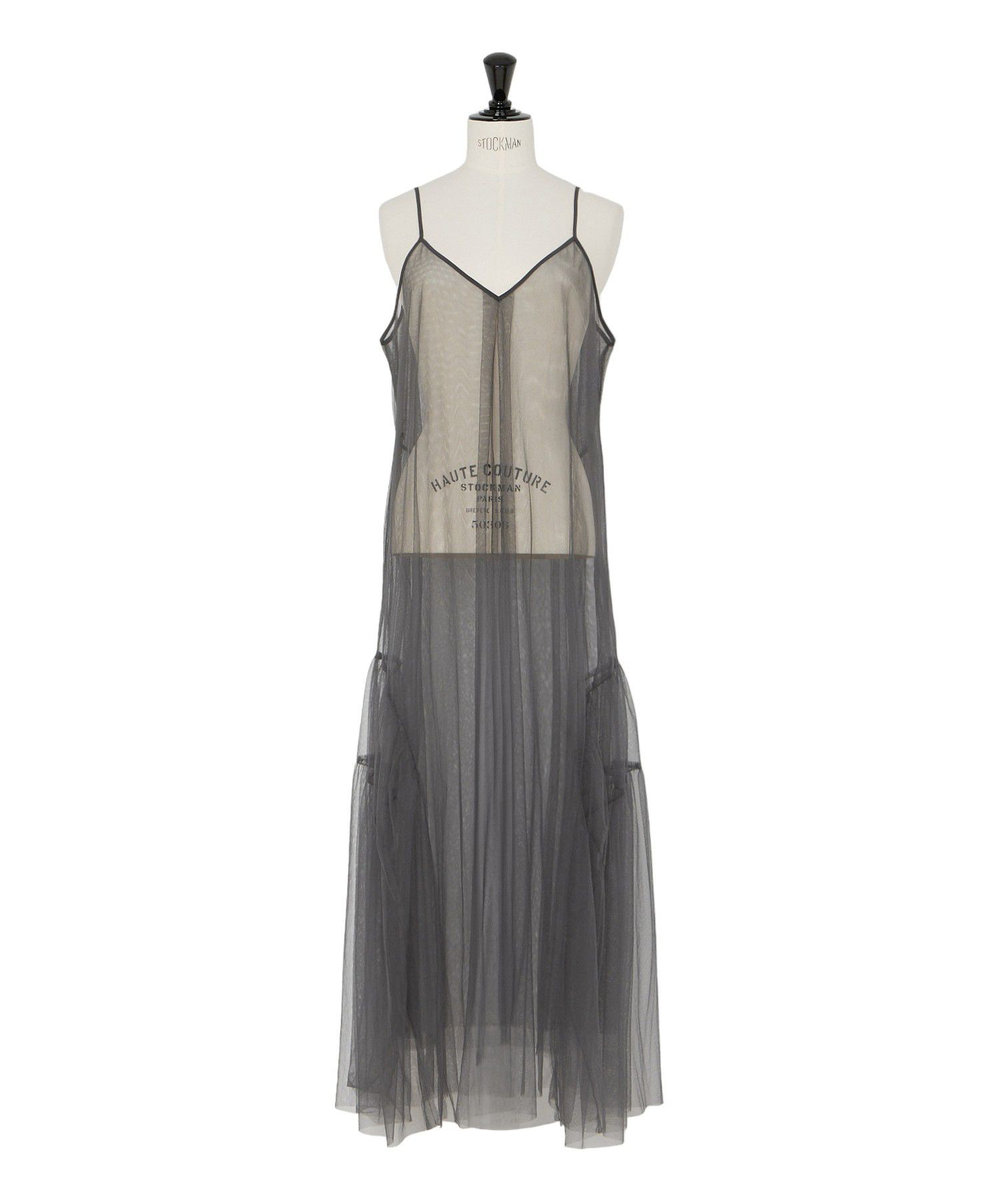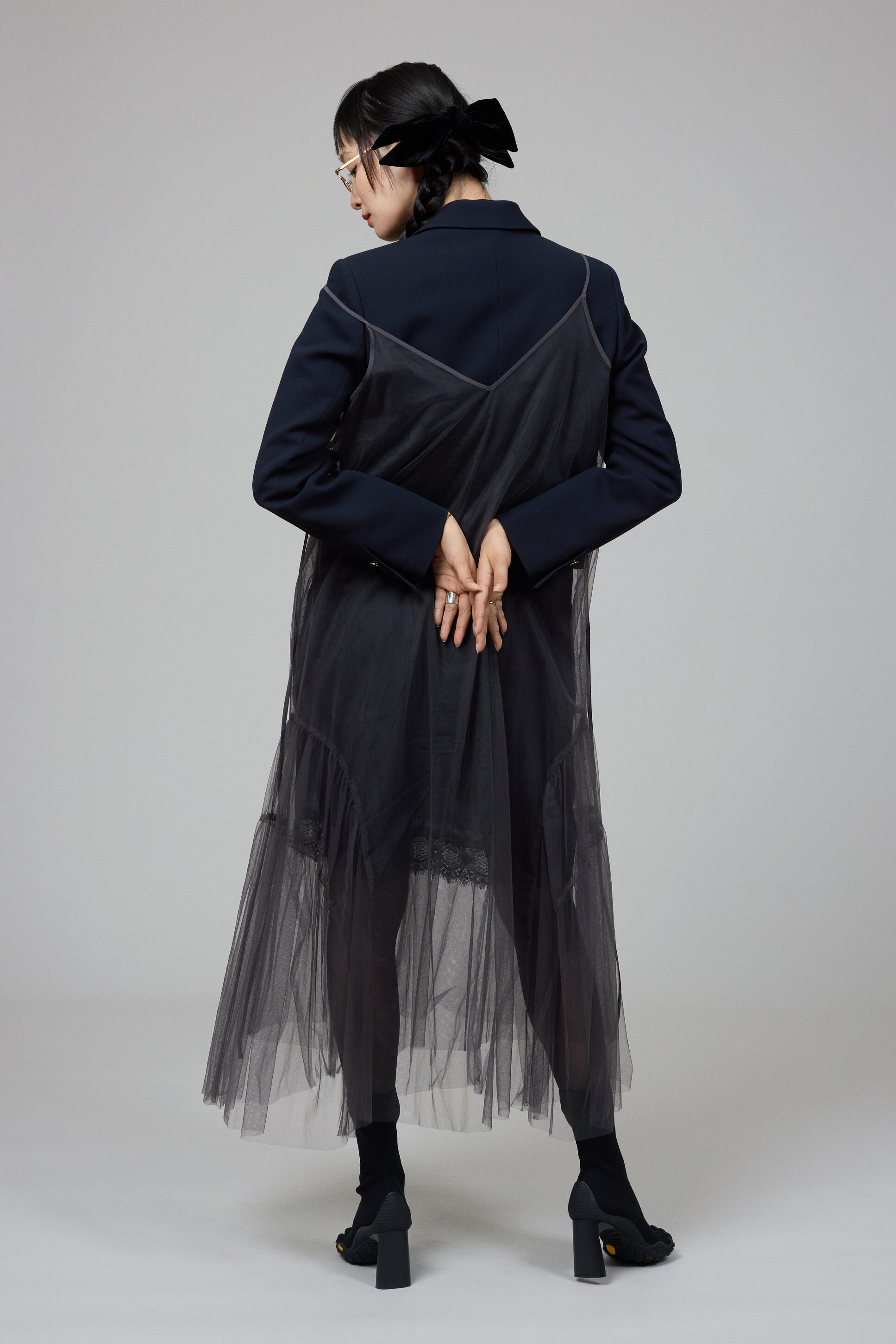 ショート丈のジャケットとラップスカートの上からチュールのドレスを重ねて、フレッシュなレイヤードスタイルを披露してくれた萬波さん。「フランスのオタクの女の子をイメージしたコーディネイトは、カッチリしつつもスイートでチャーミングさを意識。でもやっぱり、どこかハズしたいのでビブラムソールの5本指ソックスブーツを合わせました」。既存のルールに囚われない自由な着こなしが彼女らしい。「すれ違った人が「あれ、なんか素敵だったな?」と振り返ってしまうくらいの、ちょっとした意外性やいい意味での違和感あるコーディネイトを意識しています」。仕立てのよいジャケットを包みこむチュールのワンピースは、ニュアンスあるグレーをセレクト。「顔色を綺麗に見せてくれて、どんな雰囲気の人にも似合うニュアンスのある色ですね。リボン紐で、ラインにちょっとしたアレンジも加えることもできるので、色々な着こなしが楽しめそう」