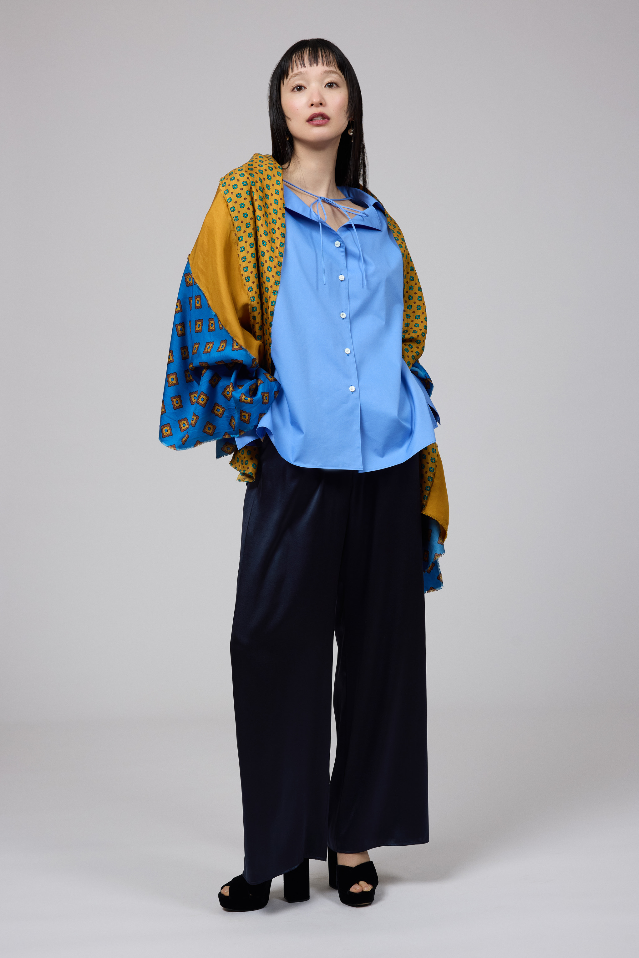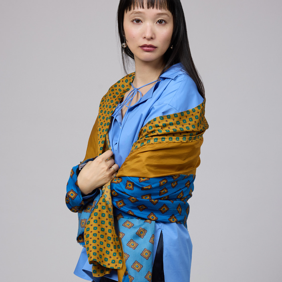 シンプルな着こなしを萬波さんらしく仕上げるのが、3種の柄をパッチワークしたヴィンテージのシルクスカーフ。上から羽織るだけで、シャツにも違った表情が漂う。「イタリアで働くテイラーの友人がプレゼントしてくれたもので、かれこれ10年くらい愛用しています。シャツブラウスのタイがややタイトだったので、今回は首に巻くよりも肩からサラッっと包み込むように。陽射しが強い時には頭に巻いたりと、いろんなシチュエーションで重宝しています。