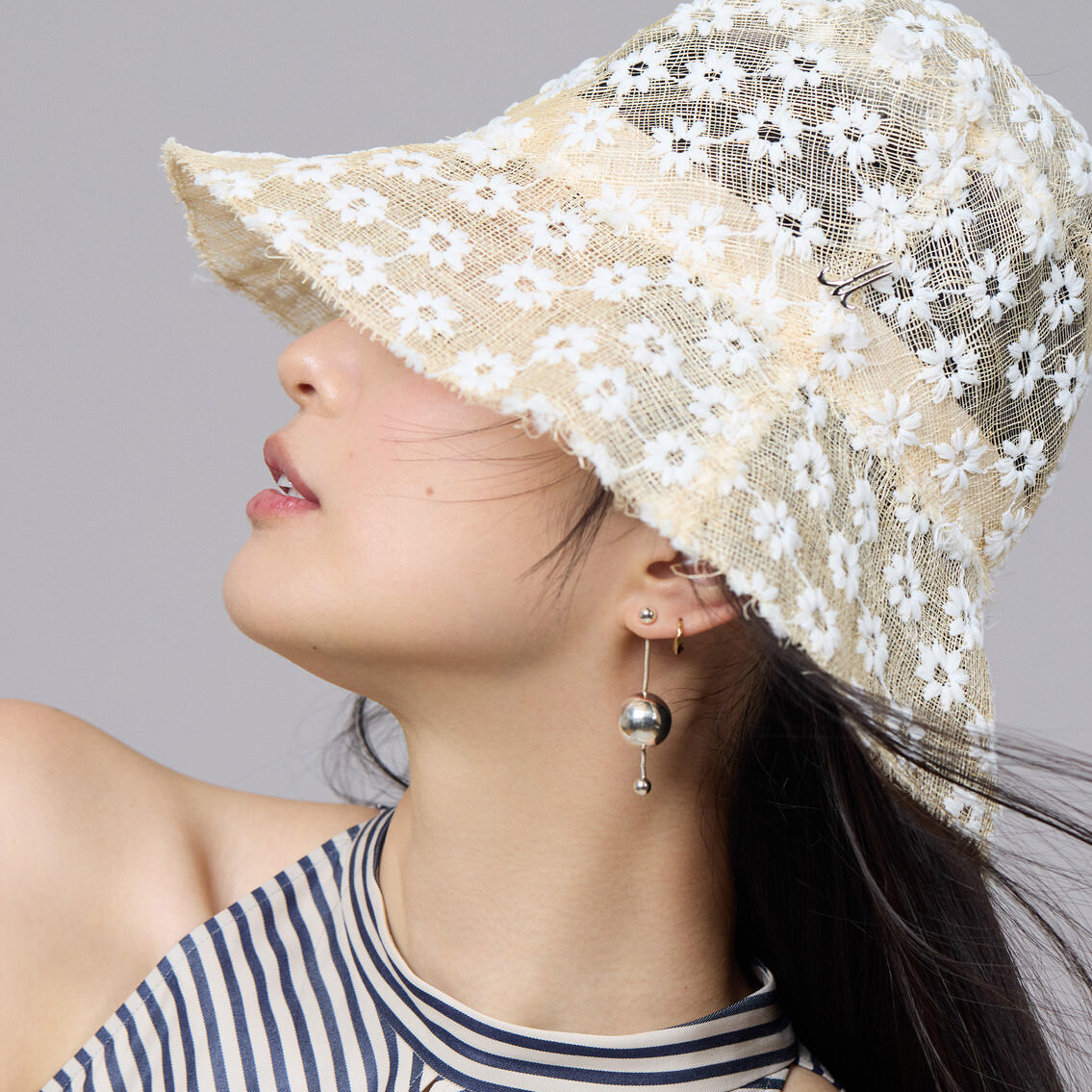 「おしゃれのモットーは、ポジティブな違和感」と話す萬波さん。そんな視点で選ぶアイテムは、素材やディテールなどに華やかなユーモアが漂うものばかり。目深にかぶったハットも、繊細なエンブロイダリーがあしらわれた透け感のあるデザインがポイントだ。「夏の陽射しの中でこのハットを被ると、肌にフラワーモチーフの影が落ちる。それがとても綺麗で気に入ってます。ちょっとしたニュアンスや遊び心を加えてコーディネイトすれば、自分らしいおしゃれがもっと楽しくなります」。