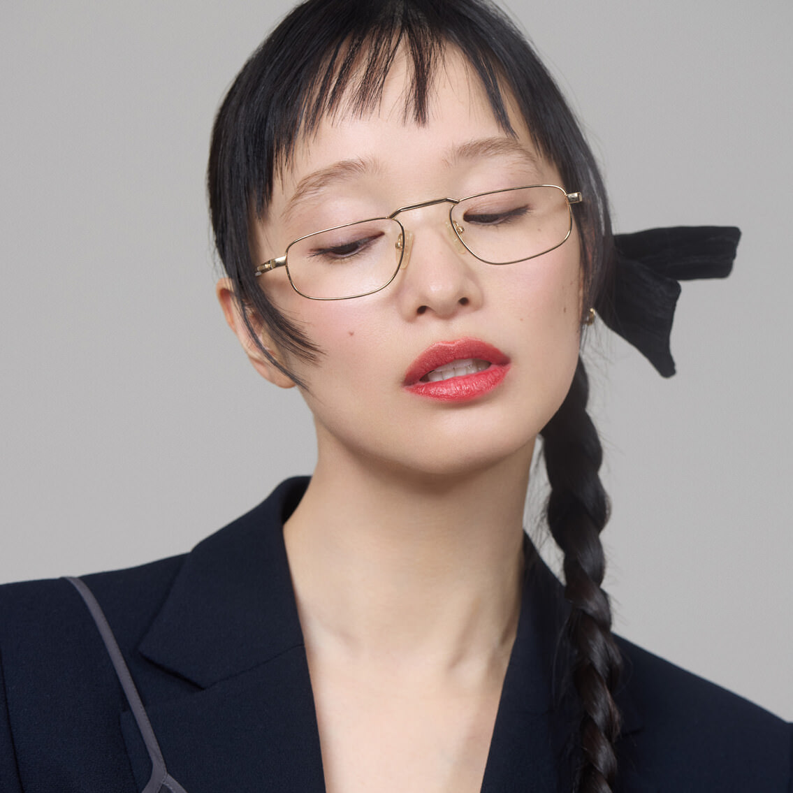 「服やスタイリングに思い入れがあると、イメージに合ったキャラクターが浮かんでくることがあります。今回の場合は、フランスのオタクガール」。リップを効かせたメイクにシルバーフレームの眼鏡、三つ編みのヘアにはリボンをつけて、コケティッシュななりきりスタイルが完成した。アクセサリーはその分引き算をしてミニマルに。全体のバランスを大人っぽくまとめた。