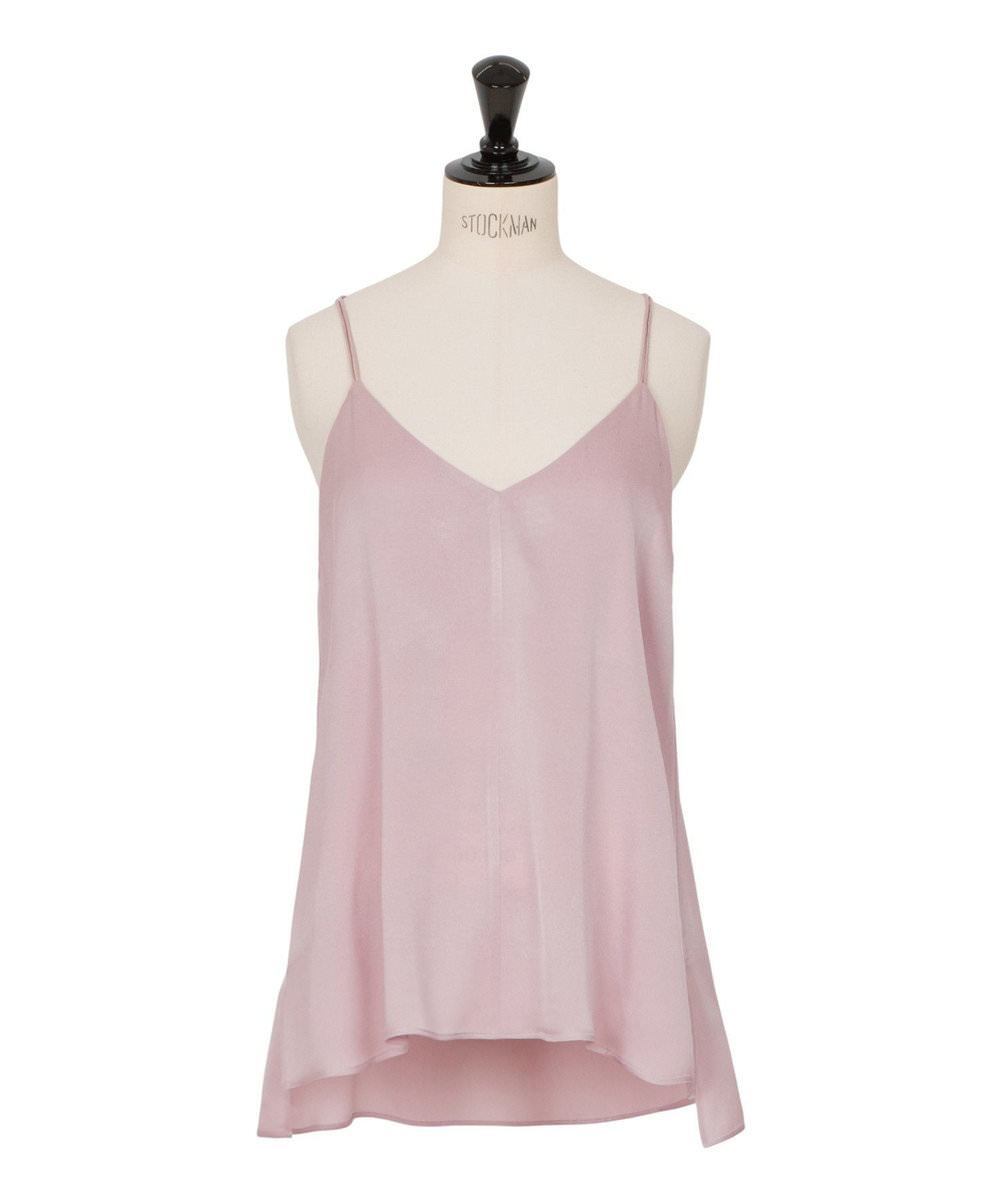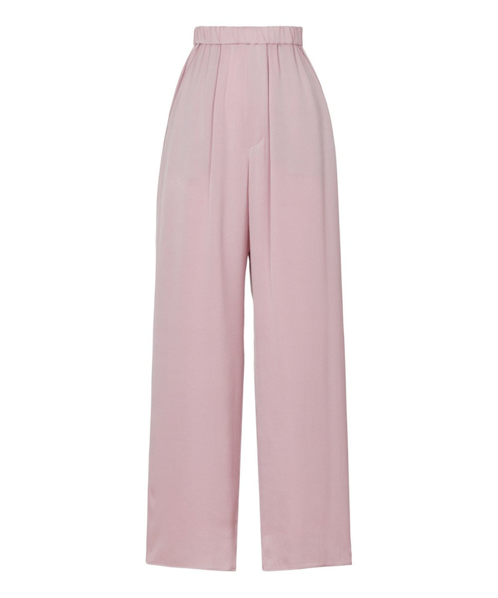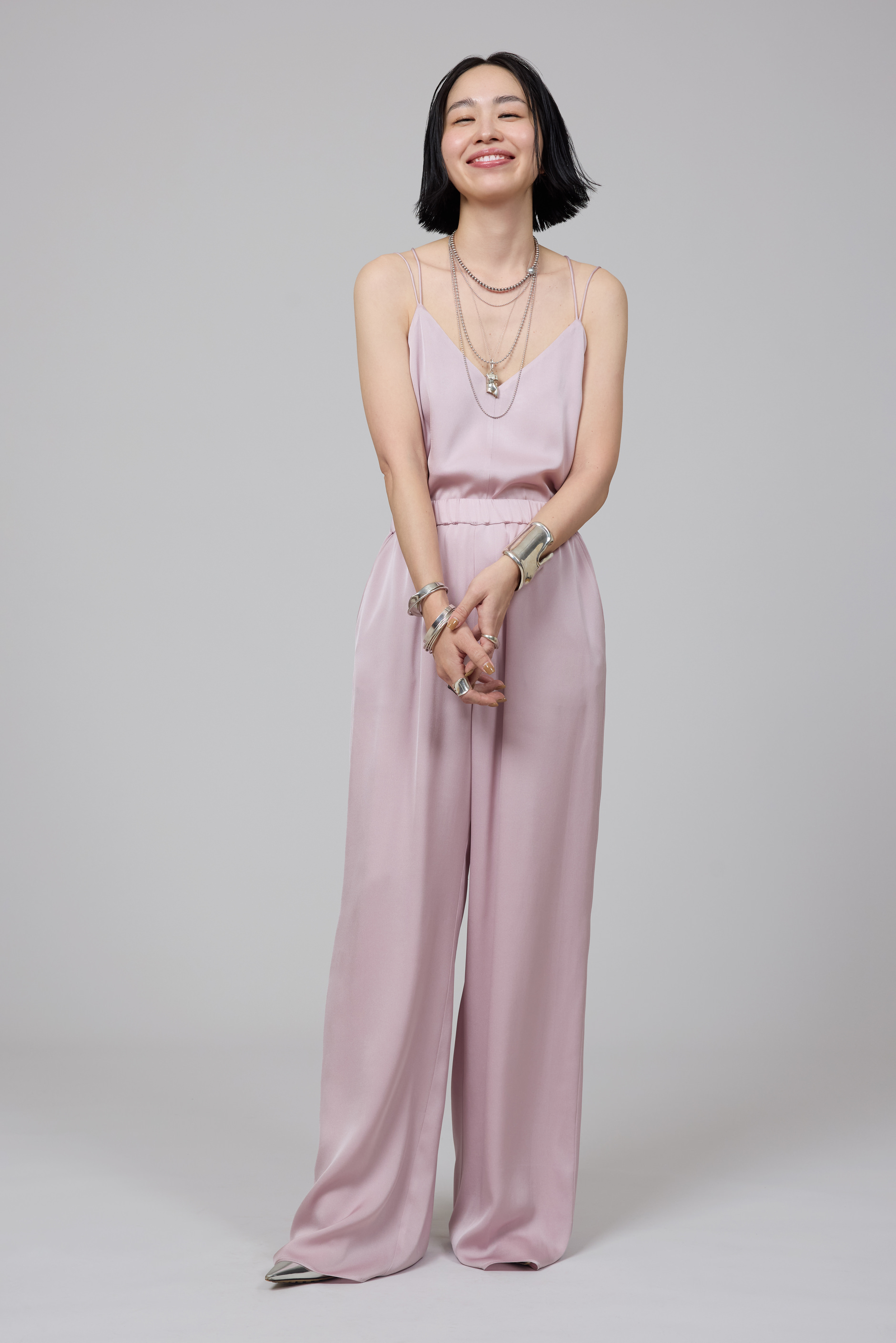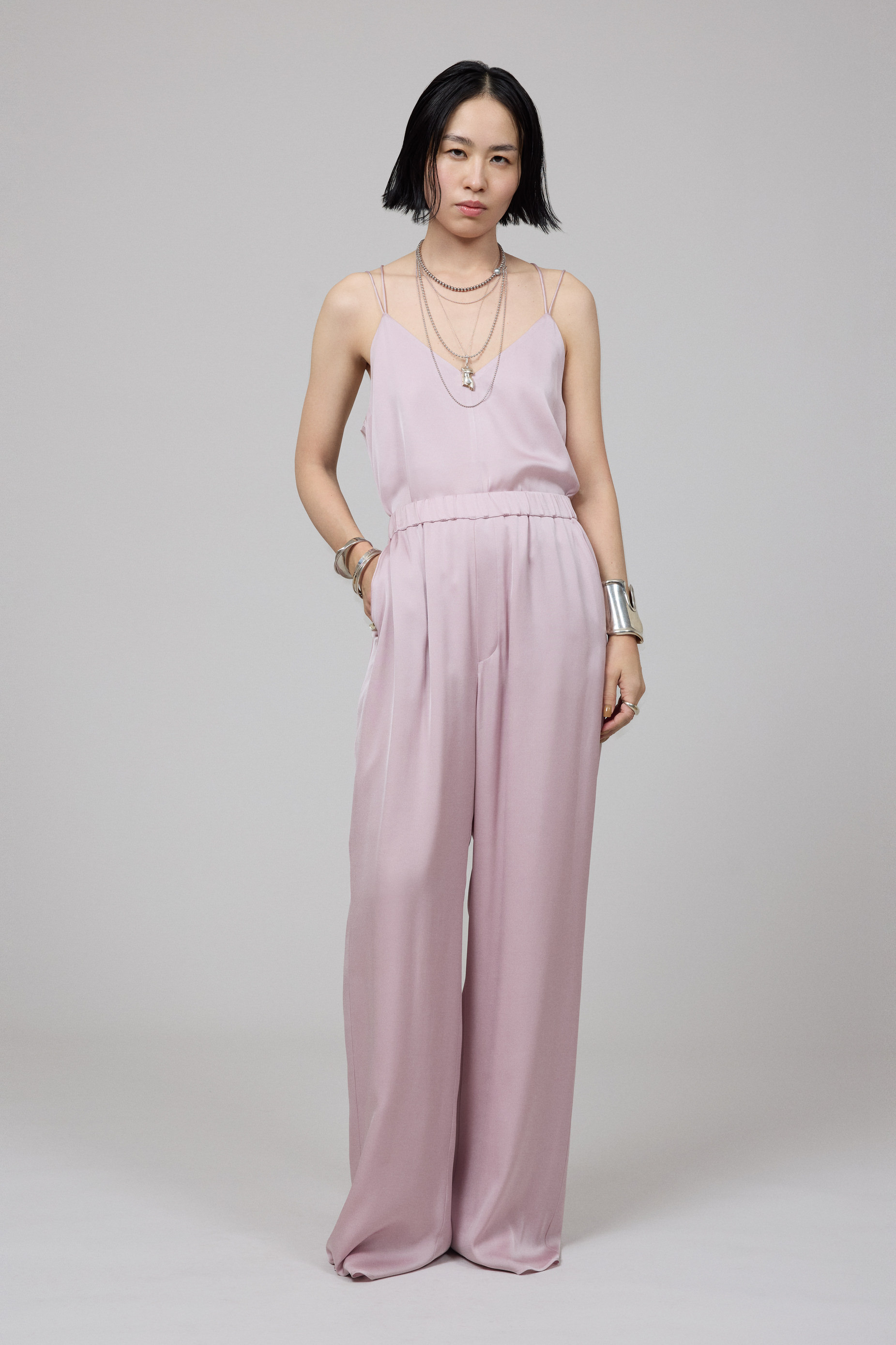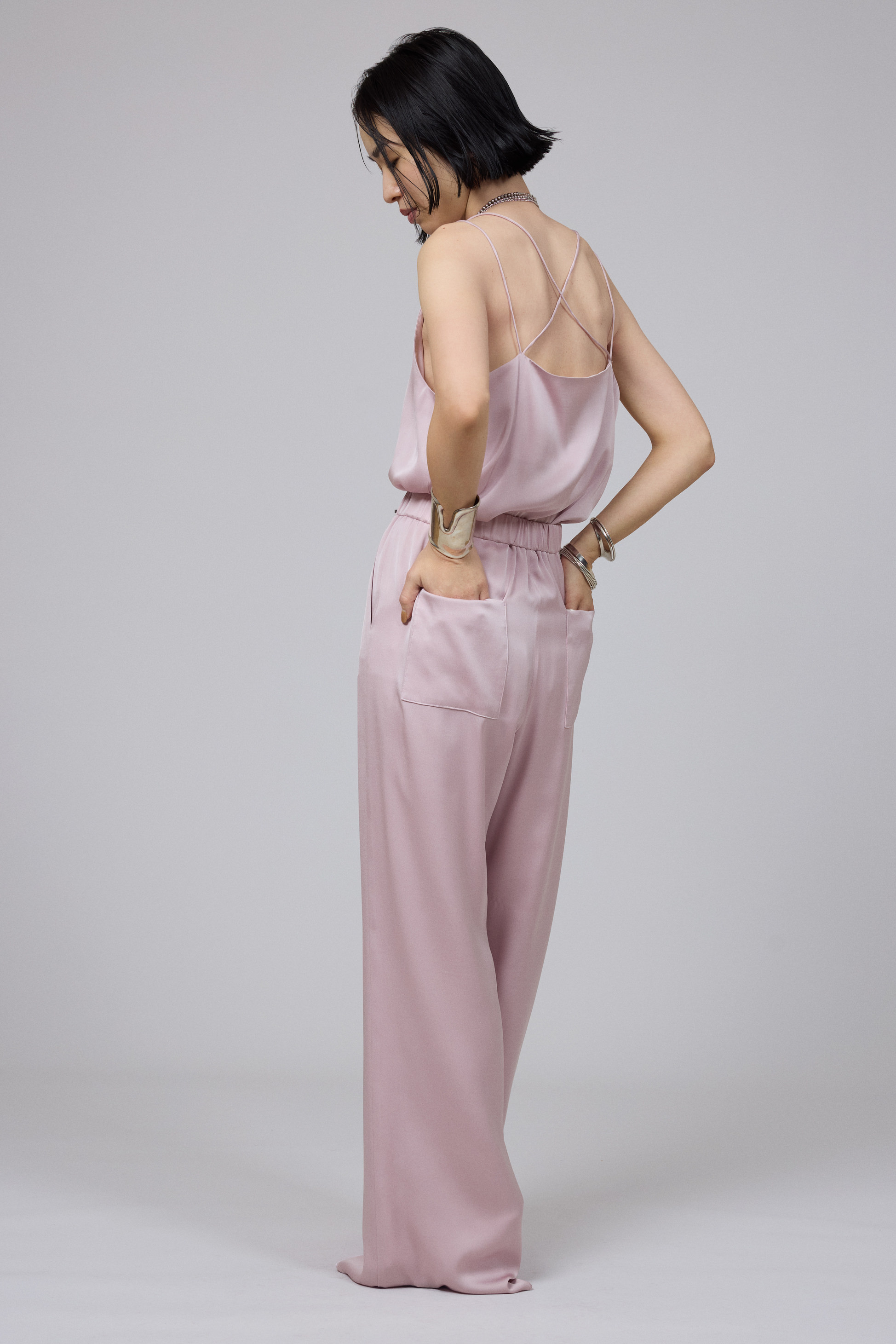 今季のSA VILLE / SA VIEのシーズンカラー、ダスティなピンクのアイテムをセットアップ気分で着こなした濱本さん。「強い女性像が好きなので、普段は優しいイメージのピンクを選ぶことはほぼないのですが、このくすんだペールトーンのピンクは、そんな私でも気負うことなく着れる色。肌をやさしく包むなめらかな素材で、着心地もとても良い。素材へのこだわりを実感しました」。胸もとが大きく開いたキャミソールは、デコルテが綺麗に見えるVネックのカッティングにもこだわっている。「肌見せスタイルは、女性らしさを強調するよりもヘルシーに見せたい」と、さらりと着こなす姿はボディが最高のアクセサリー。「好きな服を着てかっこよくおしゃれを楽しむために、エクササイズなどで自分に厳しくボディラインを作り込んでいます」。重ね付けしたジュエリーと同じシルバーカラーのポインテッドトゥのパンプスで、スウィート過ぎない大人のピンクコーデが仕上がった。