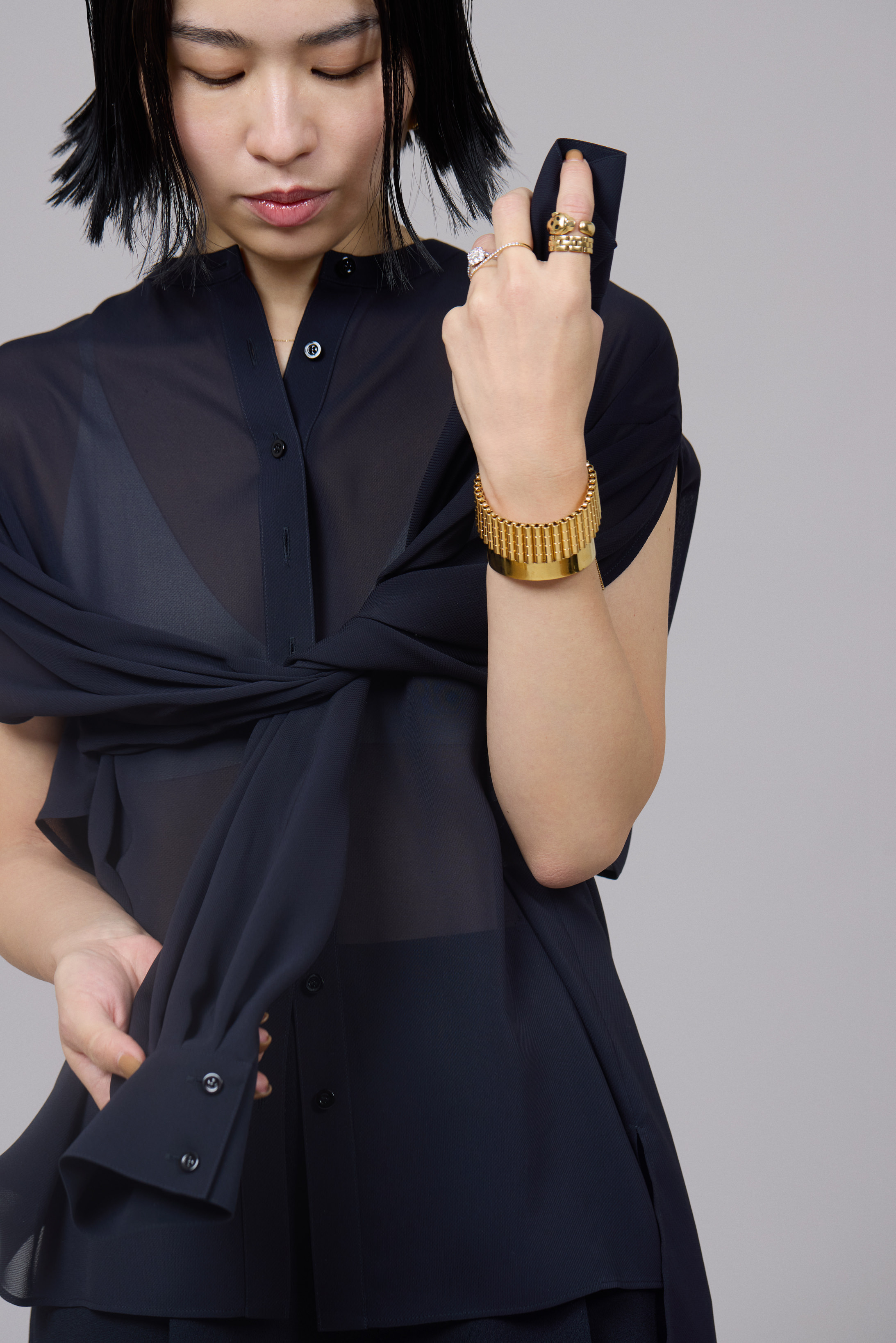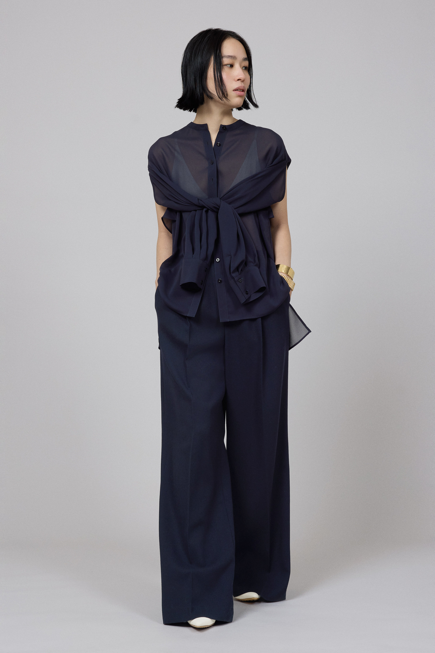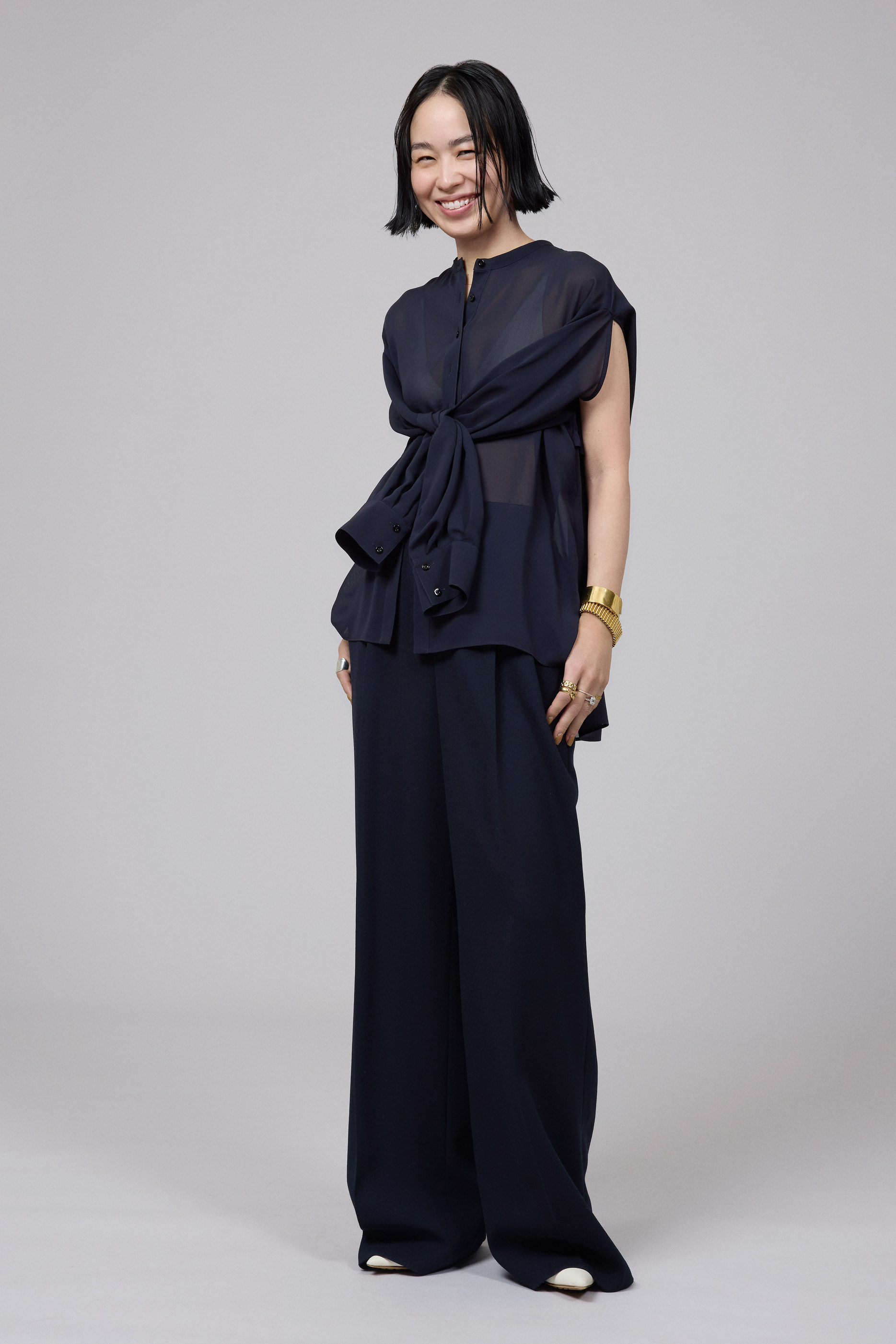続いて濱本さんは、ネイビーが知的な印象漂う、上品な透け感のあるブラウスをセレクト。シンプルなスタンドネックのロングスリーブブラウスだが、濱本さんはバックのアームホールから腕を出して袖を結び、ノースリーブトップのような着こなしを提案。合わせたシルクサテンのパンツは、ツヤ感とソフトな風合いが特長だ。「パンツは、美しくストンと落ちるシルエット。リラックスした履き心地ですが、きれいめに着こなせるのが魅力」。ジュエリーはネイビーと好相性のゴールドで統一。ここでも濱本さんらしく、存在感のあるアイテム同士をコーディネイト。「服が柔らかい印象やシンプルな時は、ジュエリーで強さが出るものを加えるのがマイルール。逆に、服の印象が強い時には、ジュエリーの主張を少し抑えるようにして、自分らしいスタイルを心がけています」。オリジナリティあふれる服とジュエリーとのバランスで、媚びないけれどしなやかなハンサムスタイルが完成。