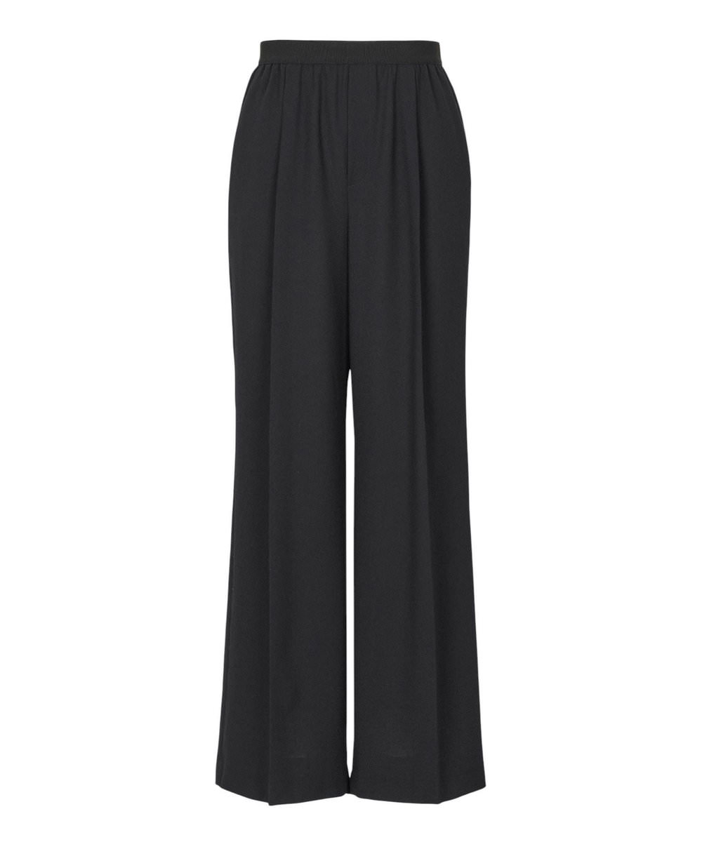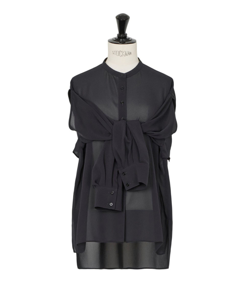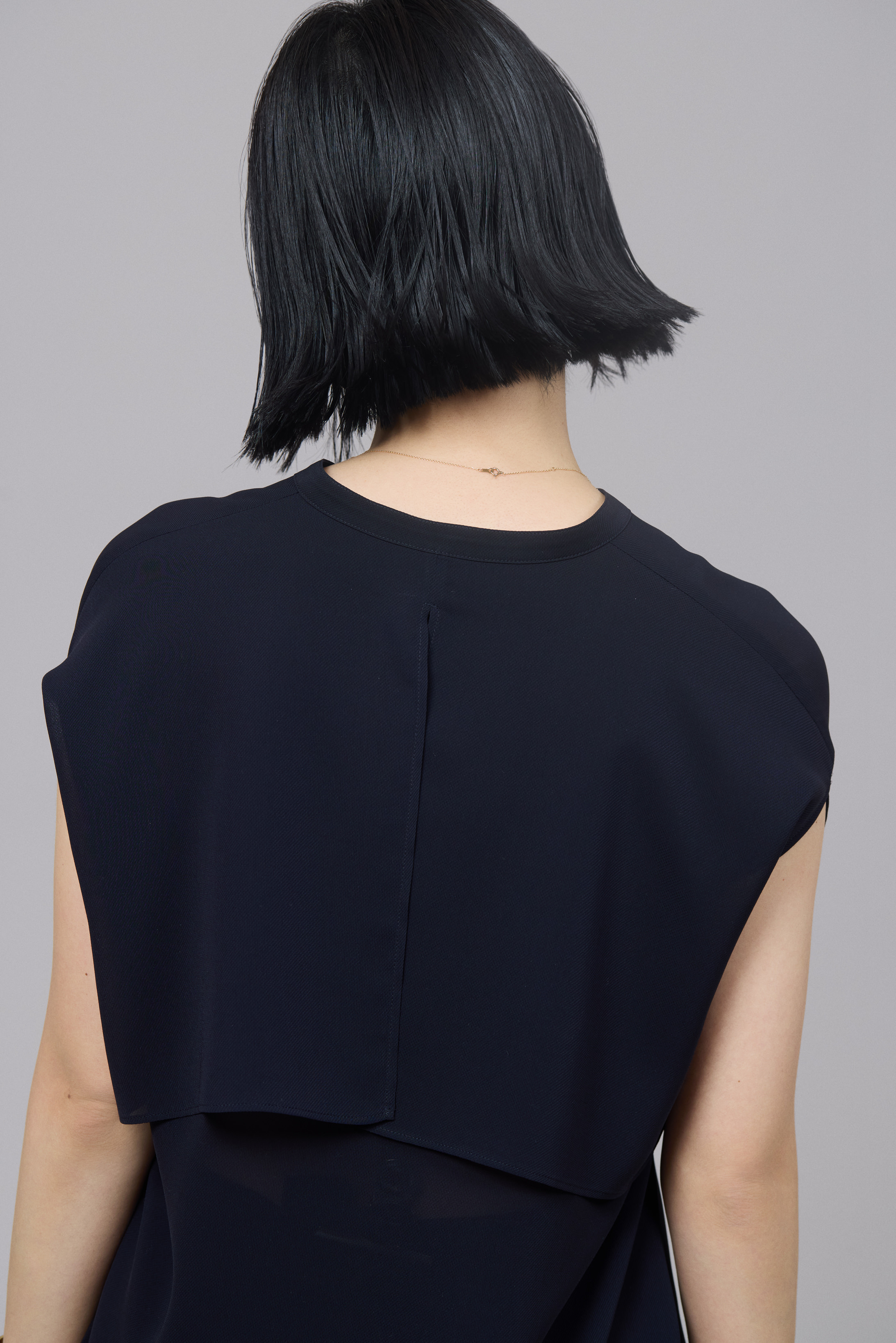 続いて濱本さんは、ネイビーが知的な印象漂う、上品な透け感のあるブラウスをセレクト。シンプルなスタンドネックのロングスリーブブラウスだが、濱本さんはバックのアームホールから腕を出して袖を結び、ノースリーブトップのような着こなしを提案。合わせたシルクサテンのパンツは、ツヤ感とソフトな風合いが特長だ。「パンツは、美しくストンと落ちるシルエット。リラックスした履き心地ですが、きれいめに着こなせるのが魅力」。ジュエリーはネイビーと好相性のゴールドで統一。ここでも濱本さんらしく、存在感のあるアイテム同士をコーディネイト。「服が柔らかい印象やシンプルな時は、ジュエリーで強さが出るものを加えるのがマイルール。逆に、服の印象が強い時には、ジュエリーの主張を少し抑えるようにして、自分らしいスタイルを心がけています」。オリジナリティあふれる服とジュエリーとのバランスで、媚びないけれどしなやかなハンサムスタイルが完成。