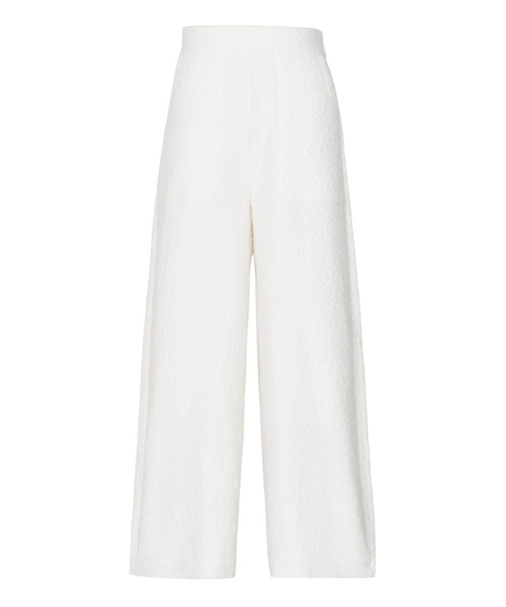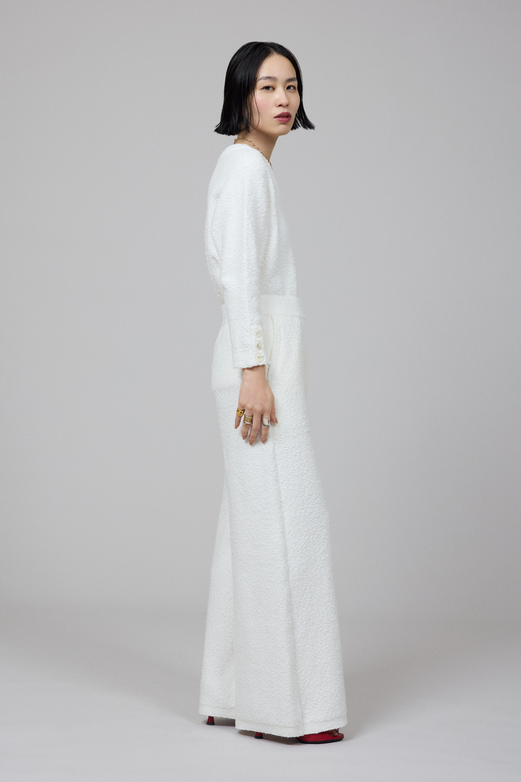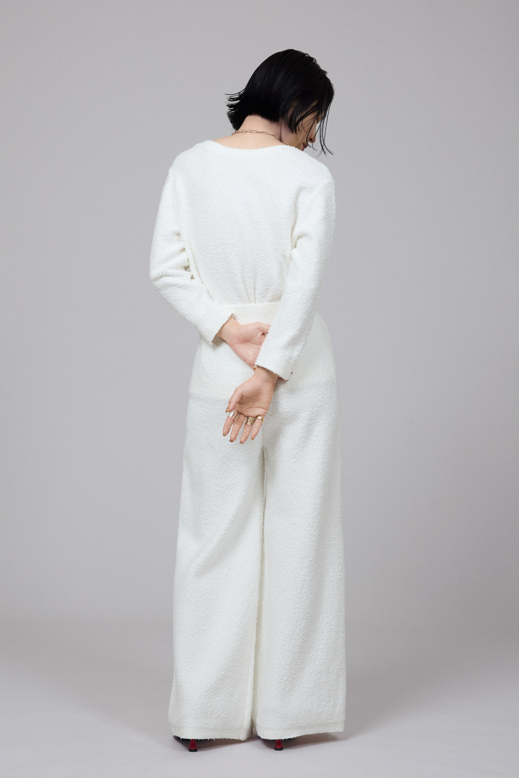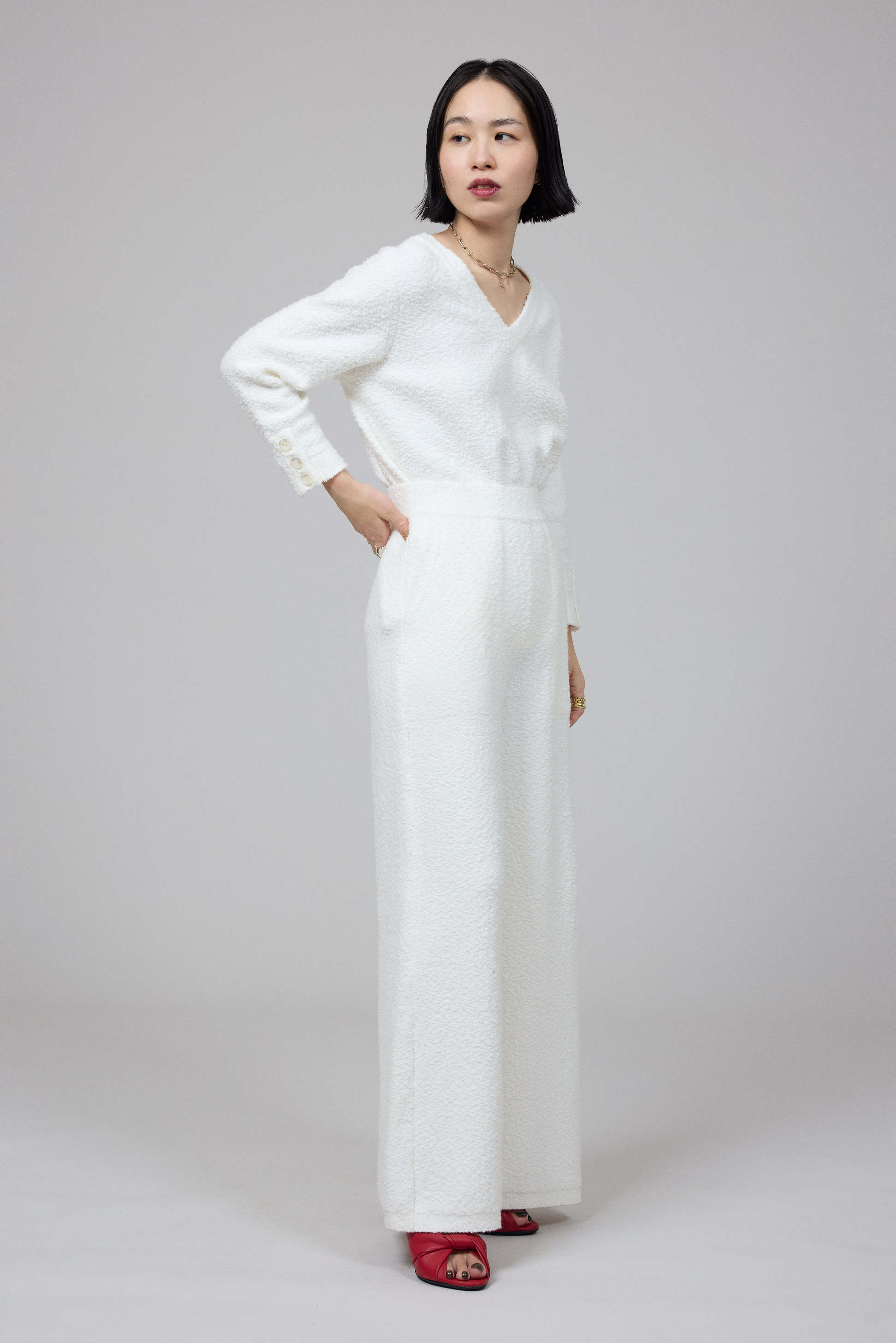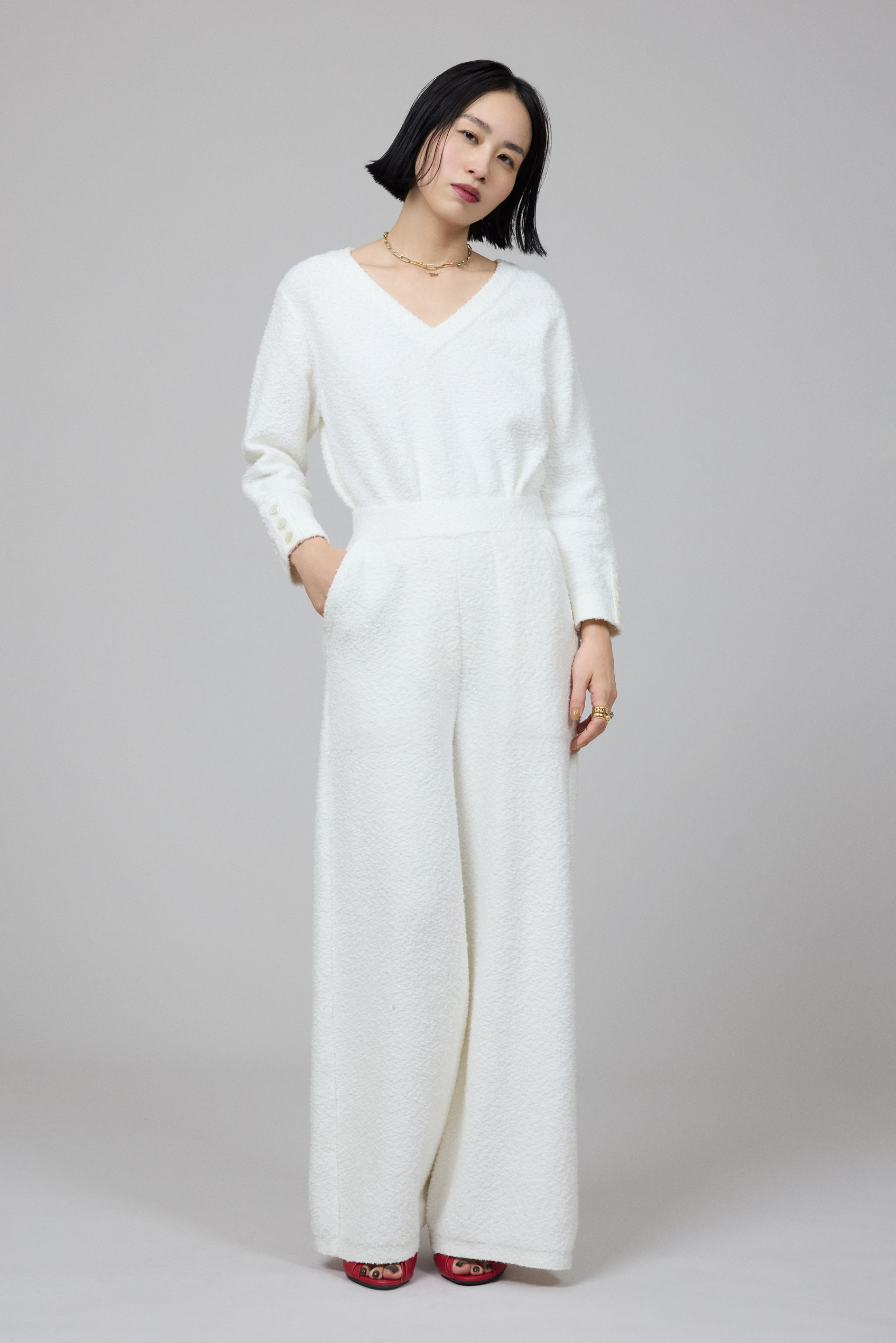 柔らかくなめらかな肌触りが魅力のコットンリングヤーン素材のプルオーバーとパンツのセットアップ。「ふわふわで包み込まれているみたい!ほどよいストレッチ性があるので、ルーズにならずに素肌に優しくフィットします。リラックス感のある素材ですが、ラインが綺麗なのでカジュアルになり過ぎないのもいいですね」。プルオーバーはオケージョンや気分に合わせて前後どちらでも着用できる2WAY仕様。濱本さんはVネックとして着用しデコルテ見せをポイントにした。「デコルテは自分でも好きなパーツ。素肌をアクセサリー感覚で見せて、パイル地の素材感を引き立ててみました。その分、ネックレスは控えめにしています」。トップをボトムにインしてよりスタイリッシュなムードに。白に映える赤のヒールサンダルで、コーディネイトに艶やかなメリハリが生まれた。