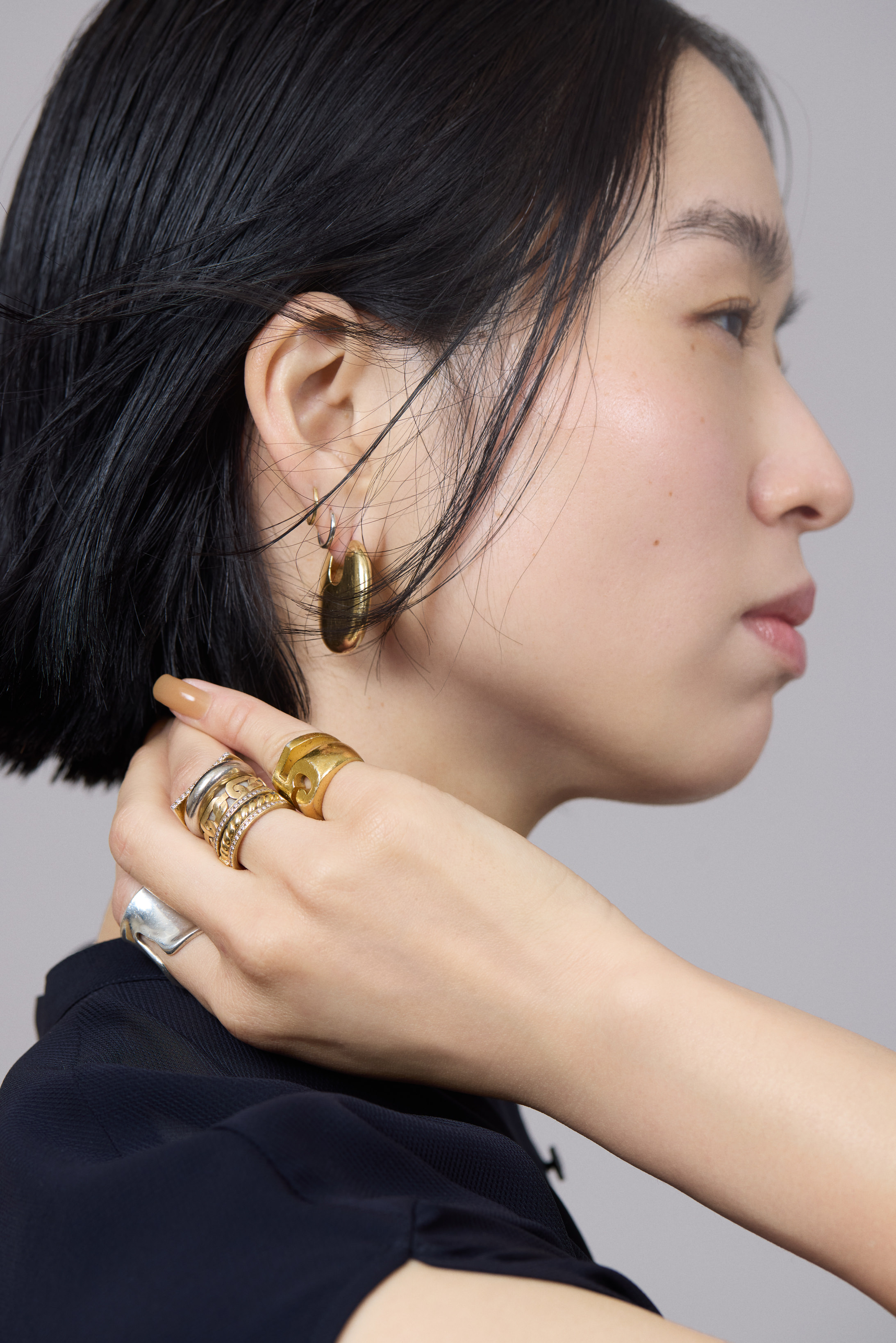 デコルテをさり気なく飾るのは、お気に入りのチェーンネックレスと昨年出産した愛娘の名前のイニシャルが刻まれた華奢なネックレス。控えめな首もとに反して、リングには濱本さんらしい"盛り"が全開。「リングがないと自分らしくなくなってしまうので、いつも通りたくさん重ね付けしています。でも実は、オフの日はリングはまったく付けないんですよ。手もとのおしゃれがオンとオフのスイッチになっています」。