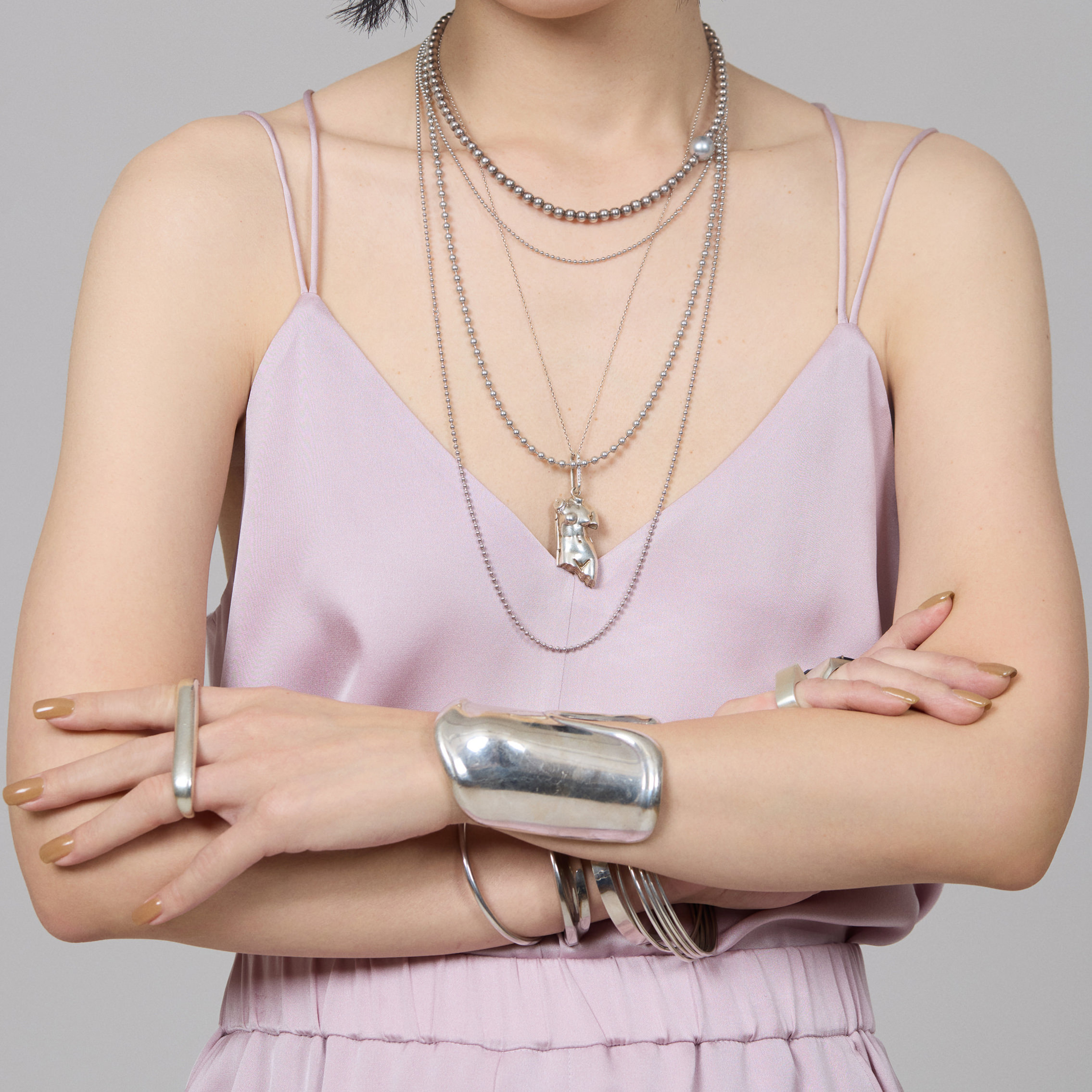 ジュエリー使いに定評のある濱本さん。ピンクがもつ柔らかい印象も、シルバーのジュエリーを多用してクールに仕上げた。「存在感あるもの同士を重ね付けするのが好きです。今回は私にとってチャレンジングな色だったからこそ、自分らしいハードな感じをスタイルに盛り込みたくて、ごつめのカフを投入したりと、ジュエリーは全部シルバーで統一。強さや無骨さも漂うスタイリングを意識しました」