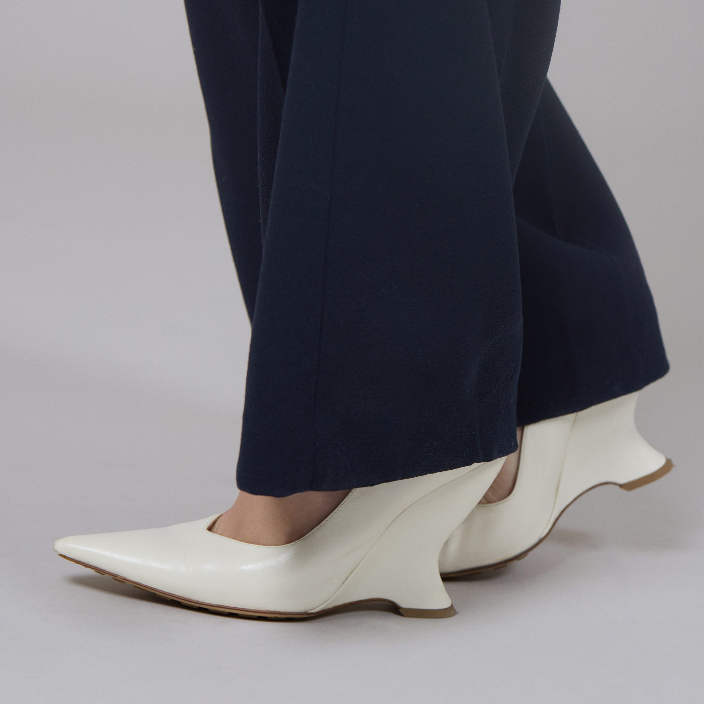ネイビーのコーディネイトをより洗練された印象に仕上げるのが、ホワイトのパンプス。「足もとがブラックだと全体的に沈んだ印象になってしまうので、白でライトな華やかさをプラスしました。スタイリングにピリッとした緊張感を持たせるのが好きなので、ポインテッドトゥのシューズは出番の多いアイテム。ケアが大変ですが、私のワードローブに欠かせません」