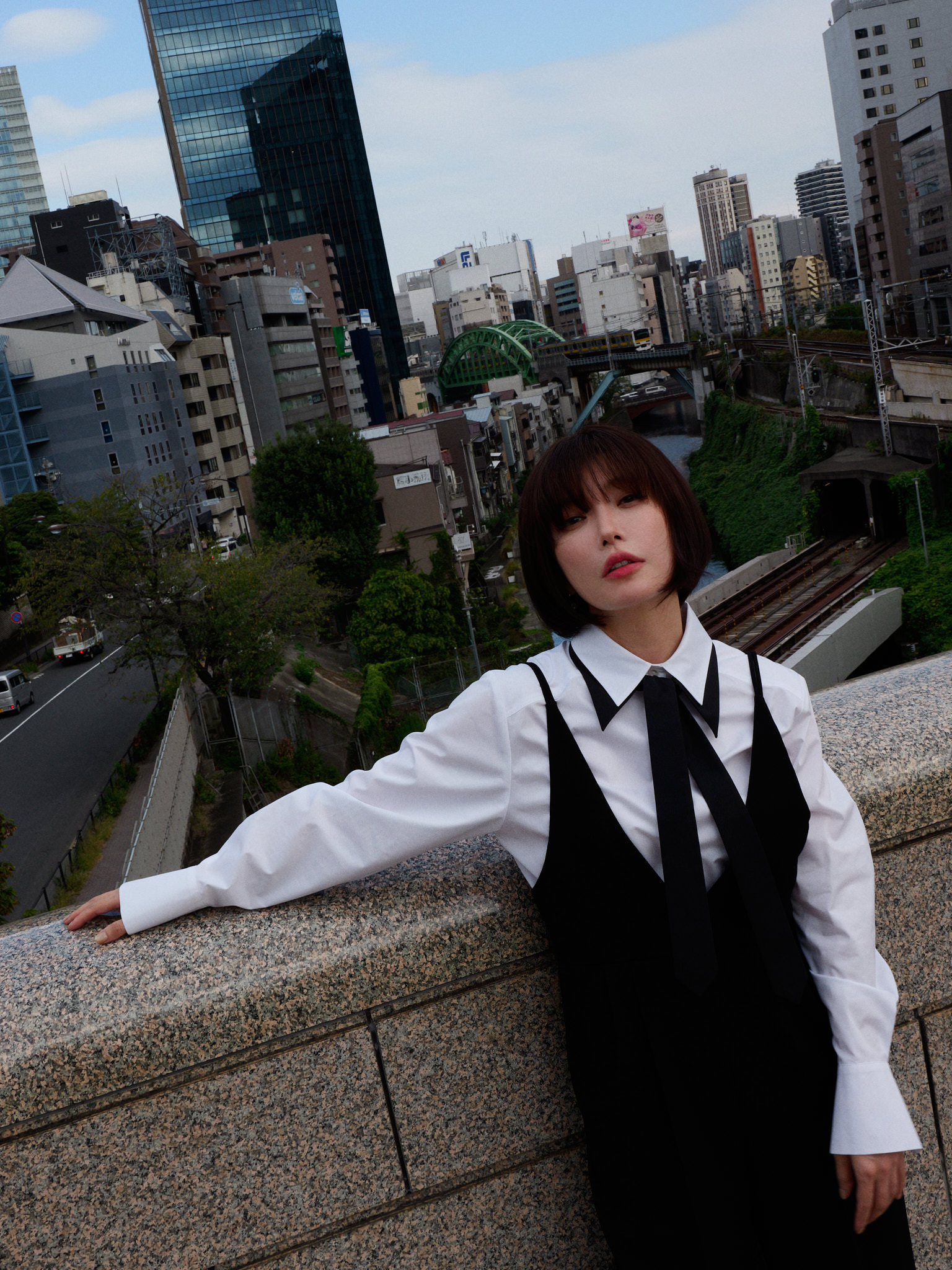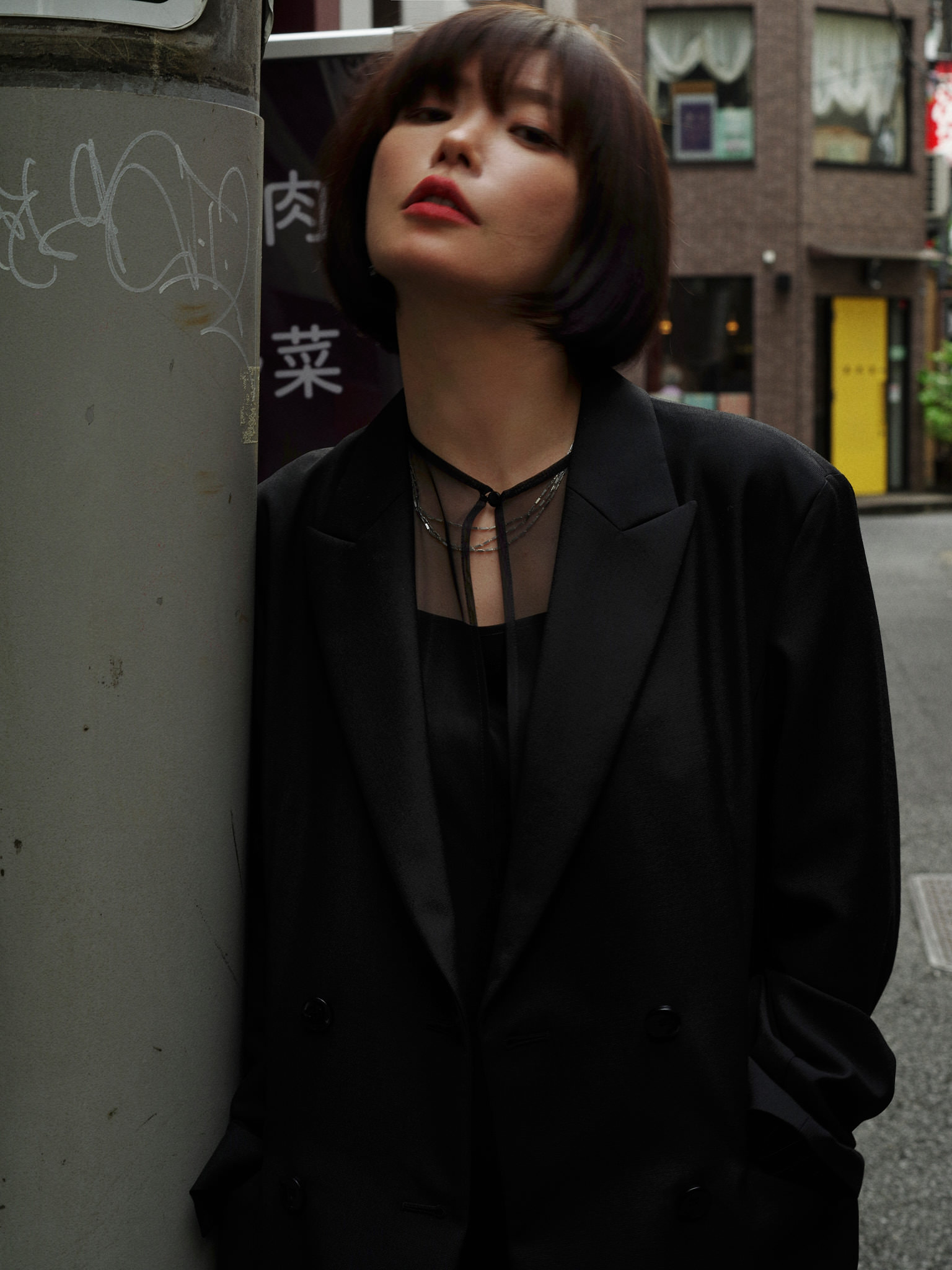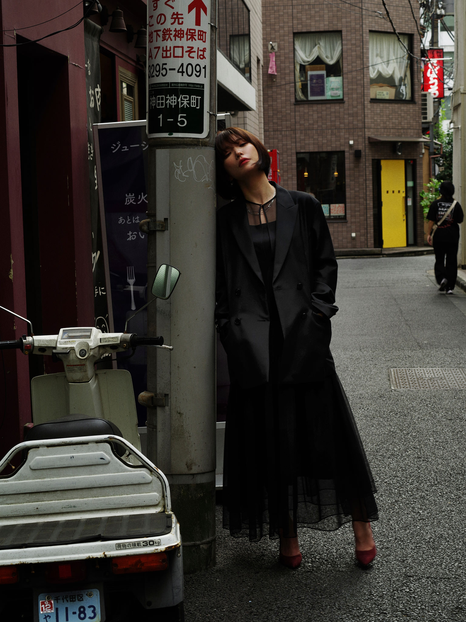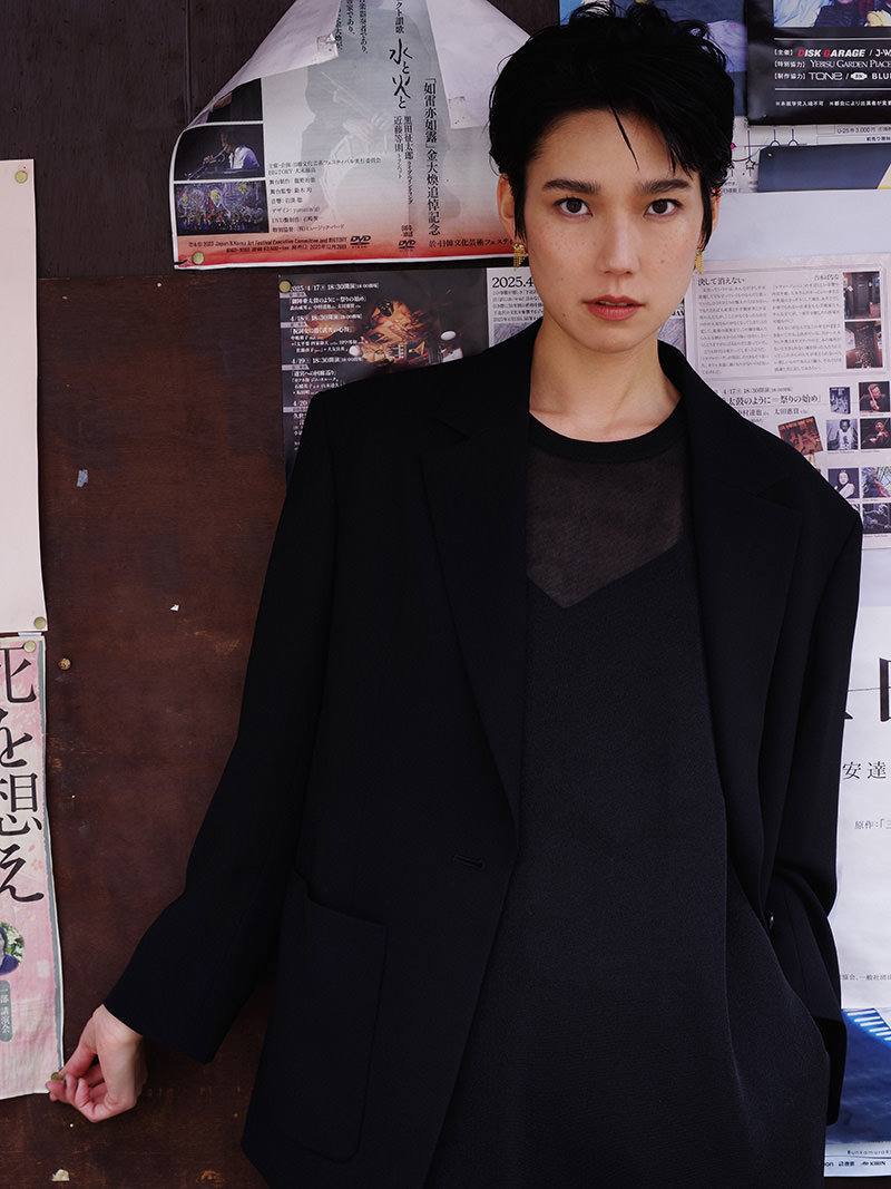撮影の日に着用したのは、テーラリングやものづくりの背景にまでしっかりとこだわるSA VILLE / SA VIEのドレスやシャツ、ジャケット。「どれも形がきちんとしているのに緊張しすぎない。軽さも絶妙で、普段着として自然に着られるのがいいですね」と、川上さん。ジャケットにドレスを合わせたオールブラックのスタイルは、「ボリュームのあるものにレーシーな素材を合わせると、普段着でも特別な感覚になる。服を通して、自分の知らなかった一面に出会えるんです。いい服の条件って、知らなかった自分の一面を発見することだと思います」と、話してくれた。