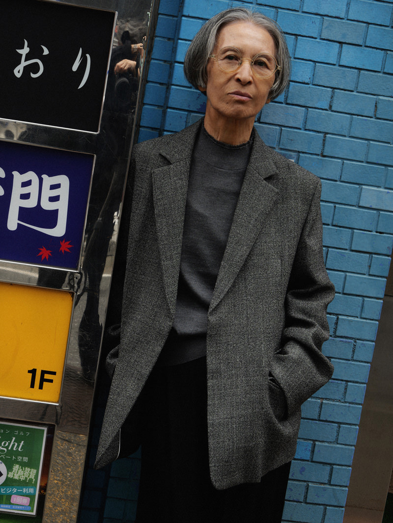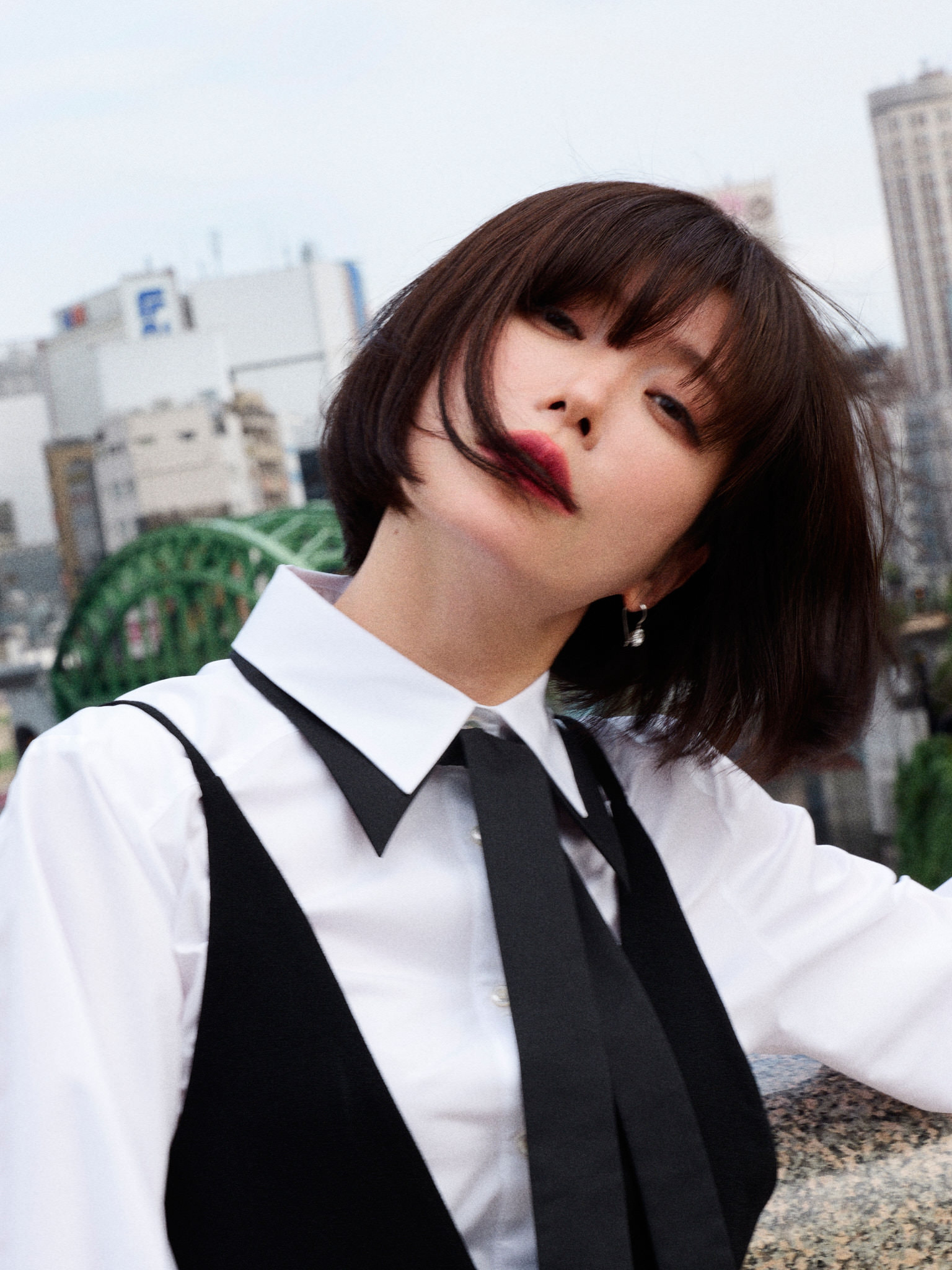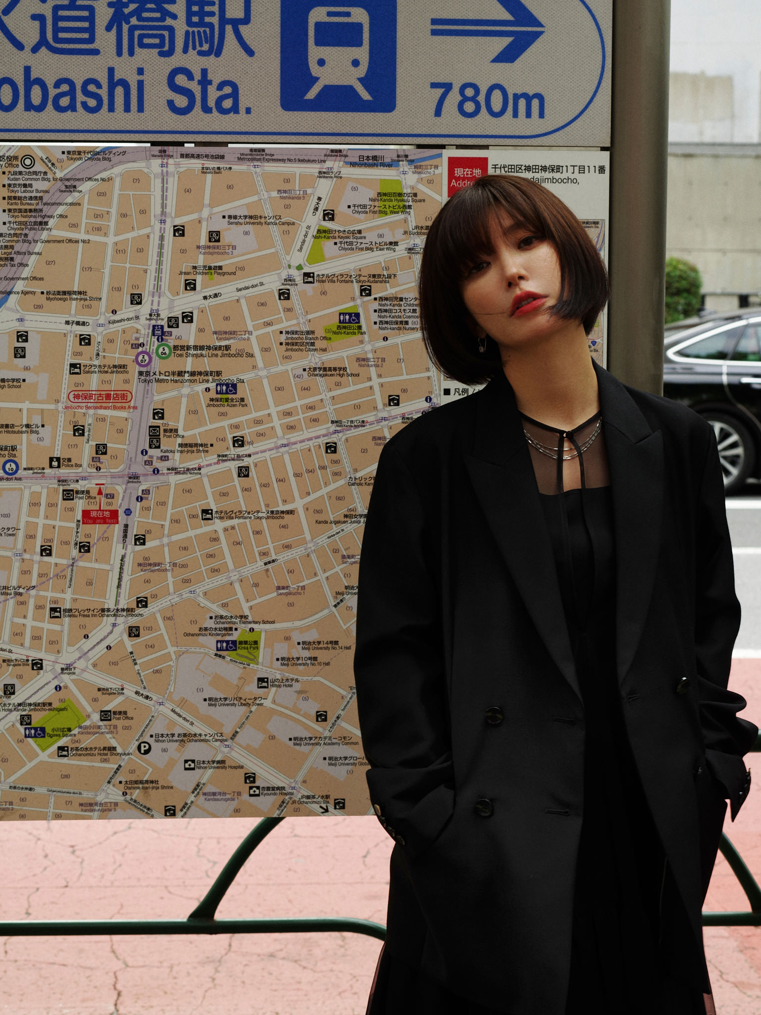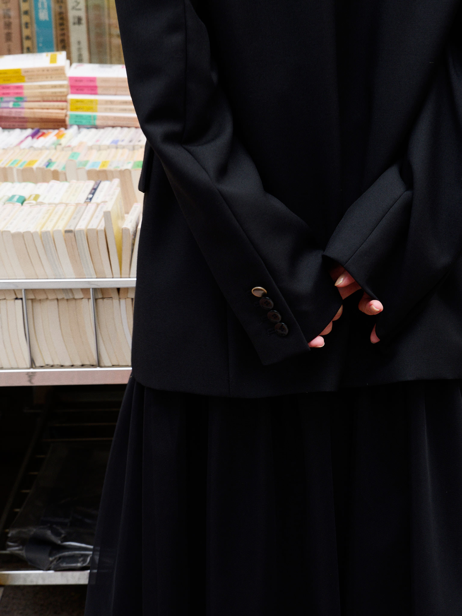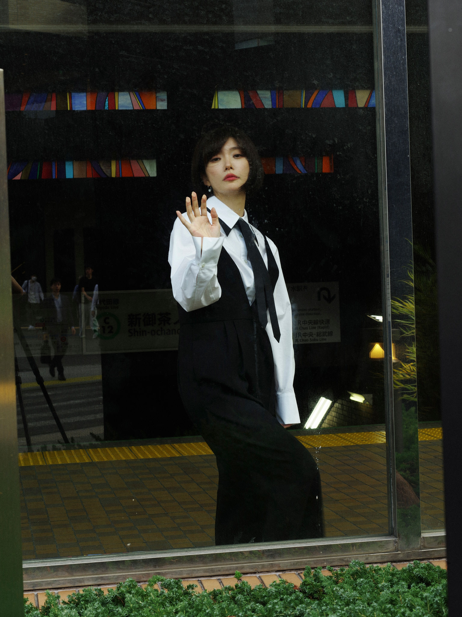 撮影の日に着用したのは、テーラリングやものづくりの背景にまでしっかりとこだわるSA VILLE / SA VIEのドレスやシャツ、ジャケット。「どれも形がきちんとしているのに緊張しすぎない。軽さも絶妙で、普段着として自然に着られるのがいいですね」と、川上さん。ジャケットにドレスを合わせたオールブラックのスタイルは、「ボリュームのあるものにレーシーな素材を合わせると、普段着でも特別な感覚になる。服を通して、自分の知らなかった一面に出会えるんです。いい服の条件って、知らなかった自分の一面を発見することだと思います」と、話してくれた。